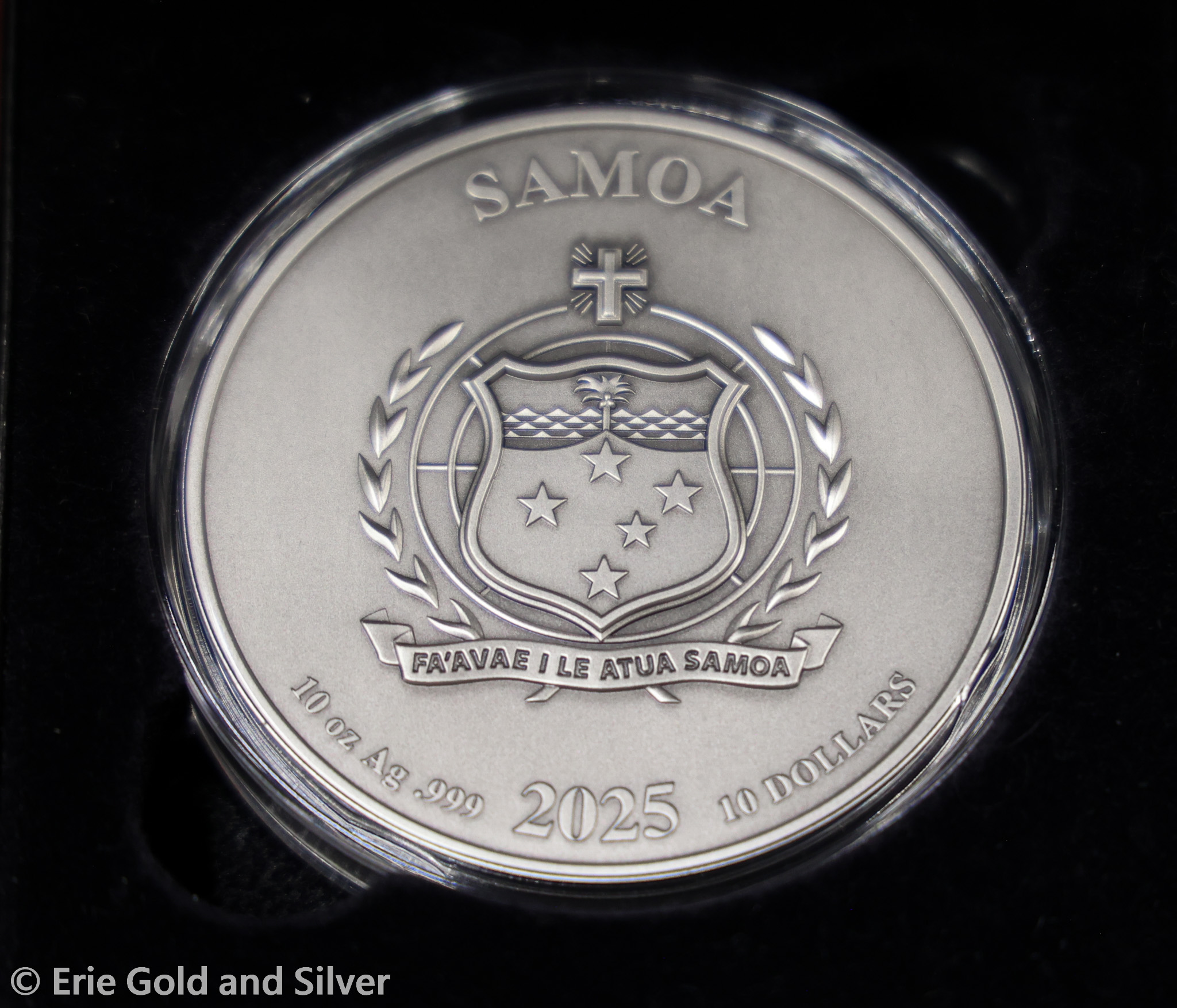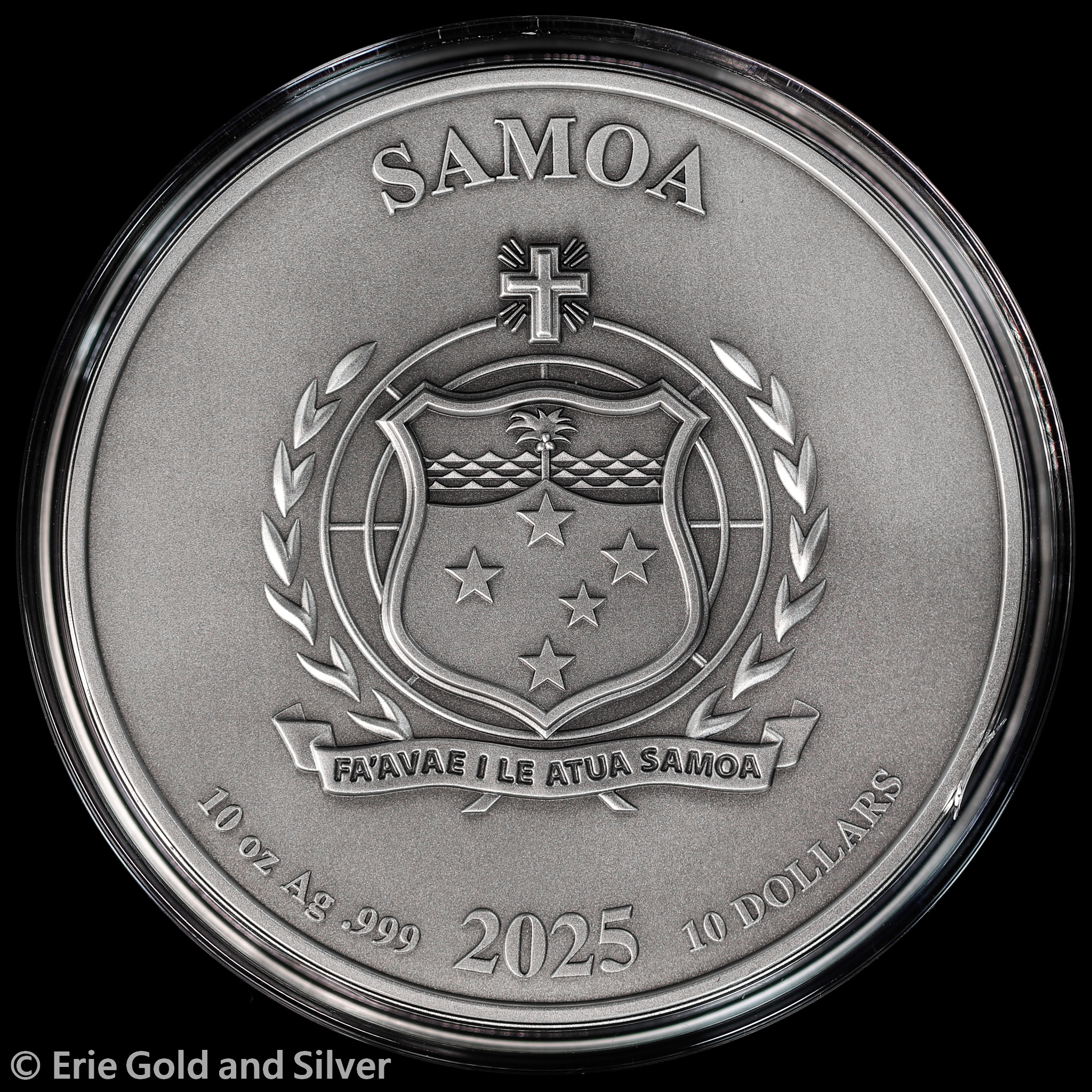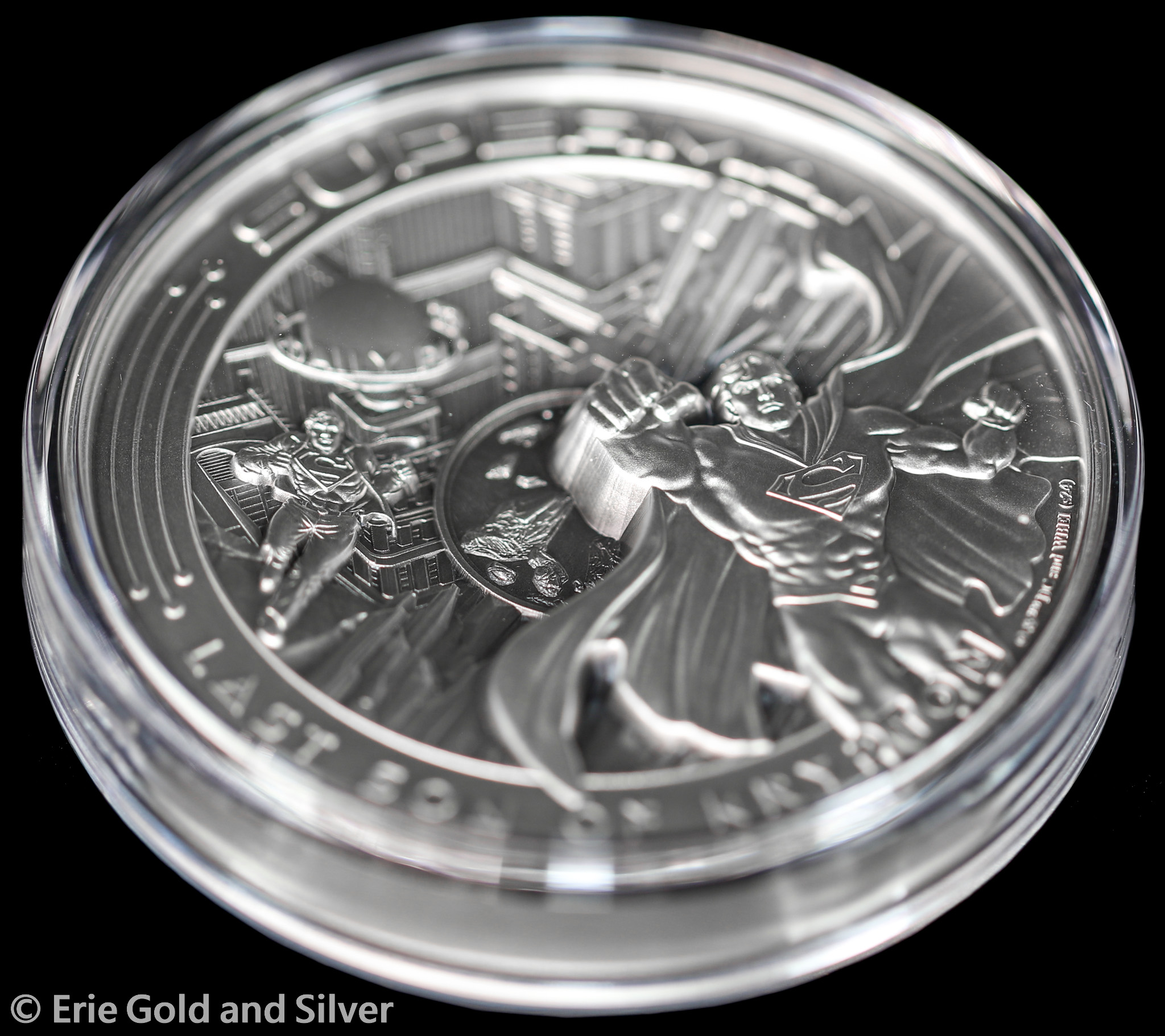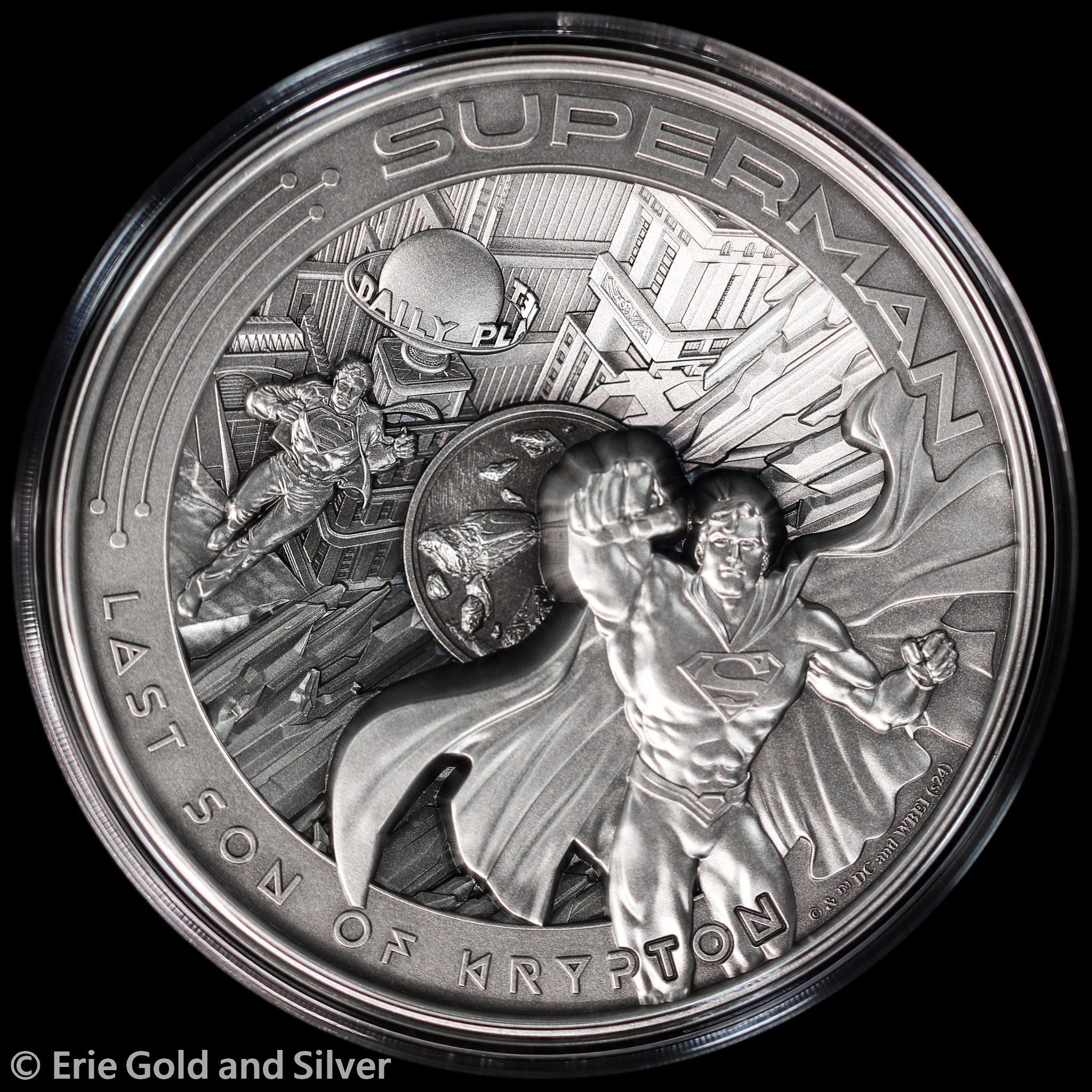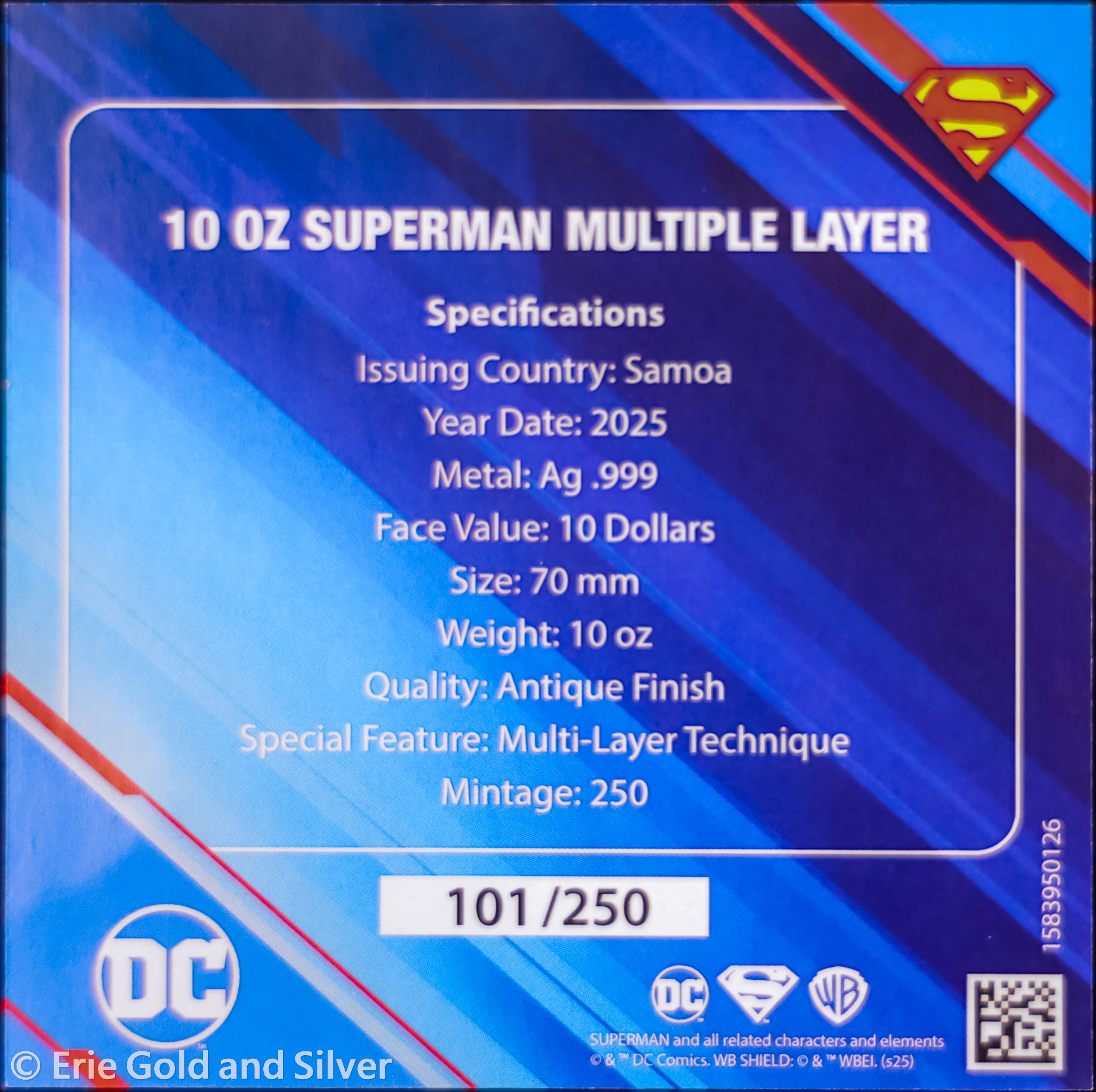 For sale is a 2025 $10 Samoa Superman Multiple Layer 10 oz Silver Antiqued Coin in OGP.