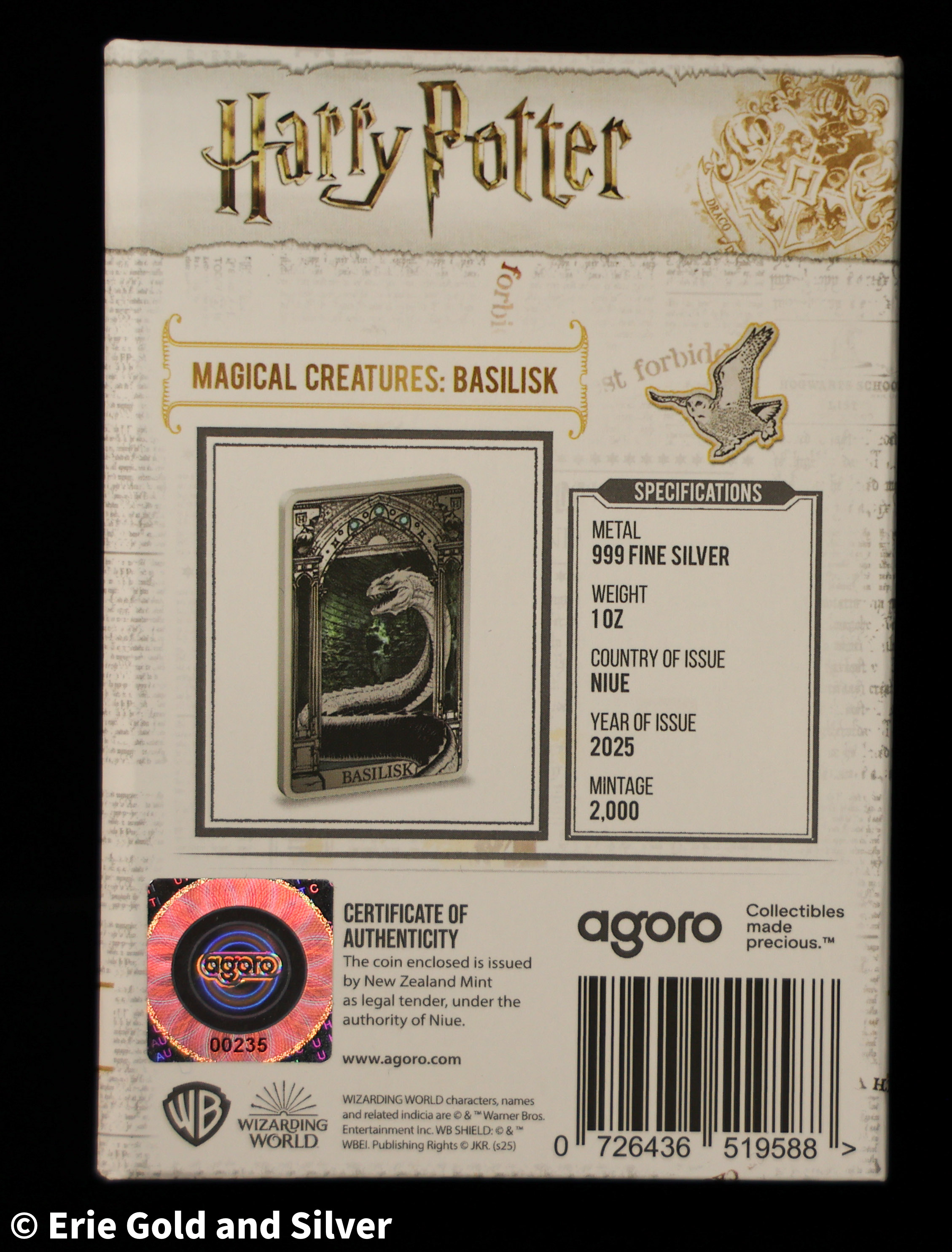 Unlock the Chamber of Secrets with the 2025 $2 Niue Harry Potter Magical Creatures: Basilisk 1 oz Silver Coin. Struck in 1 troy ounce of .999 fine silver, this officially licensed coin captures the terrifying serpent in vivid detail. As part of the Magical Creatures series from Niue, it’s a chilling addition for Harry Potter fans and silver collectors alike—just don’t look it in the eyes.
