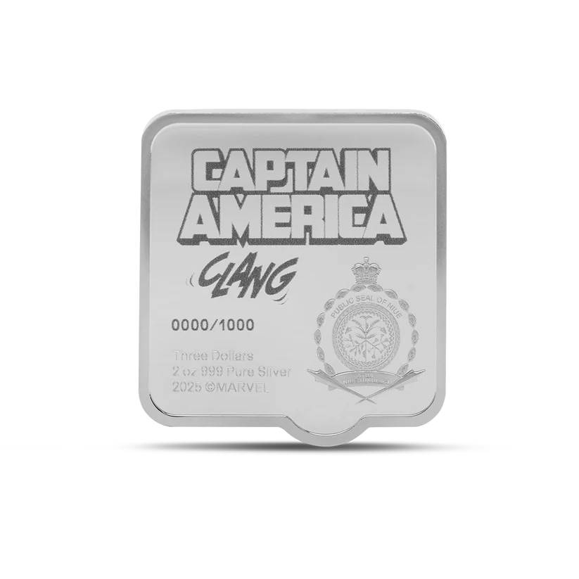 Feel the impact of justice with the 2025 $3 Niue Marvel “Clang” Captain America silver coin! Struck from 2 oz of .999 fine silver, this officially licensed release features dynamic comic-style artwork of Cap mid-battle—his iconic shield in action as the word “CLANG” bursts across the design. A thrilling part of the Marvel “Smash” or onomatopoeia-style series, this coin blends superhero energy with premium silver craftsmanship. Presented in Original Government Packaging, it’s a must-have for Marvel fans, comic collectors, and pop culture stackers alike.