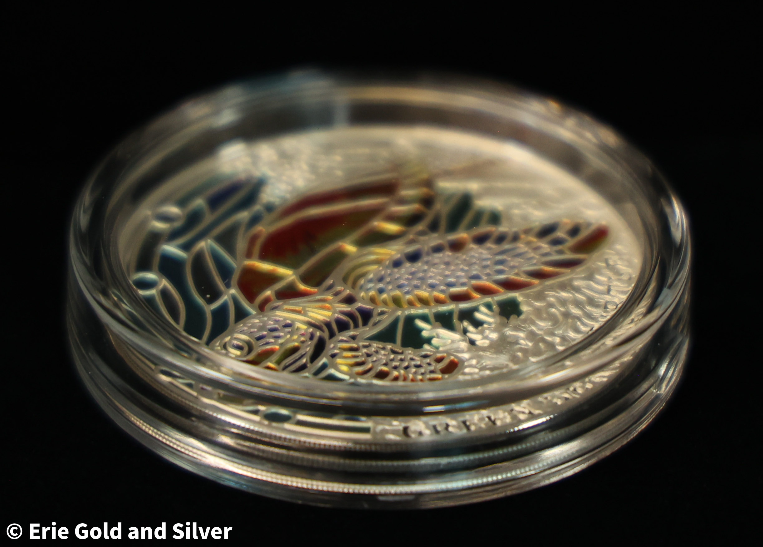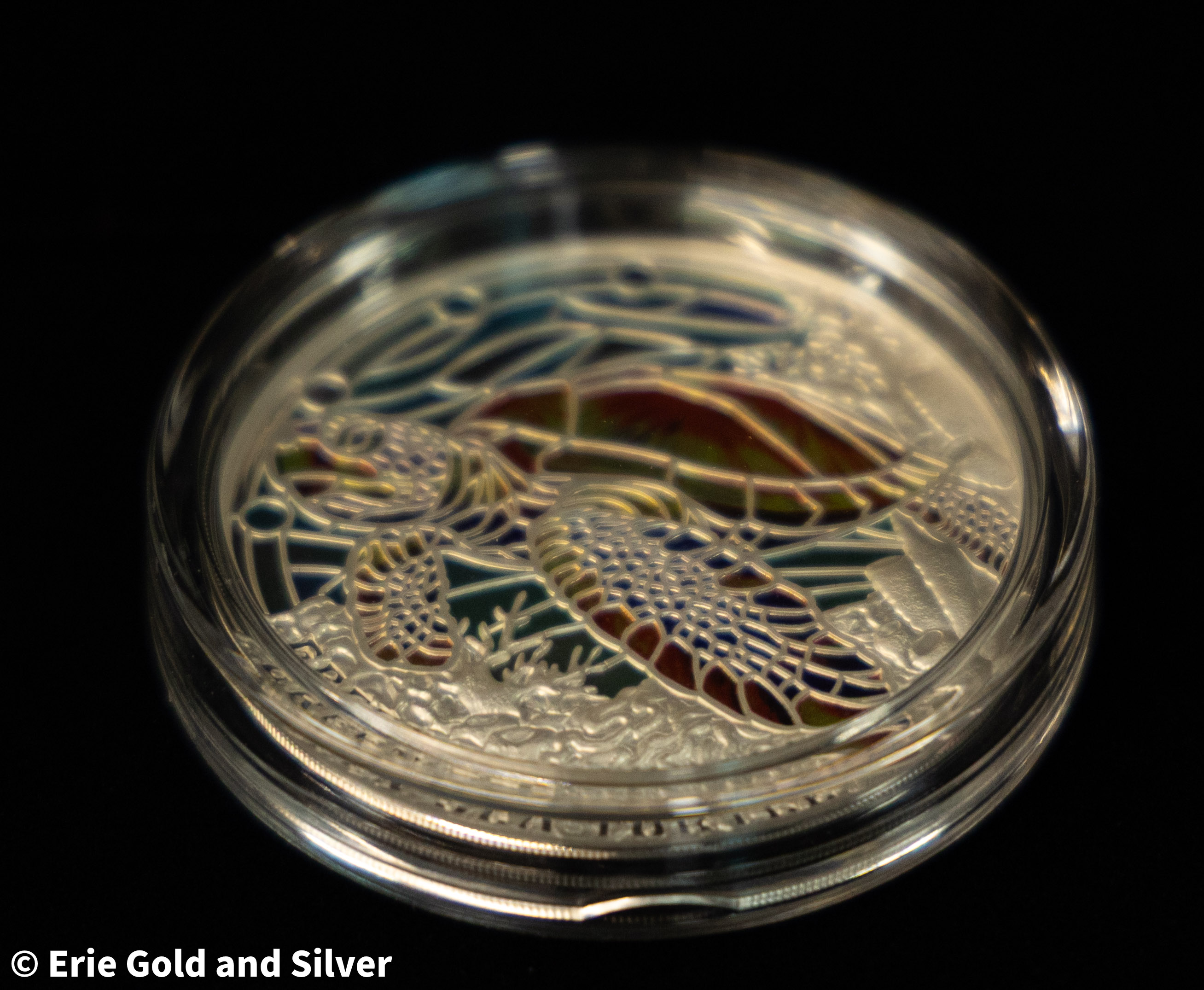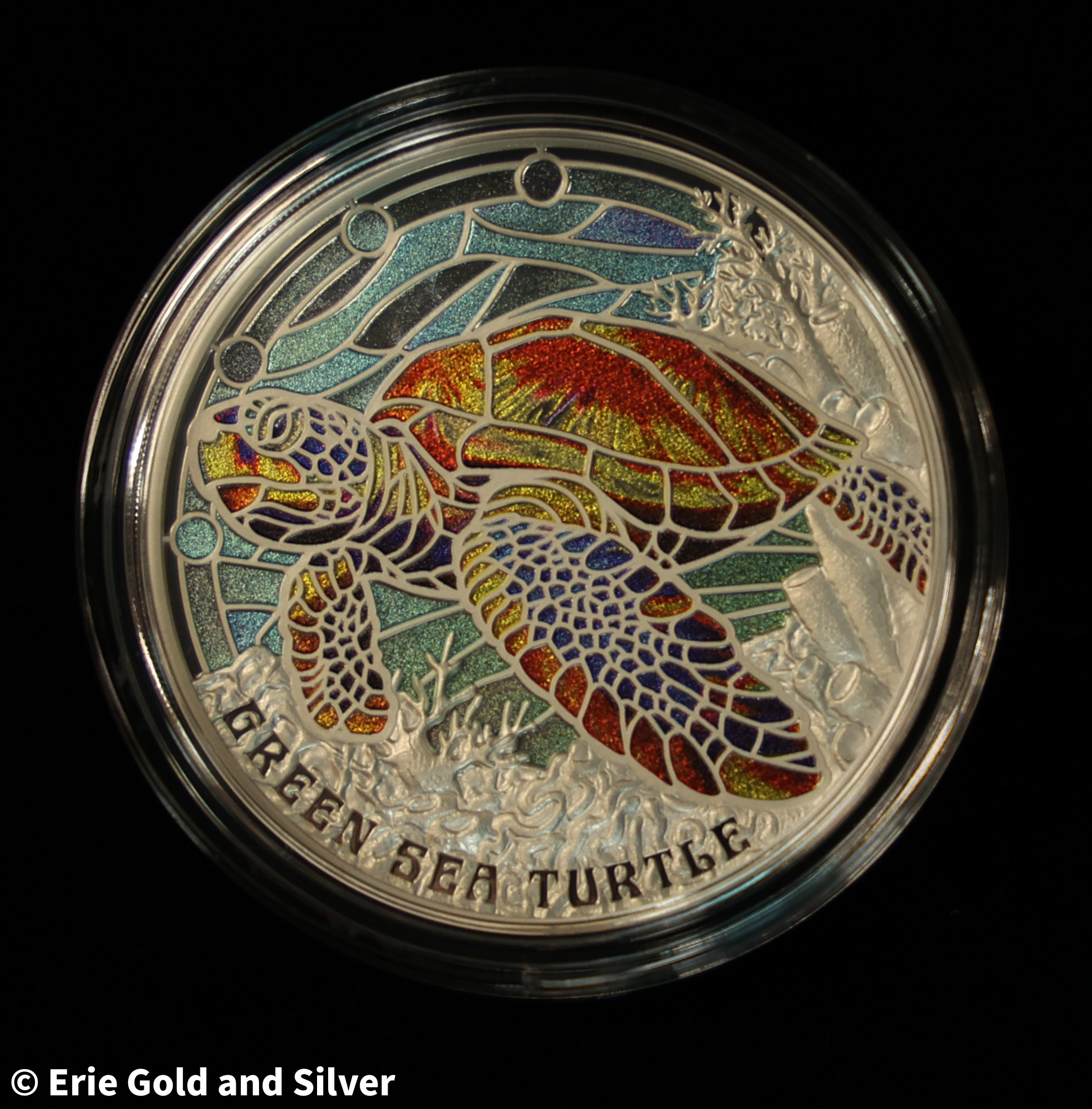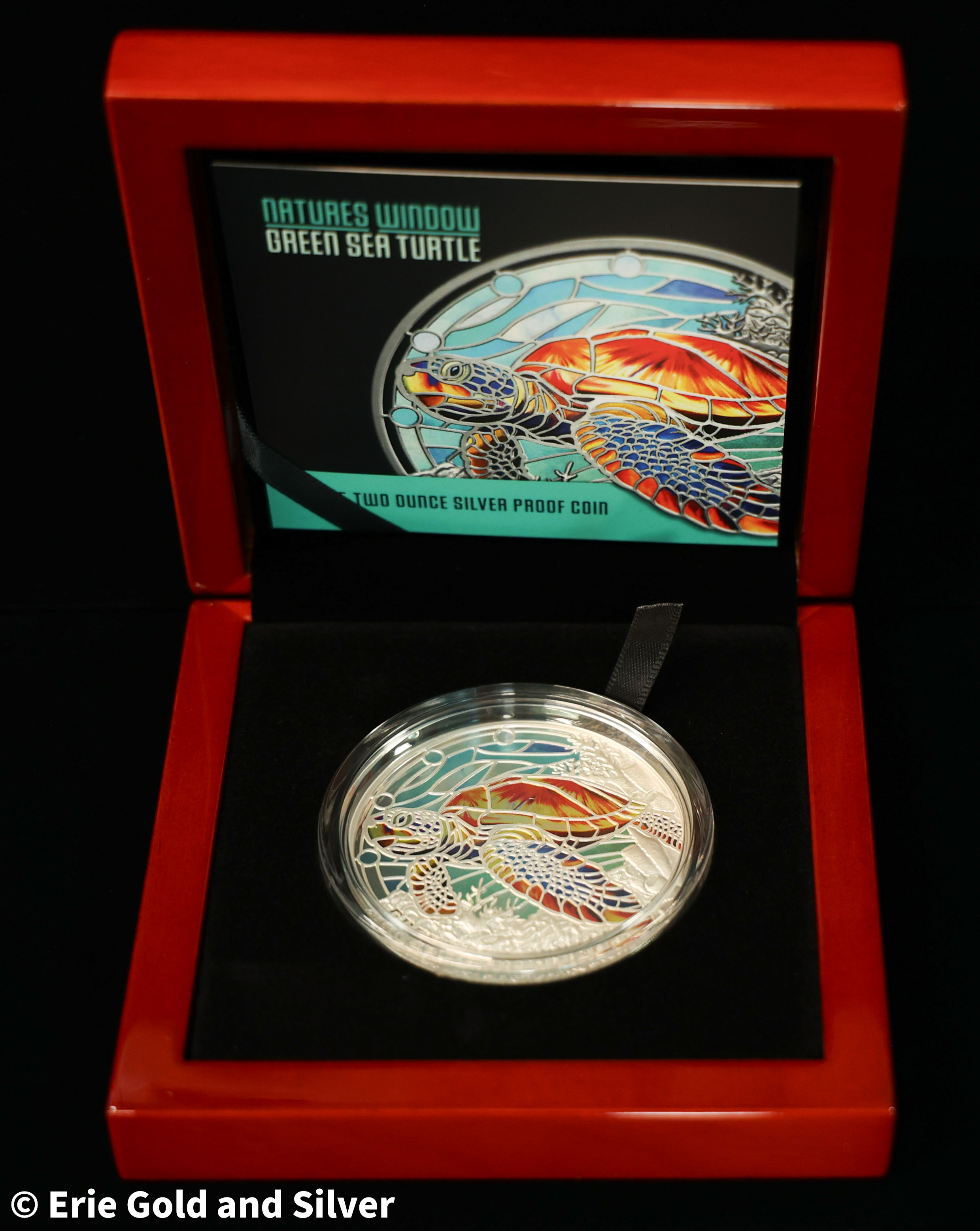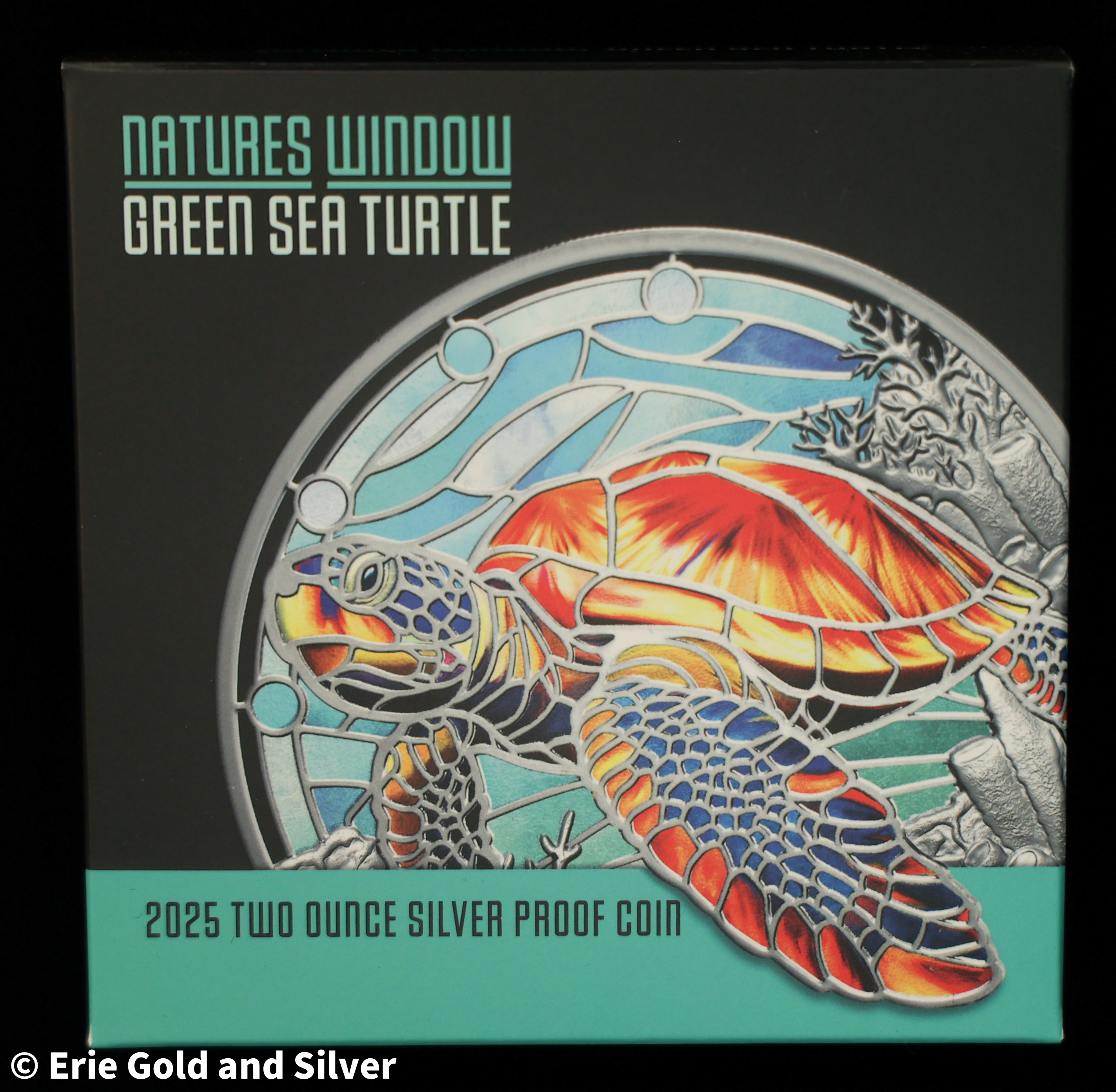 Dive into the beauty of the ocean with the 2025 $5 Niue Green Sea Turtle from the Nature’s Window series. Struck from 2 oz of .999 fine silver, this intricately designed coin features a lifelike image of the graceful green sea turtle, framed by a unique “window” cutout that enhances its visual depth. Combining artistic detail with a celebration of marine life, this limited-edition piece is a standout for wildlife lovers, eco-conscious collectors, and silver coin enthusiasts alike.