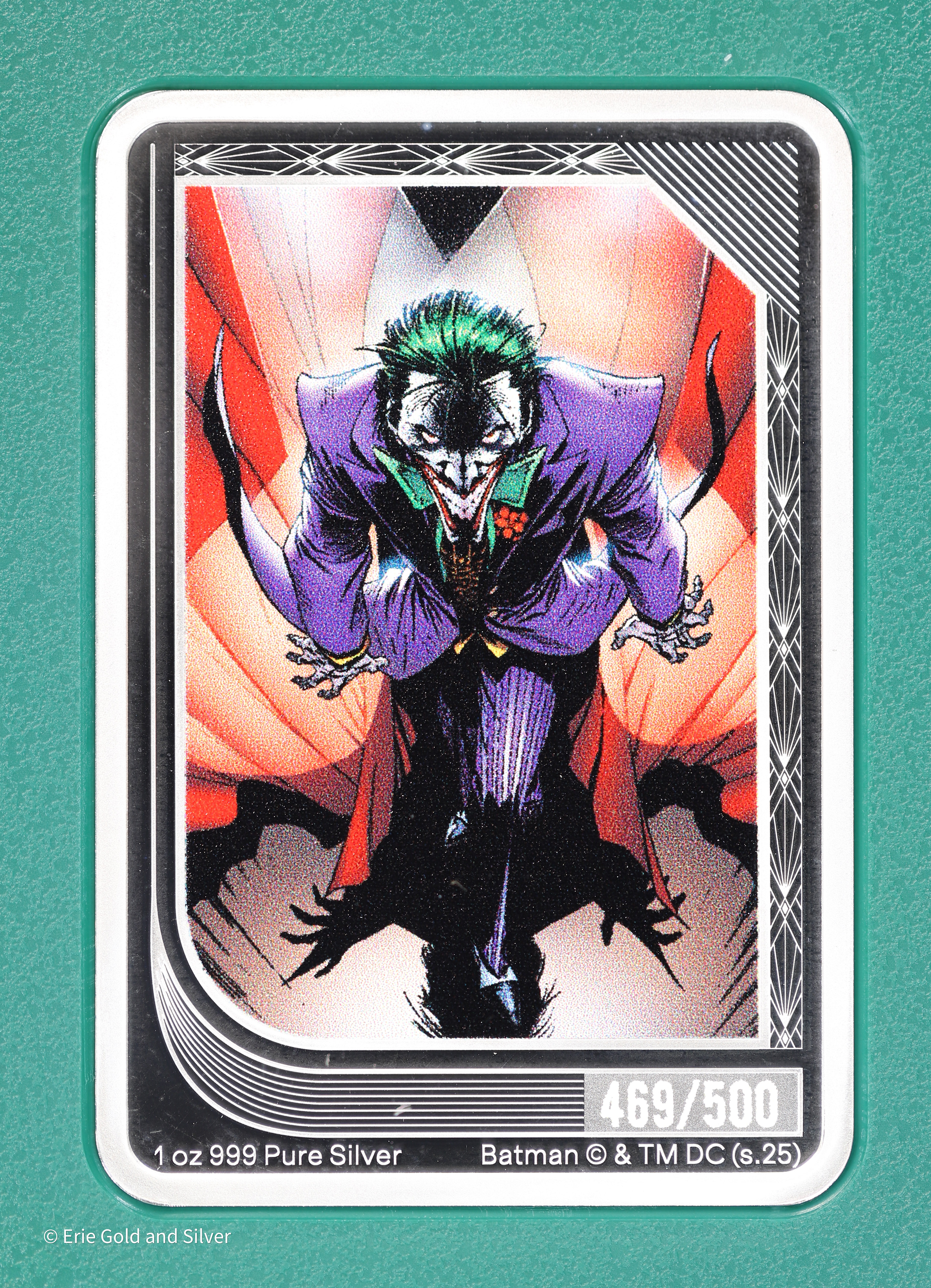 The 2025 Niue $2 The Joker Trading Card Emerald #469/500 is a 1 oz .999 silver coin shaped like a collectible card. Issued by Agoro, this vivid emerald edition is limited to just 500 pieces worldwide. Featuring striking artwork of the Clown Prince of Crime, it comes individually numbered and presented in premium packaging, making it a prized addition to any DC Comics collection.
