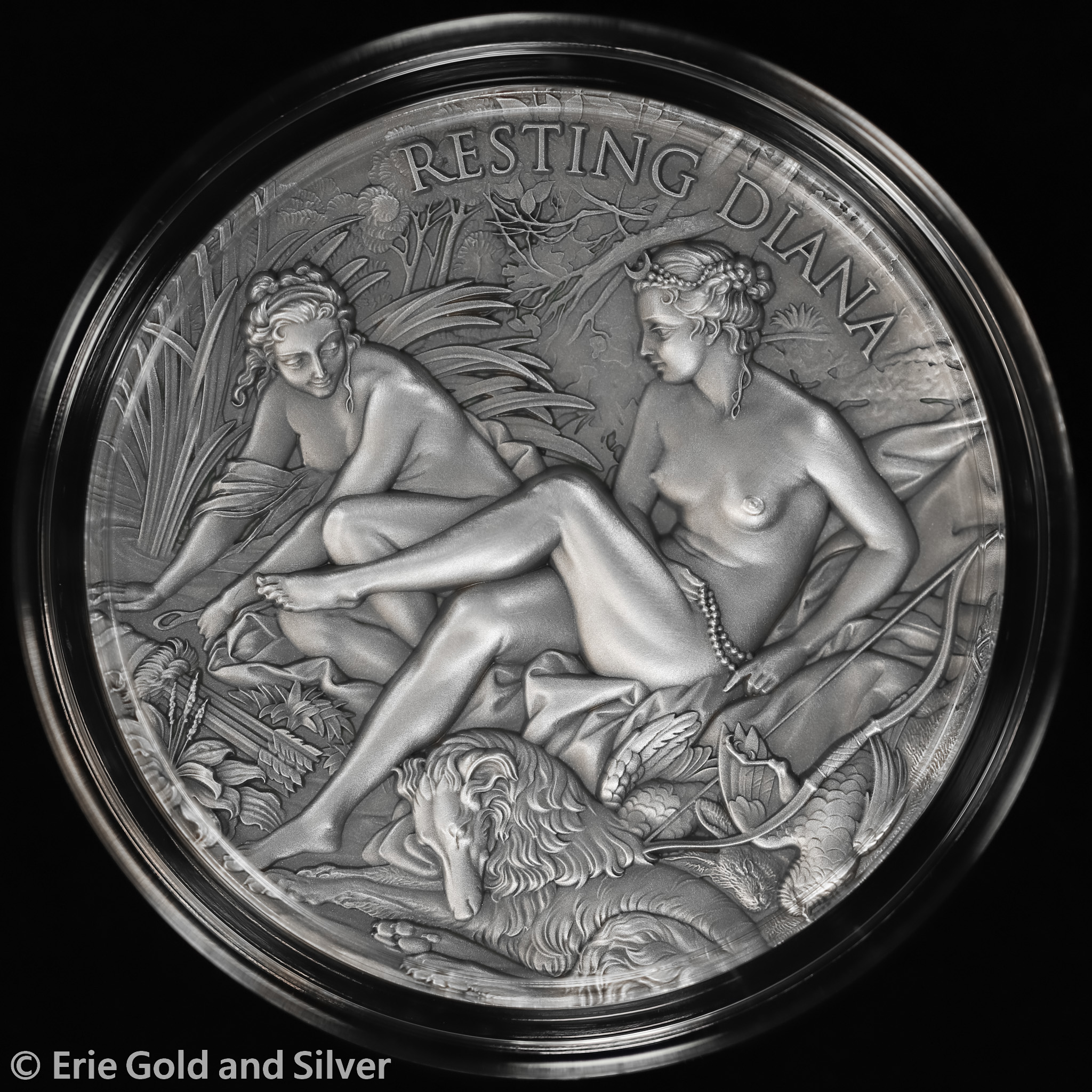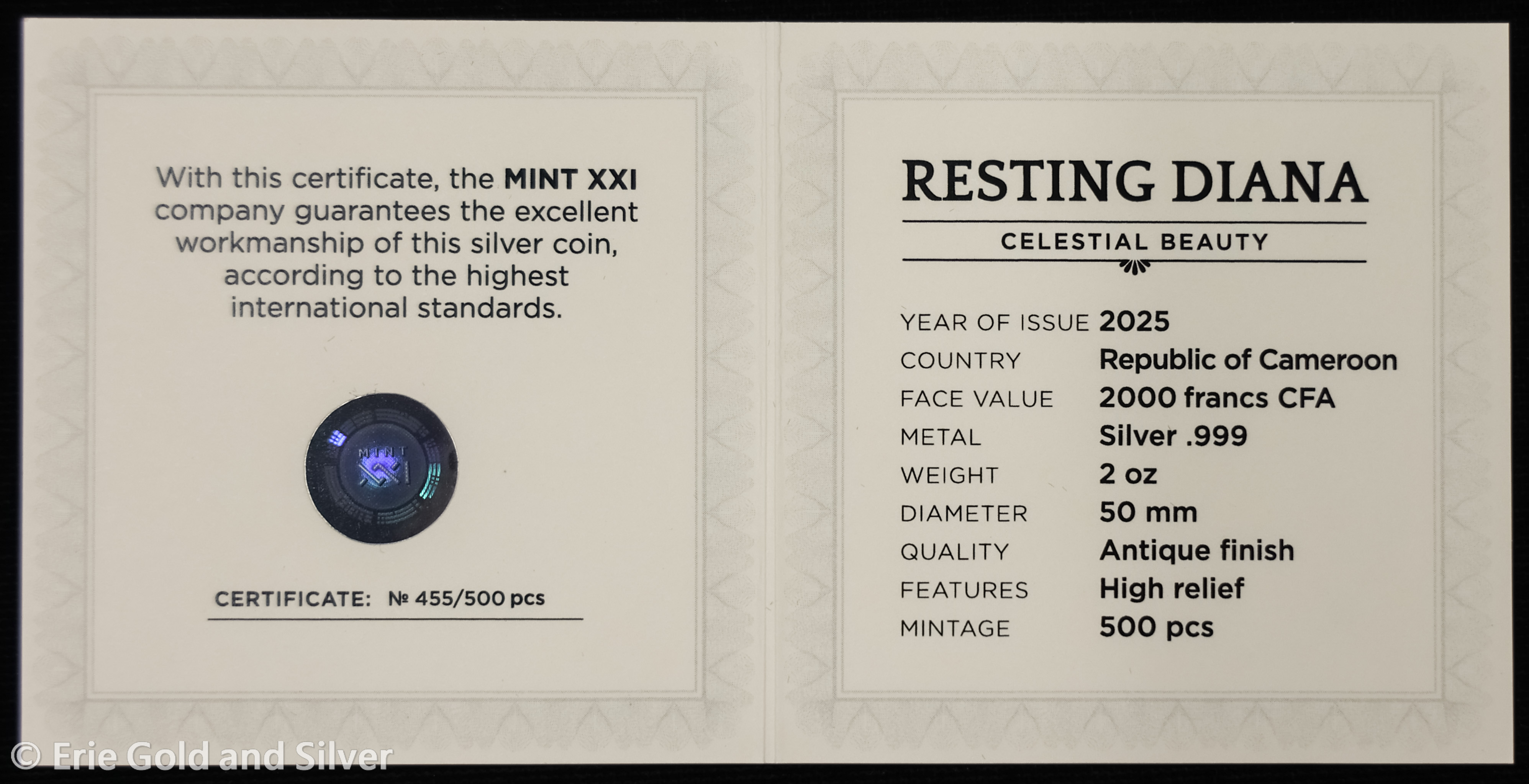 2025 Cameroon Celestial Beauty - Resting Diana 2 oz Silver Antiqued Coin in OGP