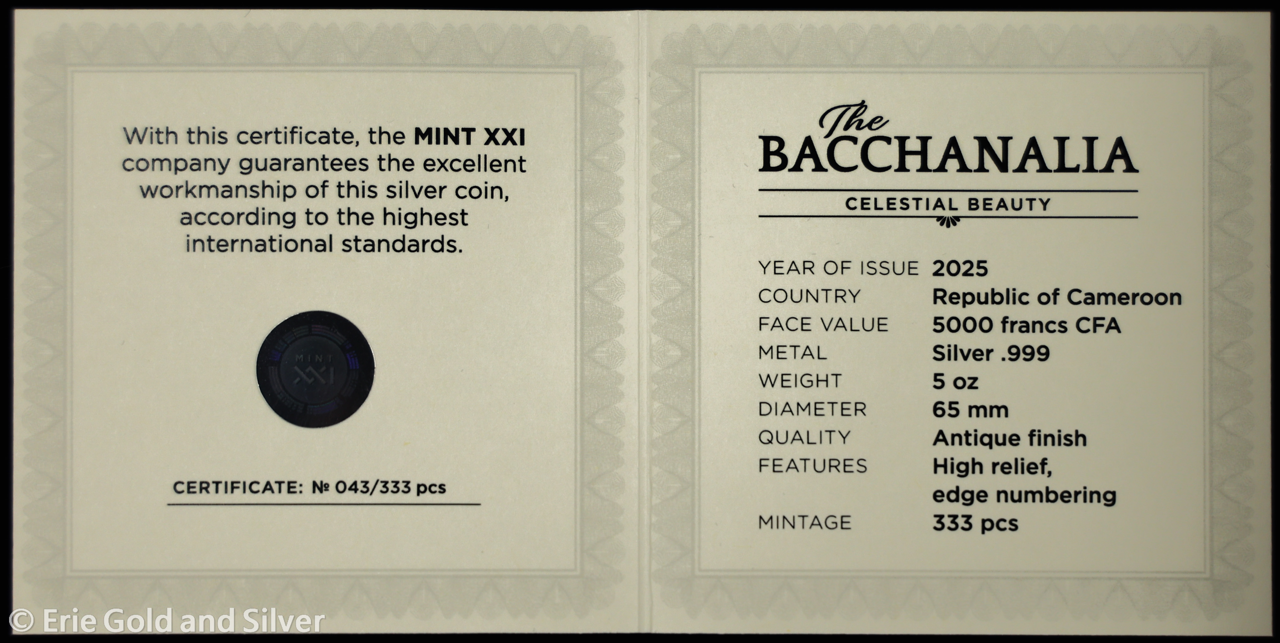 For sale is a 2025 Cameroon The Bacchanalia Celestial Beauty 5 oz Silver Antiqued Coin in OGP. View pictures for details and condition. There are multiple available, so the item you receive may not be the exact item pictured. However, it will be similar quality. Feel free to contact us with any questions.