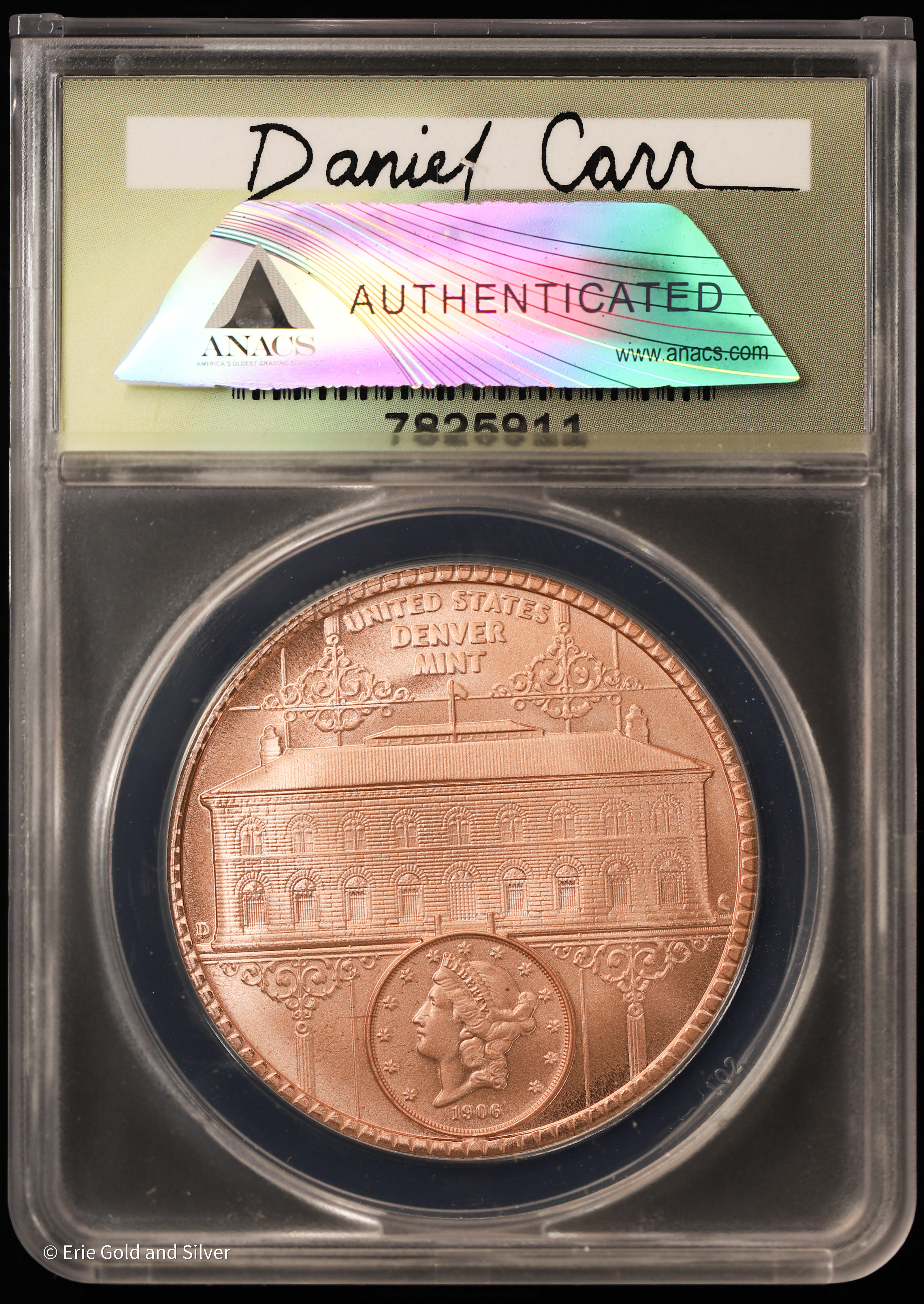For sale is a 2025 Dan Carr Lesher Use Copper for Industrial Prosperity "B" Medal. Graded / Certified by ANACS at MS 69 Red.