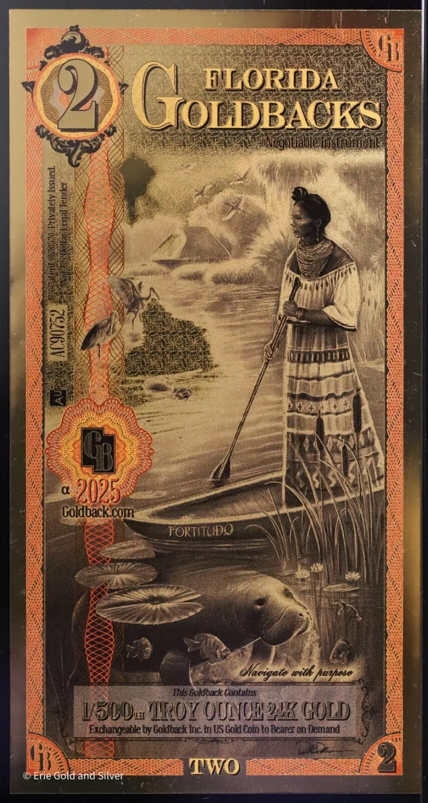The Florida Two Goldback honors Fortitudo—fortitude—as embodied by the Seminole people’s enduring strength, resilience, and cultural pride. A Seminole woman stands in a traditional canoe, navigating the Everglades with balance and purpose, surrounded by native wildlife and symbols of heritage like a chickee hut and patchwork dress. Each detail reflects generations of craftsmanship, environmental harmony, and the Tribe’s legacy of self-determination. Radiant Florida sunlight ties it all together, celebrating the spirit of the Sunshine State.