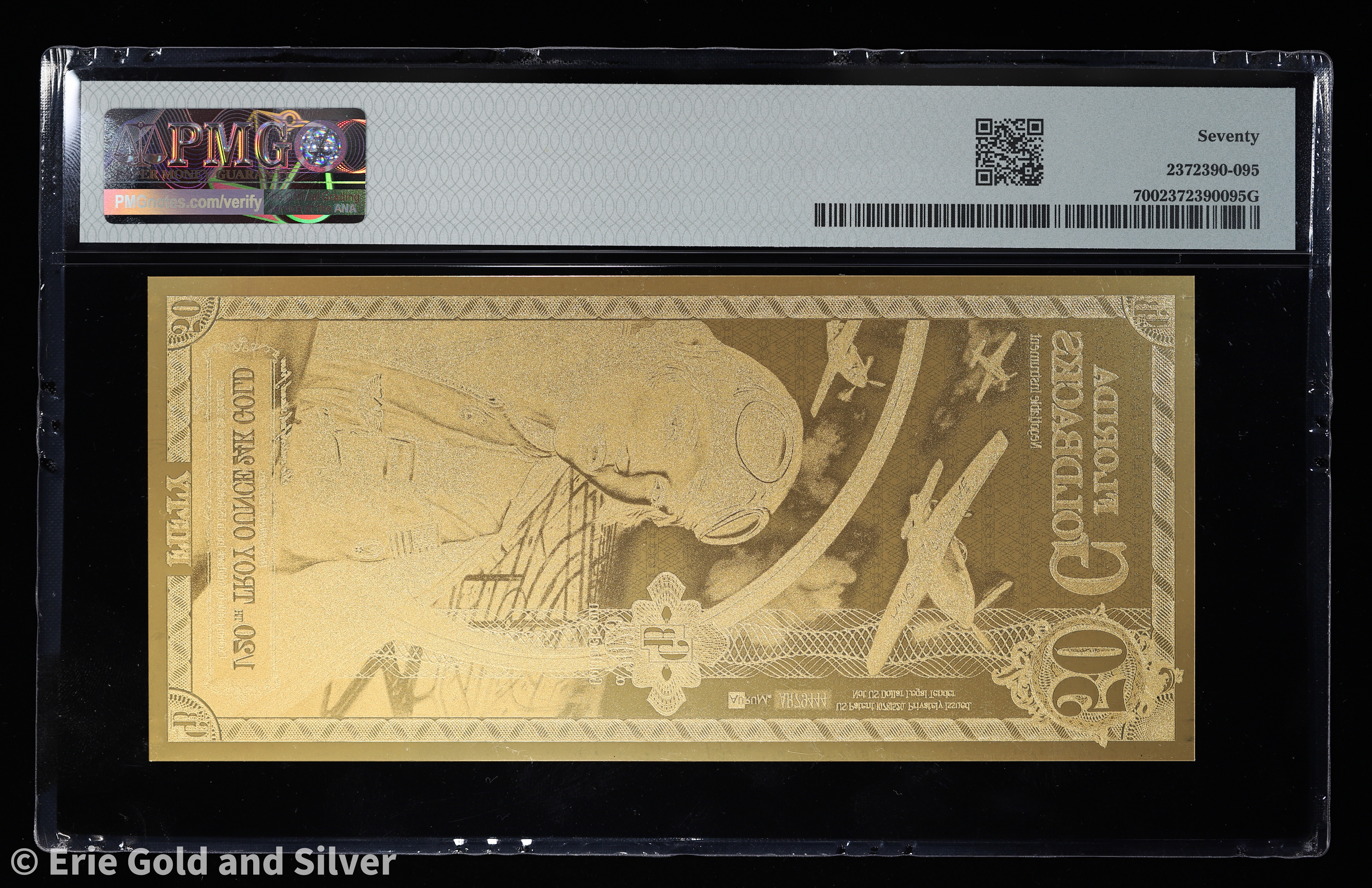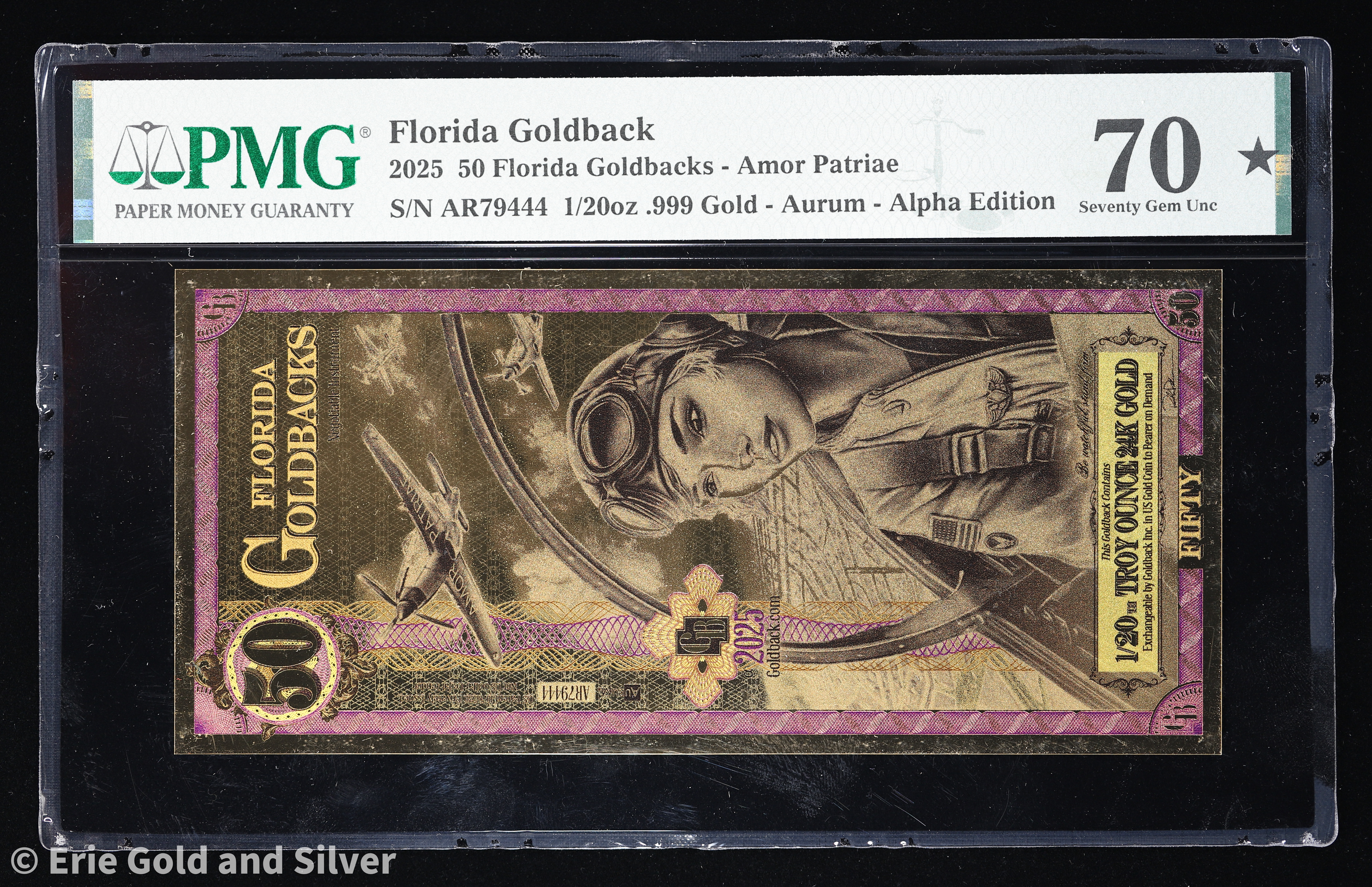 The Florida 50 Goldback honors the virtue “Amor Patriae” (Love of Country) through the image of a Women’s Airforce Service Pilot flying a P-51 Mustang over Hendricks Army Airfield. This powerful tribute celebrates the bravery and dedication of women who served during WWII, protecting the nation with skill and courage. Her uniform proudly displays insignia commemorating their vital role in military aviation and support. This piece stands as a lasting homage to their sacrifice and enduring patriotism.
