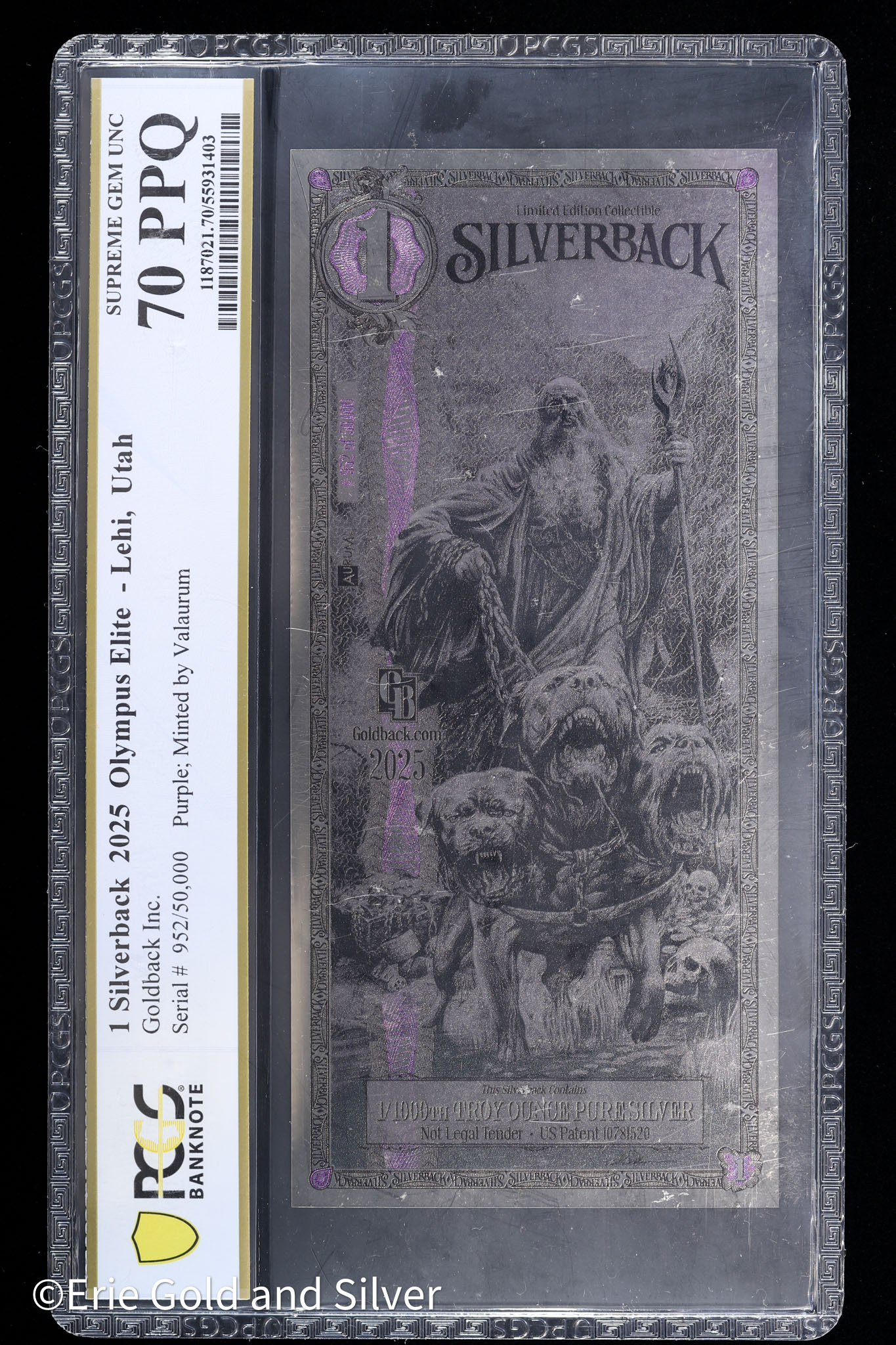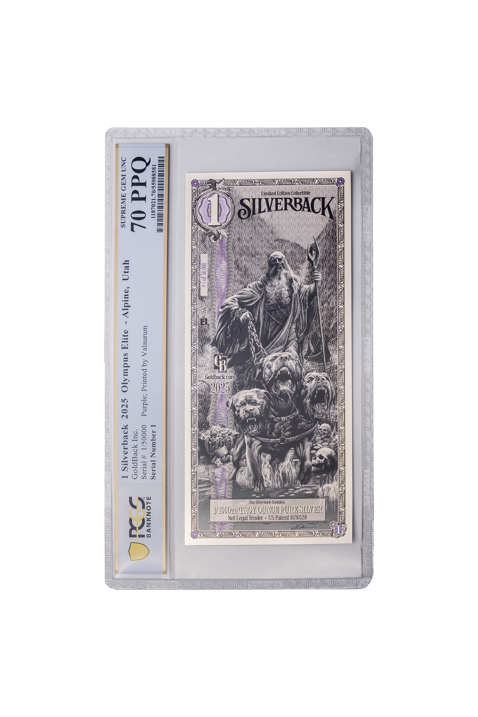 Begin the Legends of Olympus series with this striking 1/1000 oz .999 fine silver foil note featuring Hades, God of the Underworld. This note is graded by PCGS as Supreme Gem UNC 70 PPQ and has a limited mintage of 50,000. As the first release in the series, this finely detailed Silverback note sets the foundation for an epic collection inspired by Greek mythology. Crafted in ultra-thin silver foil with bold artwork, it is a fine collectible piece ideal for serious collectors, mythology enthusiasts, and those seeking a unique entry point into a new series.