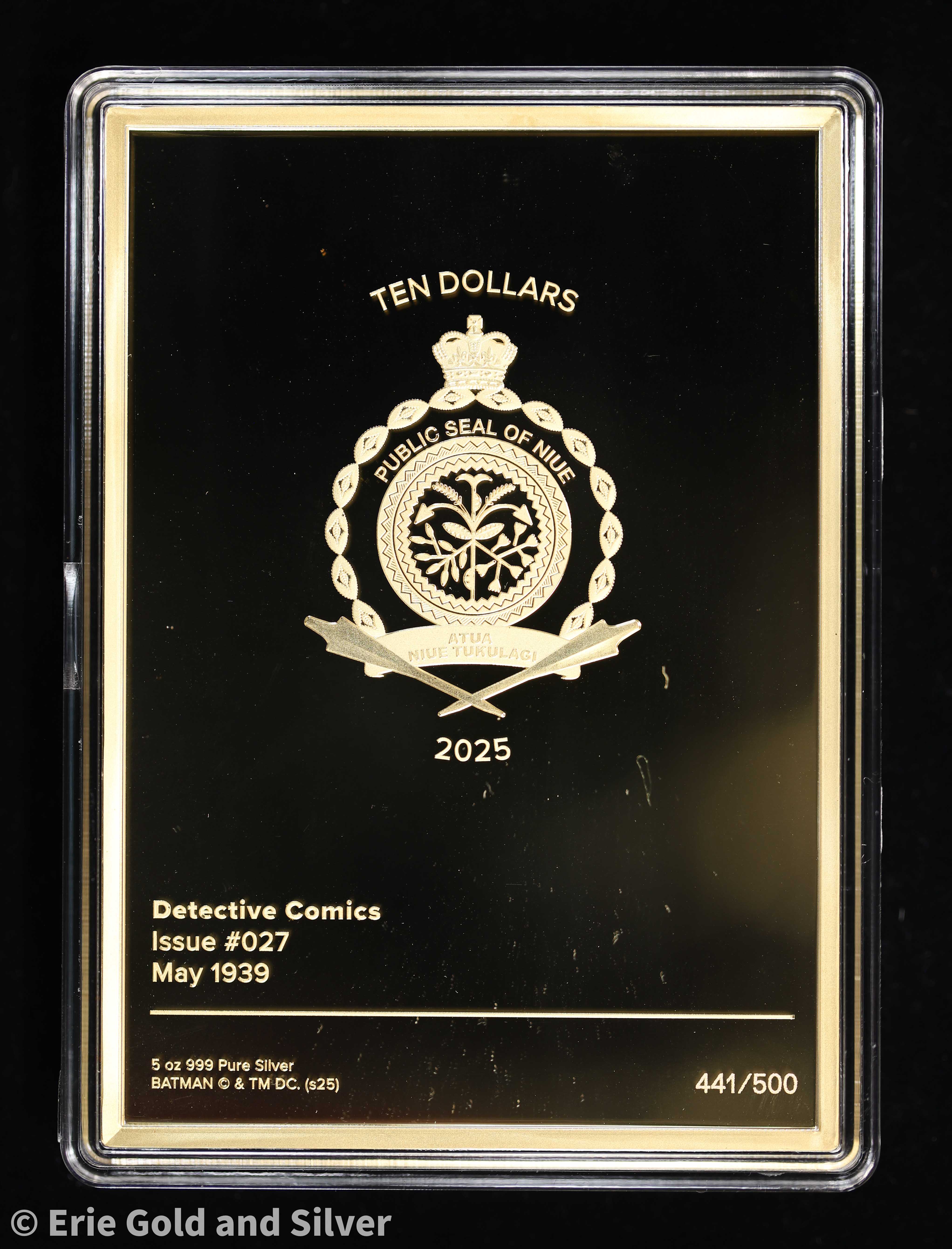 The 2025 Niue $10 DC 90th Anniversary Detective Comics #27 Batman 5 oz Silver Coin is a remarkable collectible that commemorates the debut of Batman in the 1939 issue of Detective Comics #27. Struck by the New Zealand Mint, this coin is part of the Golden Age Series celebrating 90 years of DC Comics.