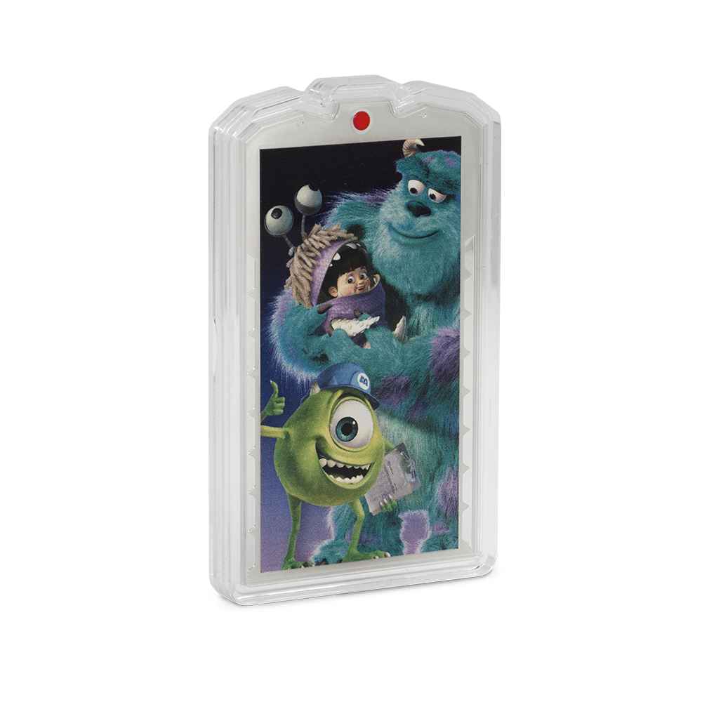 Reverse: Showcases a colorful, joyful portrait of Sulley, the gentle giant, alongside his one-eyed sidekick Mike Wazowski, with little Boo peeking in. The vibrant design is set against an engraved backdrop of the Monsters, Inc. factory door, with a high-relief finish and mirror accents enhancing the playful scene. Each coin is individually numbered for added exclusivity.
