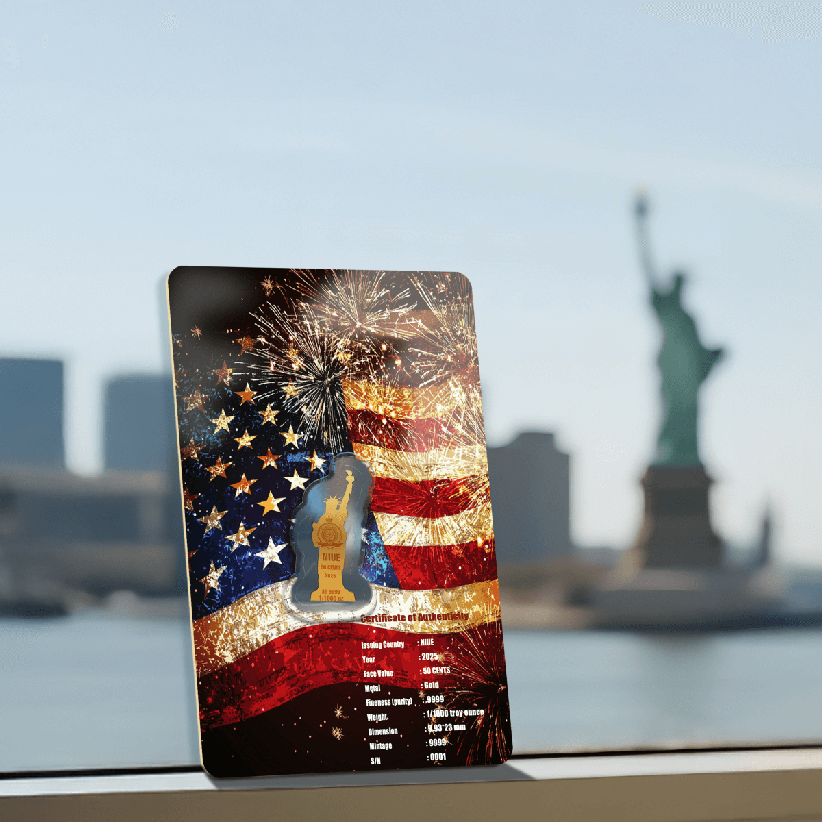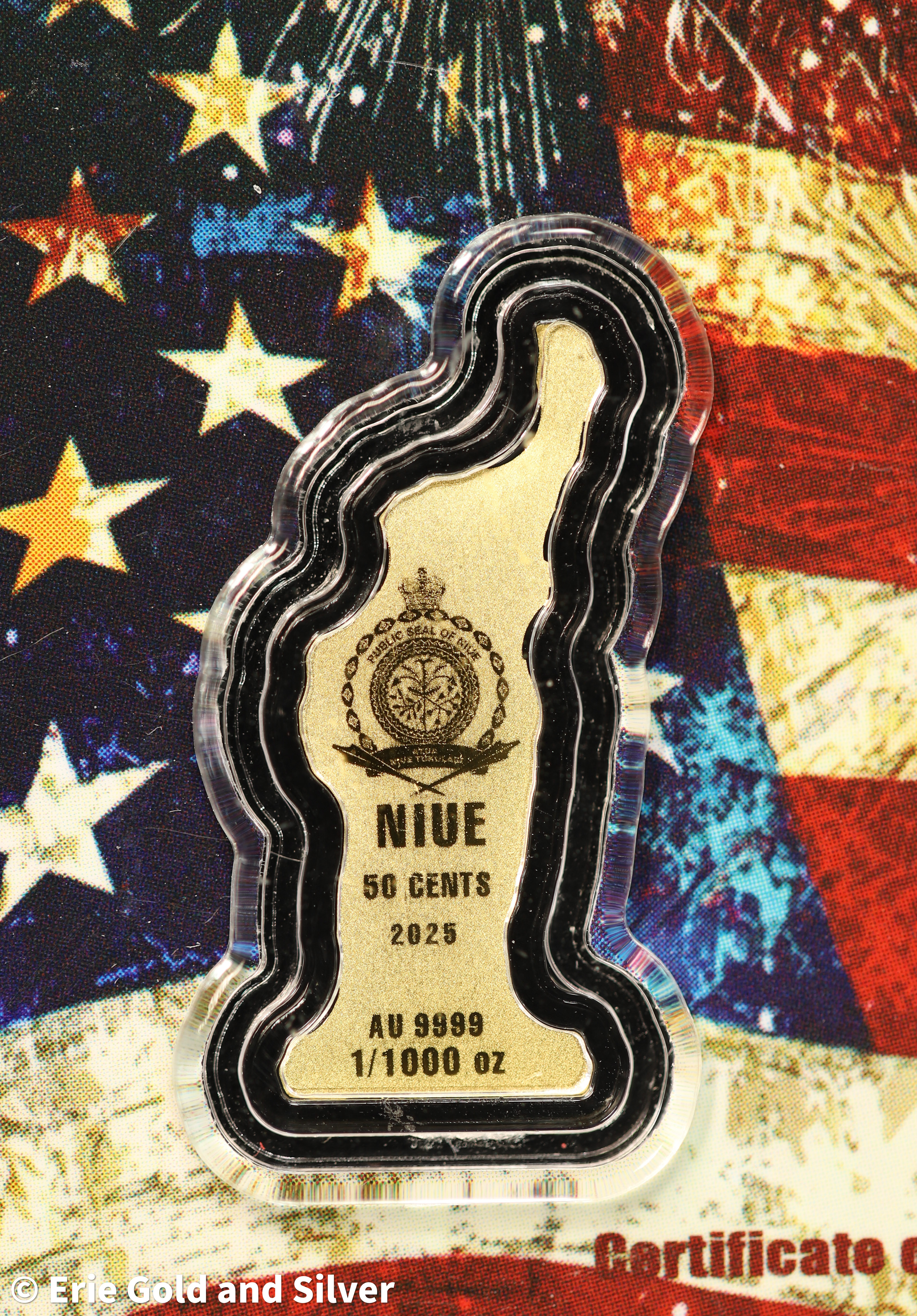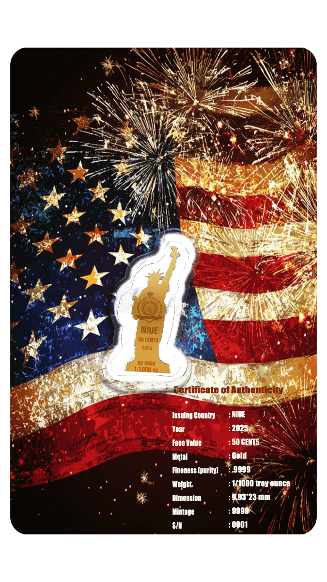 Celebrate freedom in miniature with the 2025 Niue 4th of July Statue of Liberty gold coin, expertly struck from 1/1000 oz of .9999 fine gold. Shaped like Lady Liberty herself, this officially licensed coin honors American independence with detailed design in an ultra-miniature format. Perfect for patriotic collectors, novelty gold enthusiasts, or as a unique gift, this tiny treasure proves that even the smallest coin can carry big symbolic weight.
