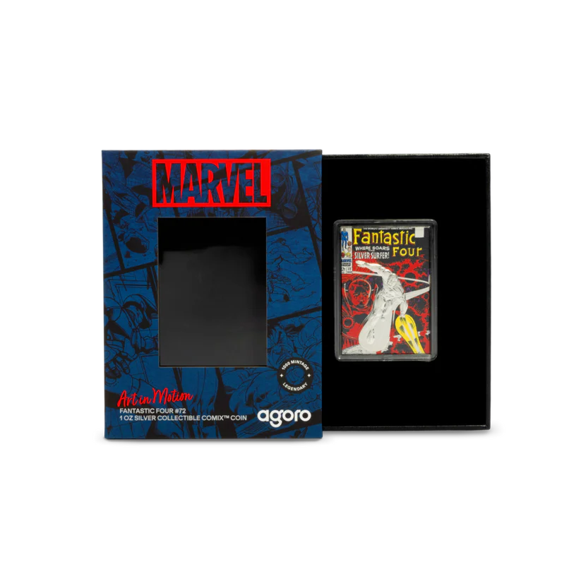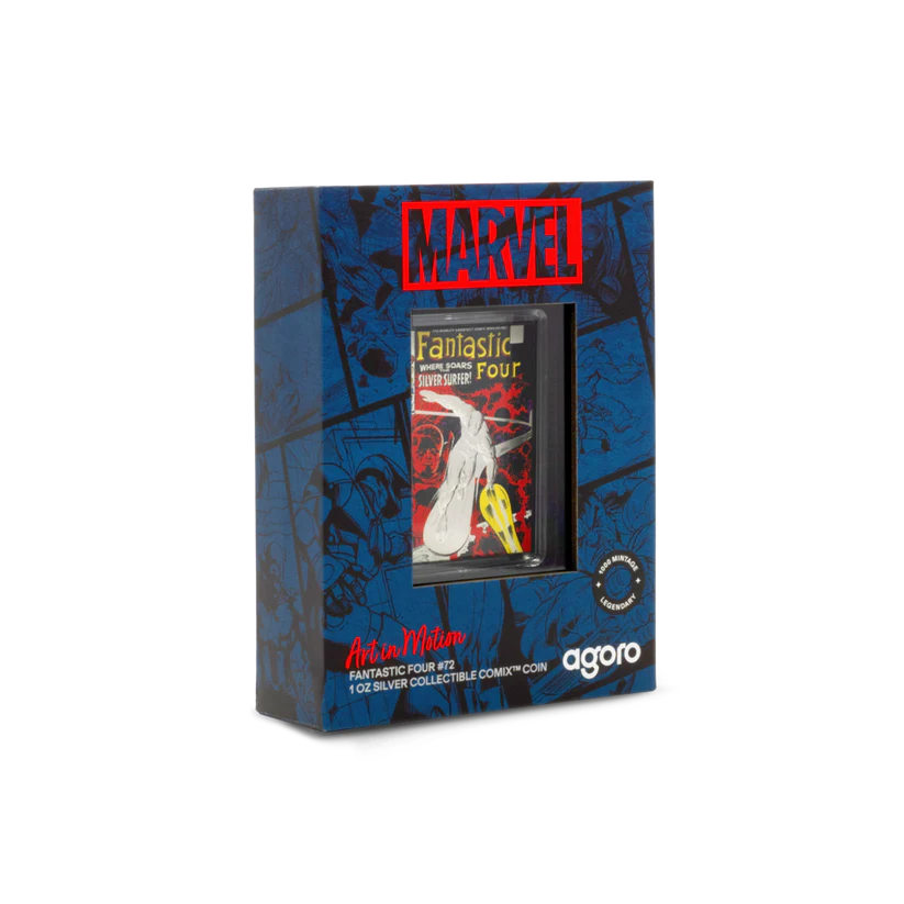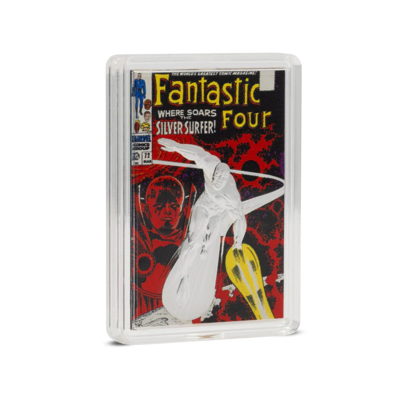 Celebrate Marvel history with the 2025 Niue Comix Fantastic Four #72 Silver Surfer 1 oz Silver Coin. This officially licensed release recreates the iconic 1968 comic cover in vivid color on 1 oz of .999 fine silver, presented in premium Comix-style packaging.