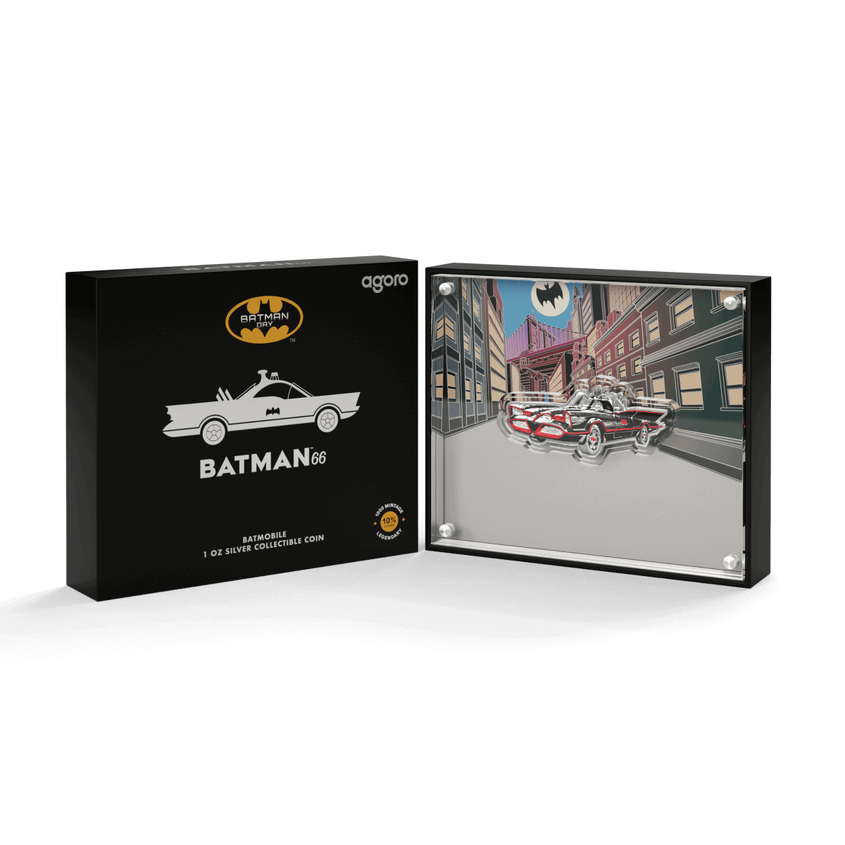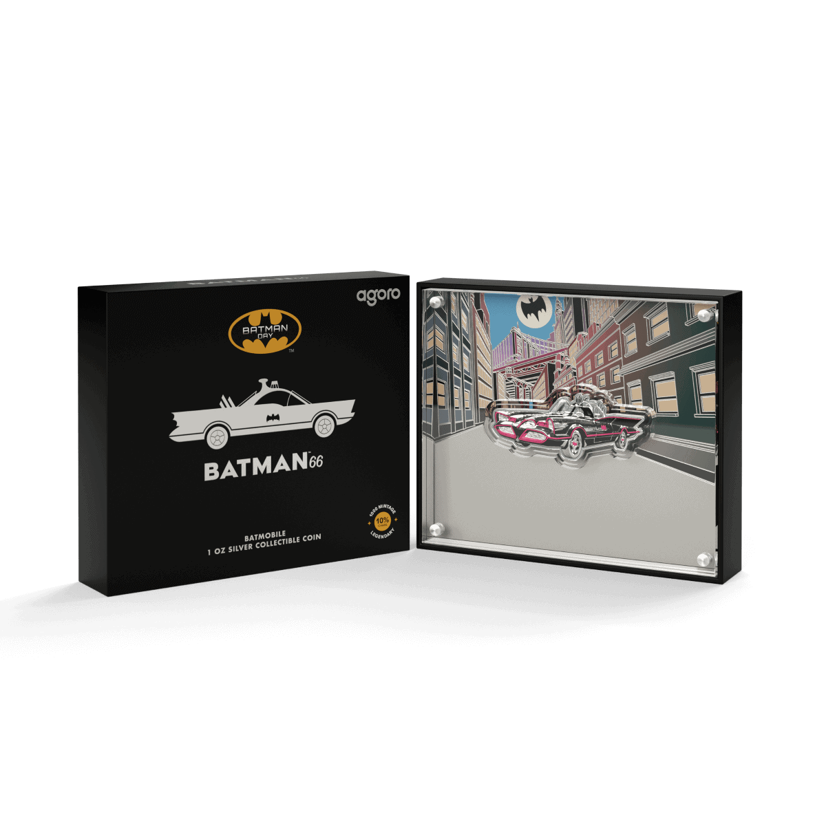 Celebrate classic comic book nostalgia with the 2025 Niue DC Batman ’66 Batmobile 1 oz Silver Proof Coin. Struck from 1 ounce of .999 fine silver, this officially licensed proof coin showcases the iconic 1966 Batmobile in stunning colorized detail and mirror-like finish. Each coin comes factory sealed, ensuring pristine condition and collectible integrity—perfect for fans of Batman’s Silver Age legacy and premium DC Comics memorabilia. In addition, lucky collectors have a 10% chance of receiving a rare chase version with pink accents and special packaging.