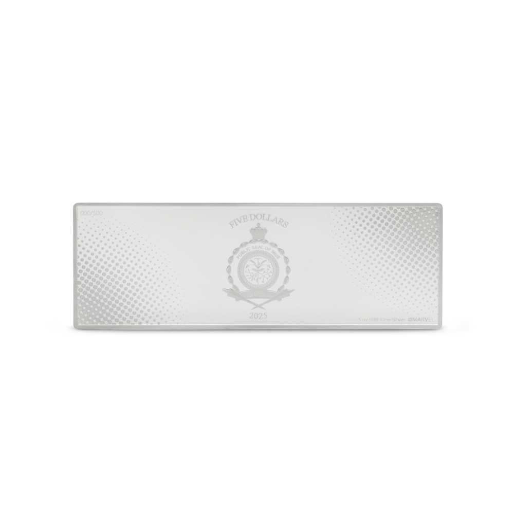 Obverse: Features the Public Seal of Niue, confirming its legal tender status, alongside inscriptions for the face value $5, year 2025, and "3 oz 999 Fine Silver." Subtle Marvel branding ties it to the legendary franchise.