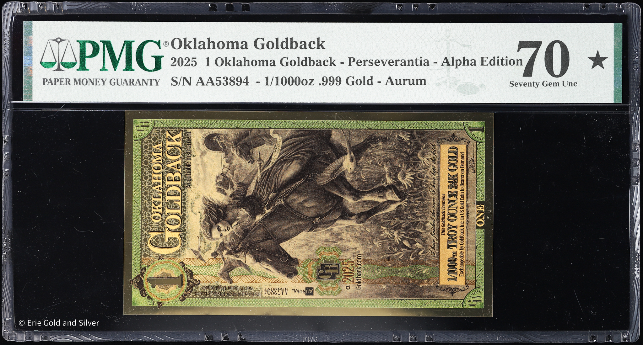 For sale is a 2025 Oklahoma 1 Goldback. Certified/Graded by PMG at 70*.