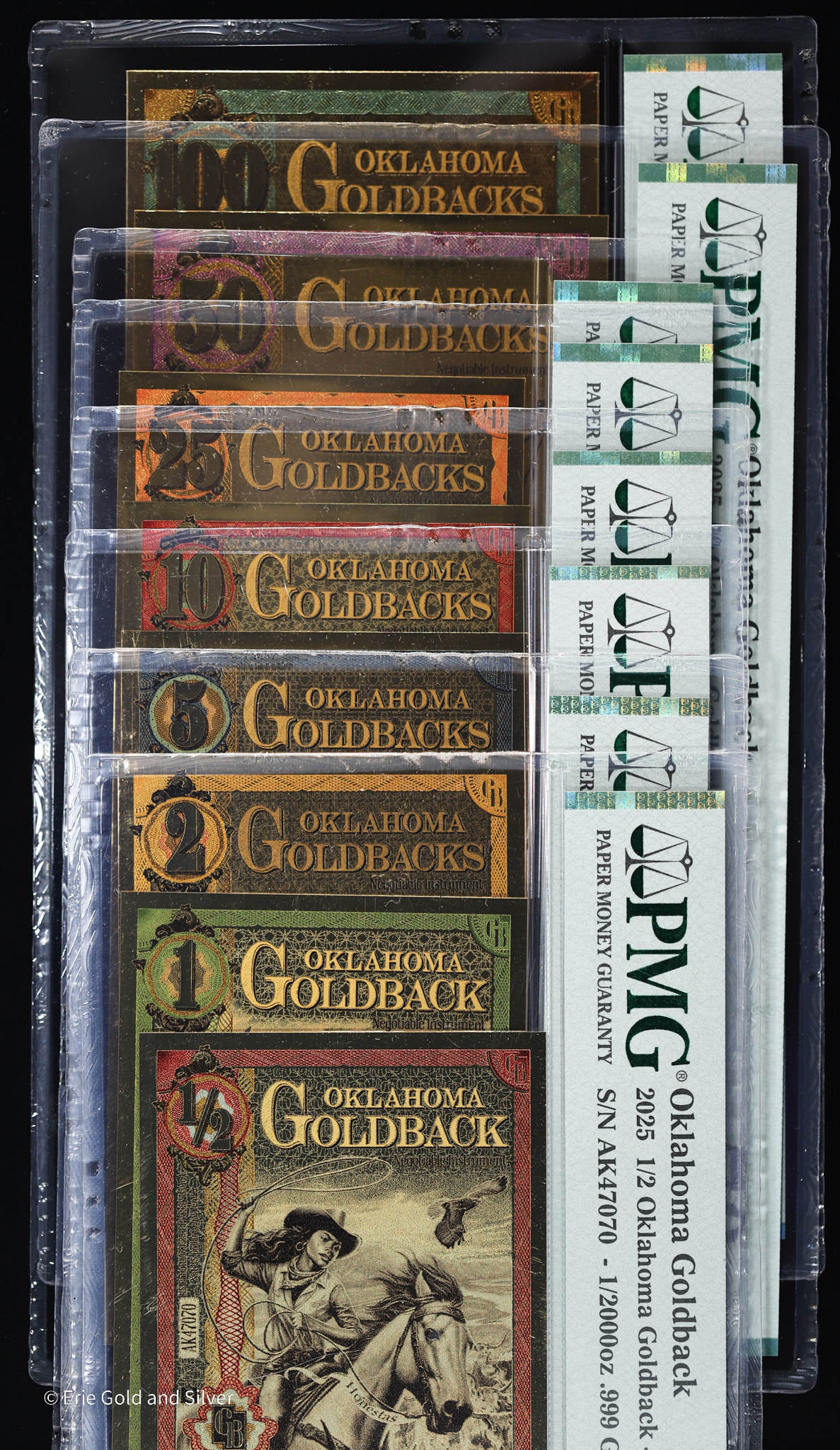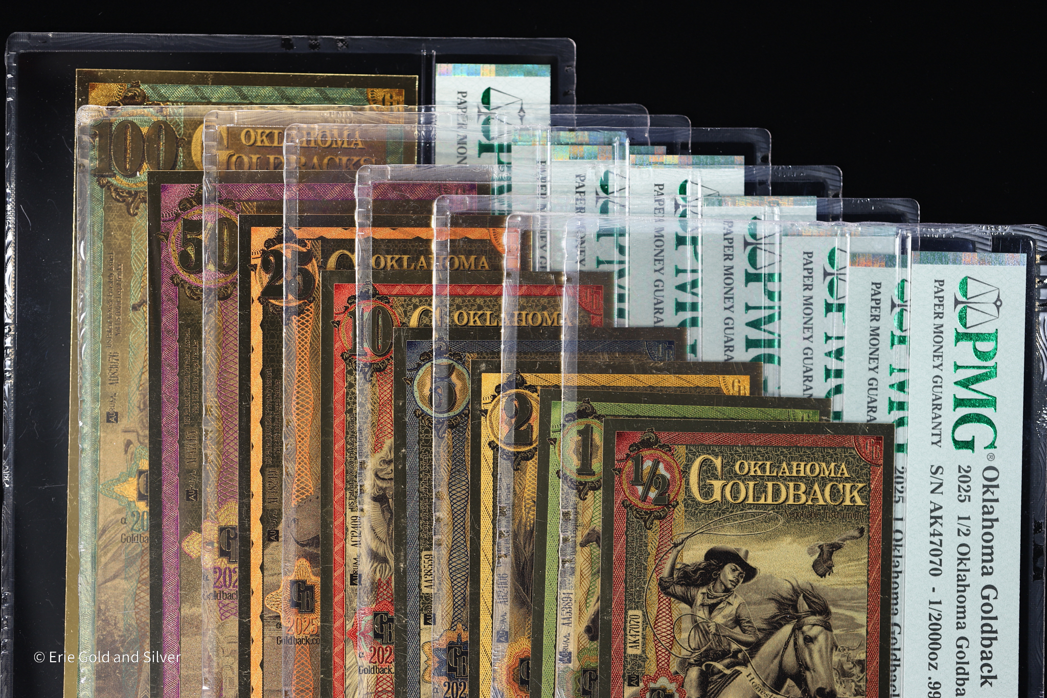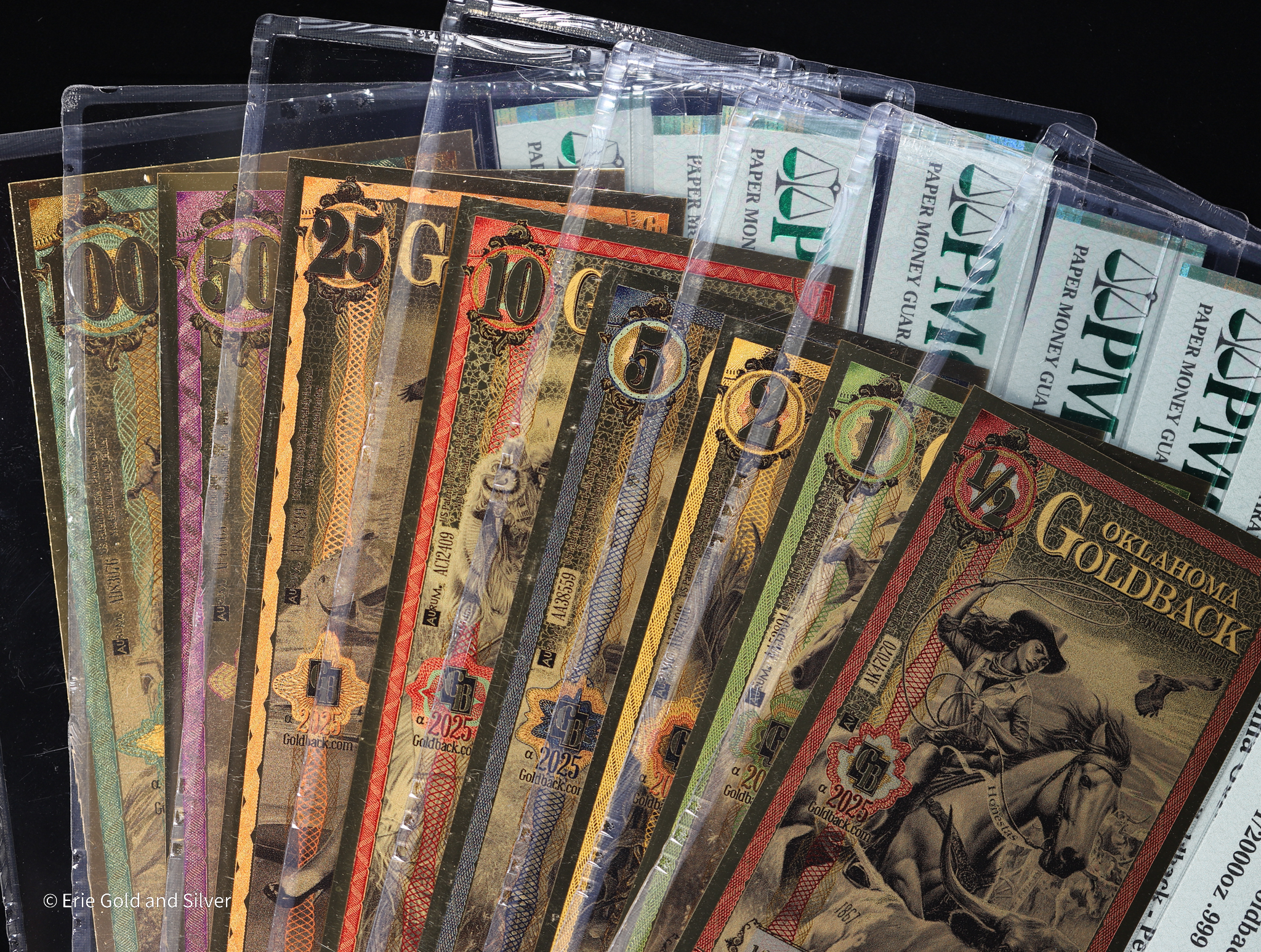 The Oklahoma Goldback is a voluntary, gold-backed currency containing 24-karat gold. Designed for use in Oklahoma, these notes provide a practical way to own and spend real gold. Accepted by participating businesses and sought after by collectors, Goldbacks offer a unique and tangible form of sound money.