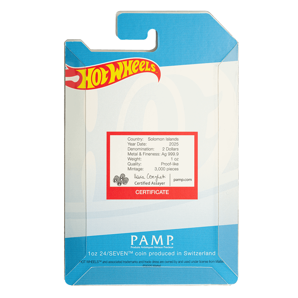 Rev up your collection with the 2025 Hot Wheels 24/Seven silver coin from PAMP! Struck from 1 oz of .999 fine silver, this officially licensed release captures the bold style and racing spirit of the legendary Hot Wheels brand. Featuring the dynamic 24/Seven model in vivid colorized detail, this high-octane coin is perfect for car enthusiasts, nostalgic collectors, and fans of adrenaline-fueled design. Start your engines—this limited edition won't stay parked for long.