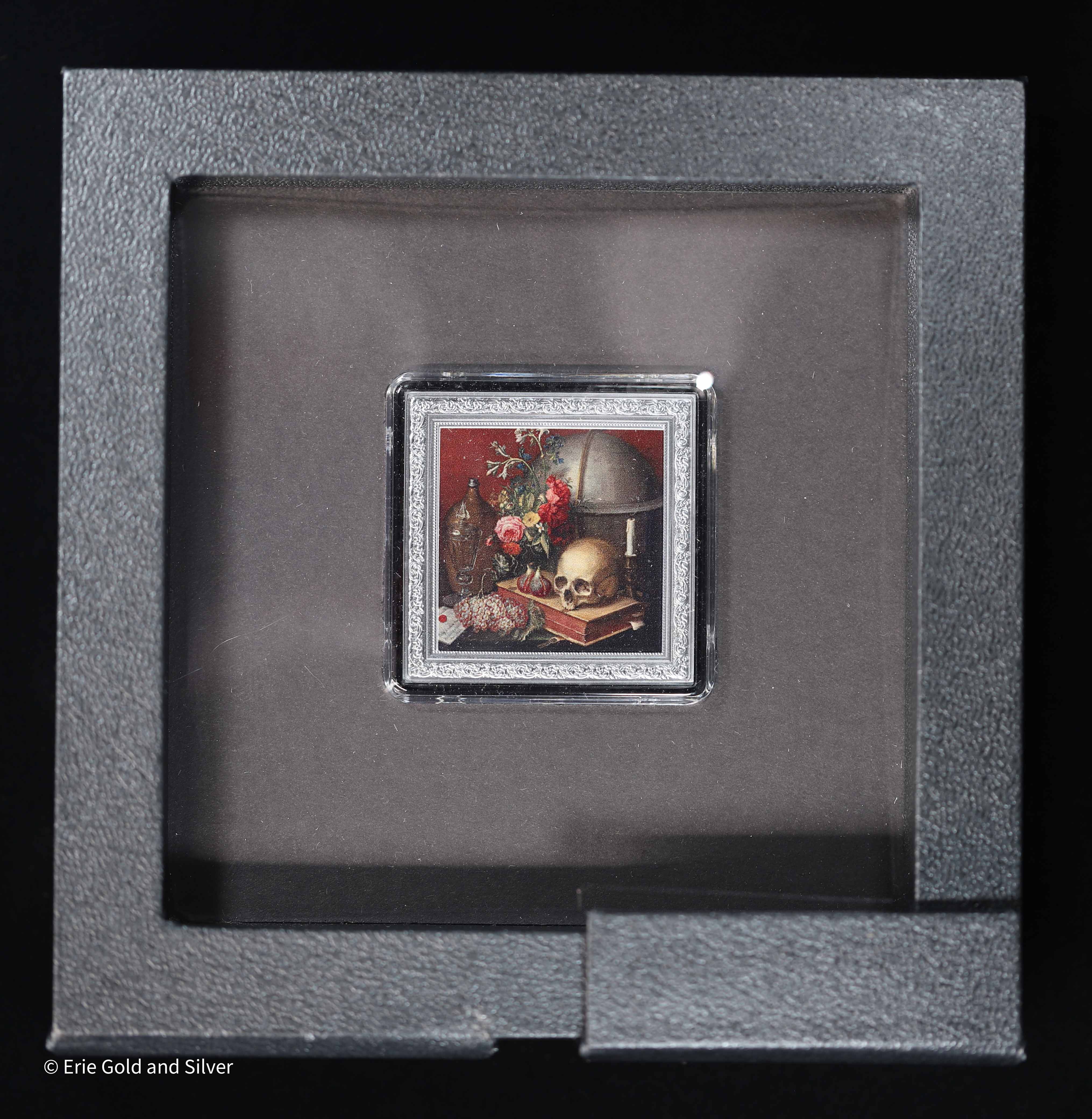Explore the beauty and symbolism of mortality with the 2025 Philipp Sauerland – Vanitas 1 oz Silver Black Proof Coin. Struck from 1 ounce of .999 fine silver, this striking piece features Sauerland’s modern interpretation of the classic Vanitas theme, rendered in dramatic black proof finish. Presented in Original Government Packaging (OGP), it’s a hauntingly elegant fusion of fine art and numismatic craftsmanship.