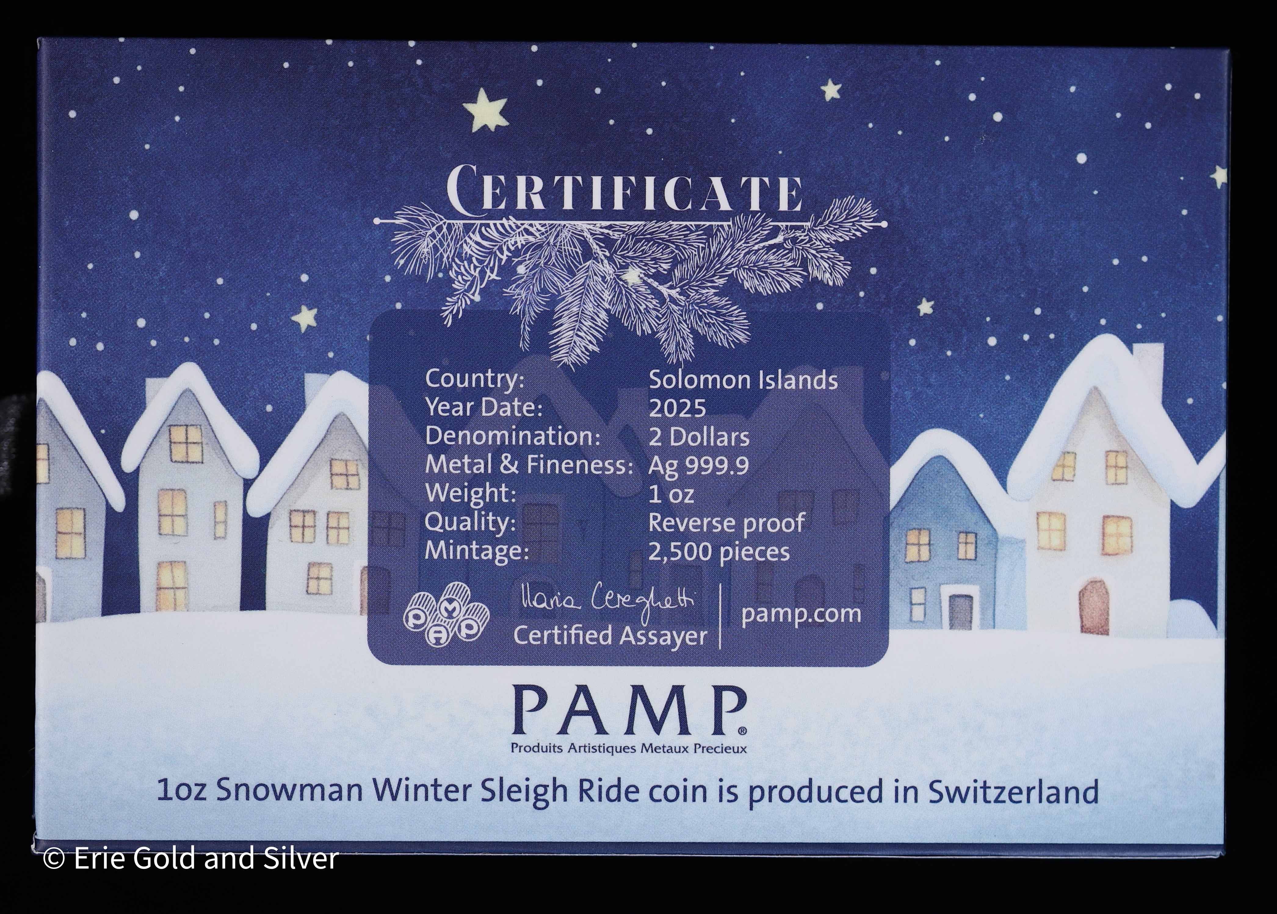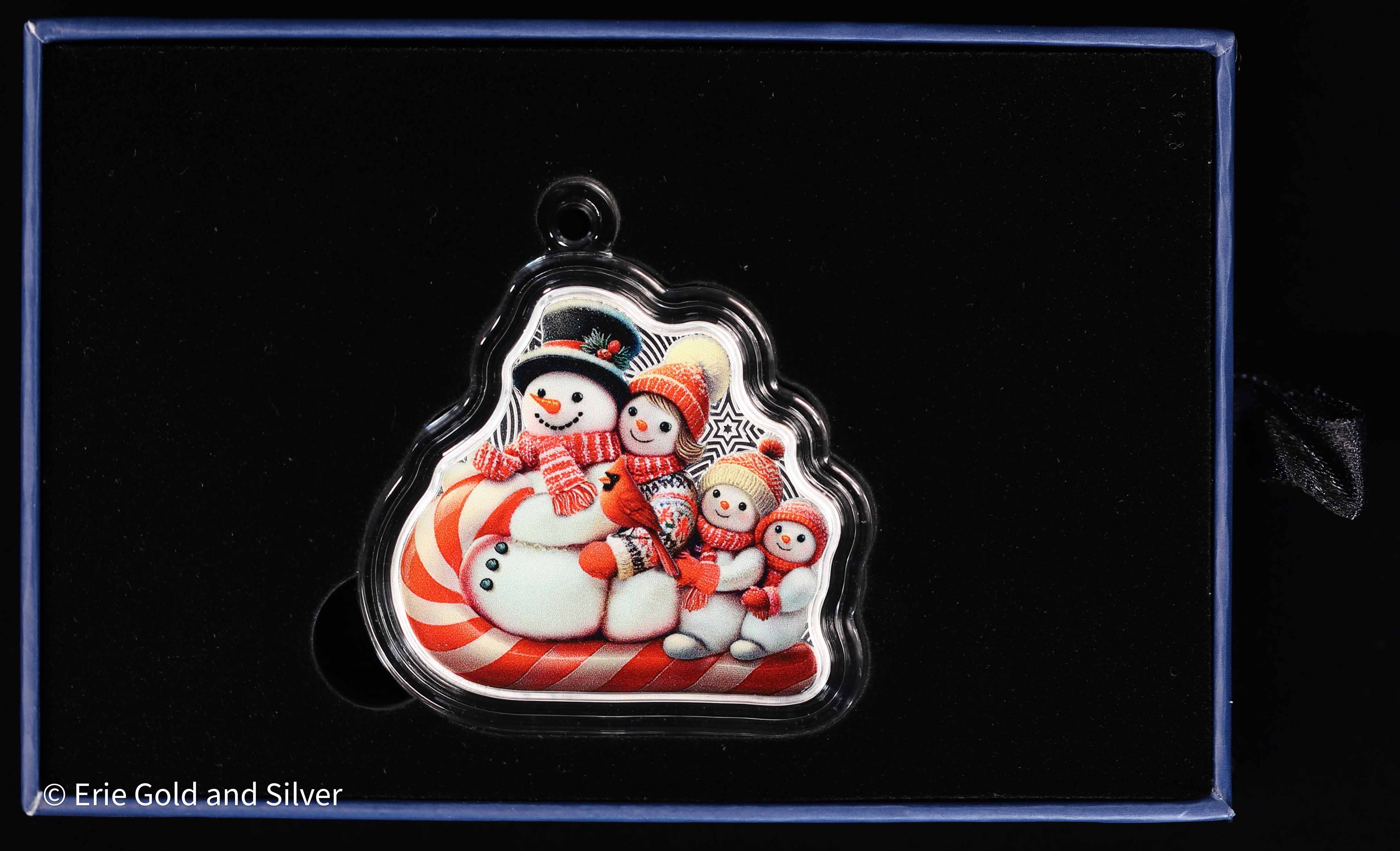 Produced in 2025, this Snowman Winter Sleigh Ride piece contains 1 oz of fine silver and features a festive seasonal design by PAMP. Blending holiday charm with renowned mint craftsmanship, this release appeals to collectors of themed silver, seasonal issues, and PAMP-branded bullion collectibles.