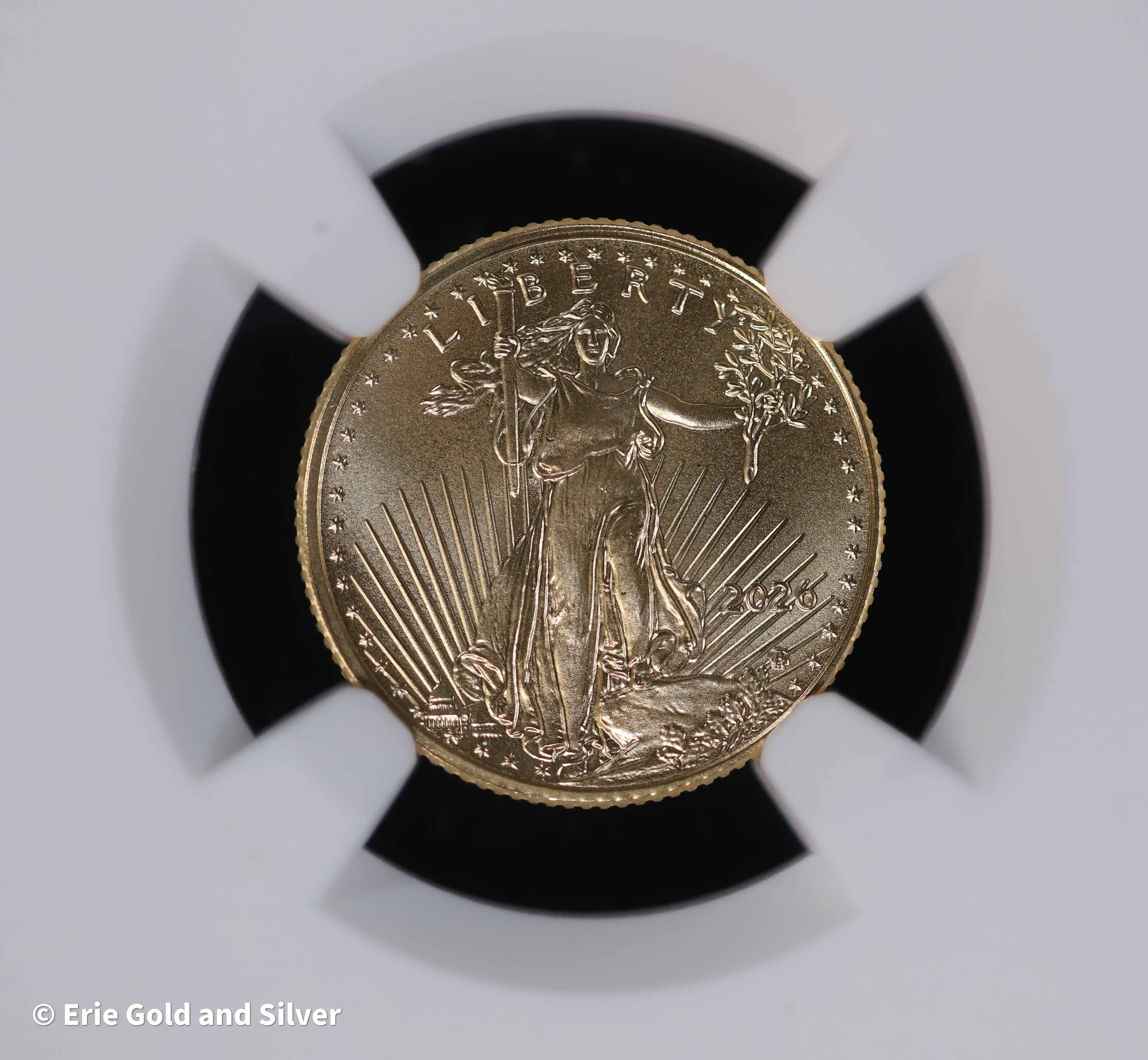 The 2026 $5 American Gold Eagle 1/10 oz Coin is a popular fractional gold bullion issue from the U.S. Mint. Struck from fine gold, the coin features Augustus Saint-Gaudens’ iconic Lady Liberty design on the obverse and the modern eagle reverse introduced in the updated series. Graded MS 69, this example offers near-perfect quality with excellent detail and strong luster, making it an appealing option for both collectors and gold investors.