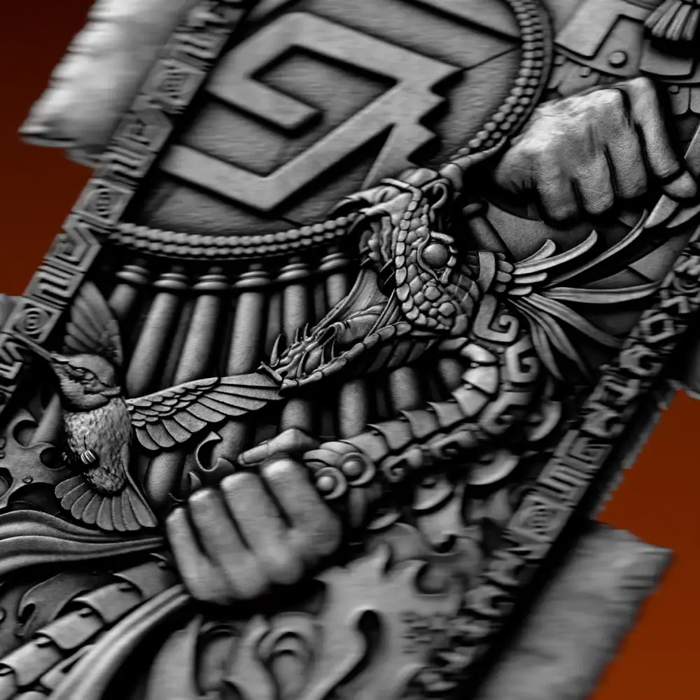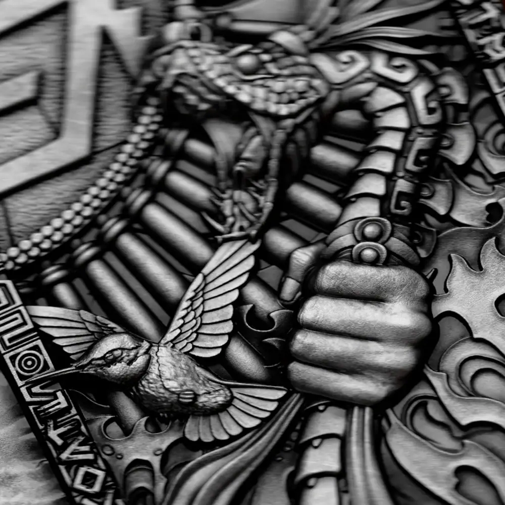 2026 Huitzilopochtli’s Macuahuitl 2 oz Silver Antiqued High Relief Shaped Coin