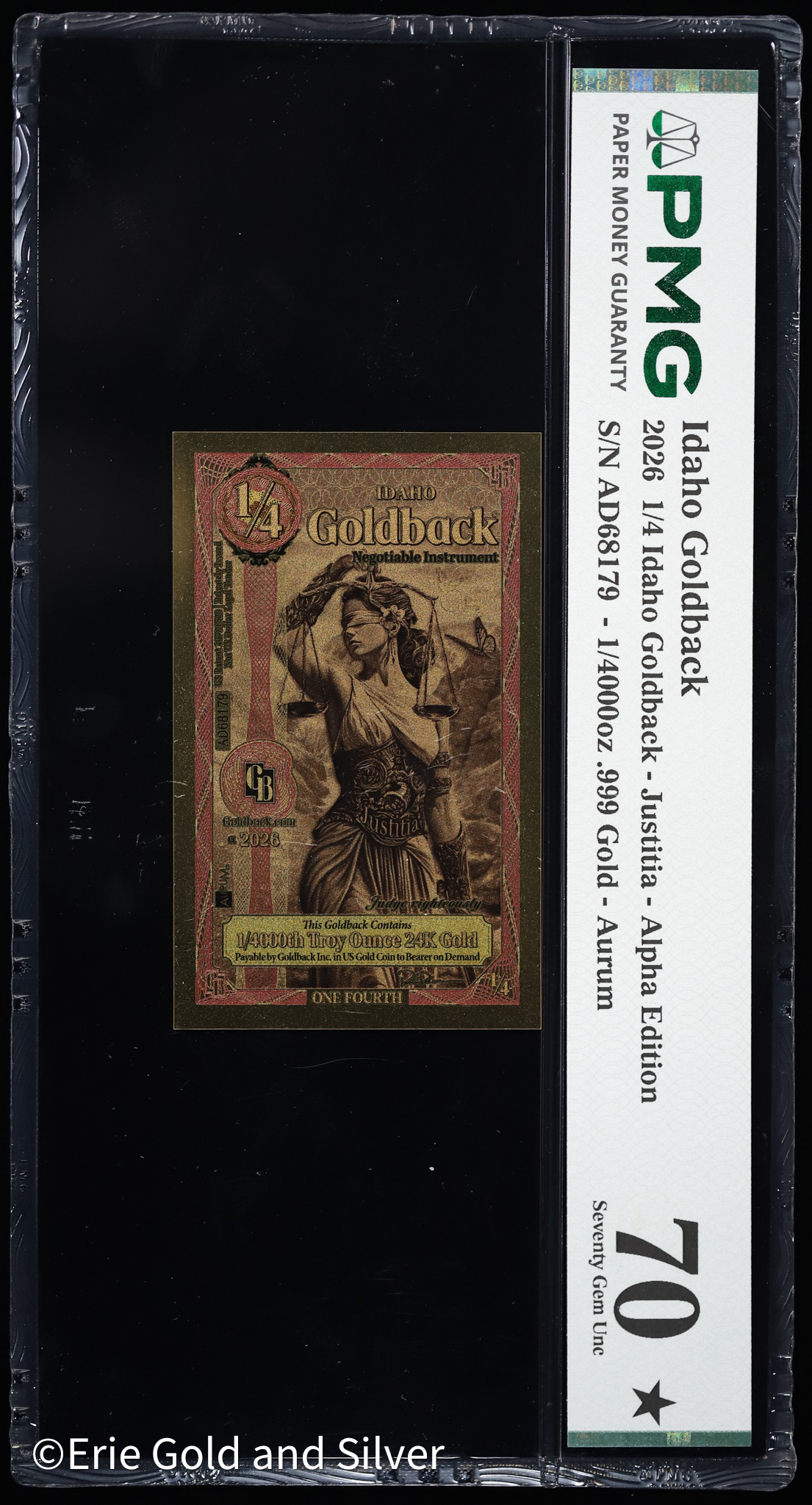 The Idaho 1/4 Goldback features the virtue Justitia (Justice), the classical symbol of fairness and impartial judgment. She holds raised scales to weigh truth and a lowered sword to represent restrained authority, while her blindfold signifies unbiased judgment. The design includes symbols from Idaho’s heritage, such as the elk and cornucopia from the state seal, along with the syringa flower and monarch butterfly to represent strength, abundance, and renewal. Hells Canyon rises behind her, reflecting the rugged environment where fairness and integrity are tested. Together, these elements reinforce the enduring principle written below: “Judge righteously.”