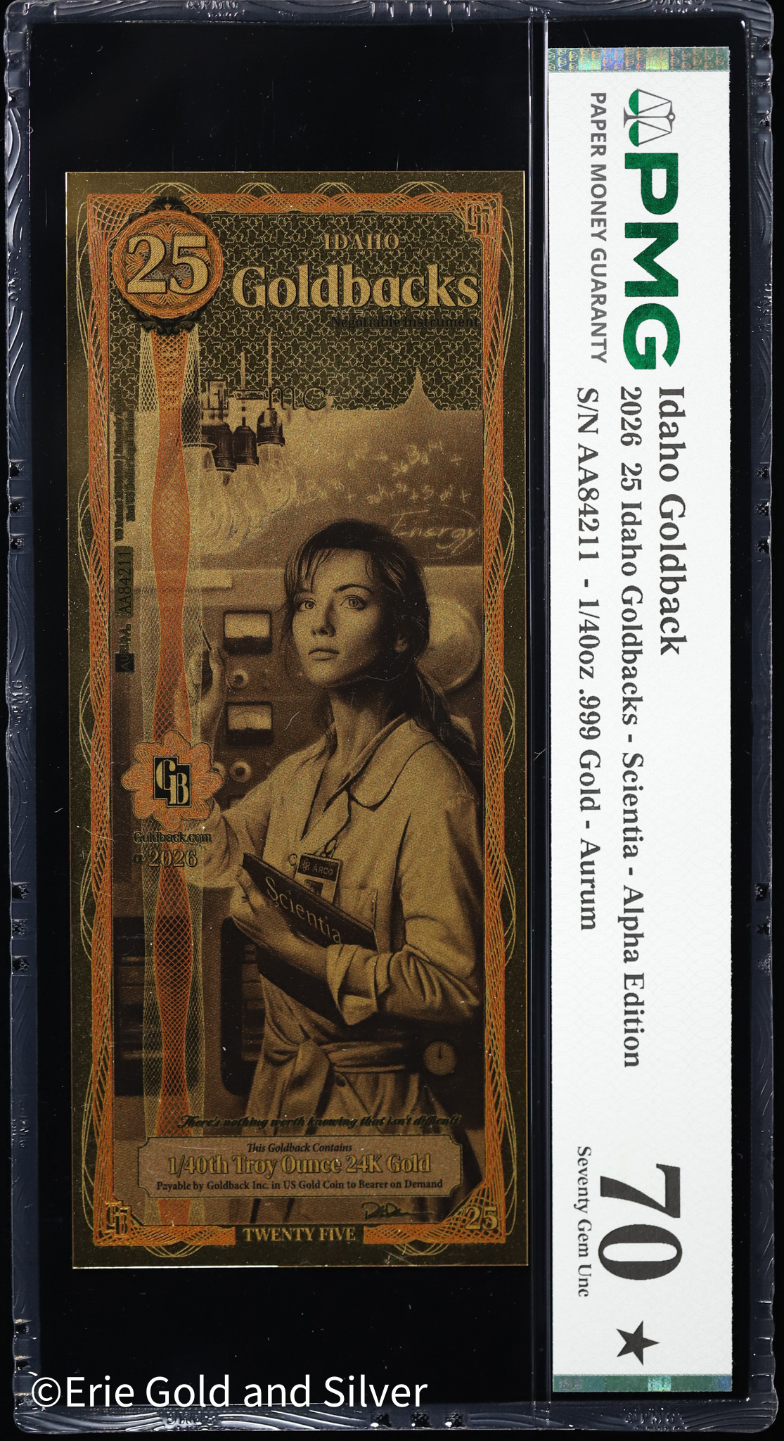 The Idaho 25 Goldback represents the virtue Scientia (Knowledge) and honors Idaho’s role in a groundbreaking moment in scientific history. In 1951, Experimental Breeder Reactor I (EBR-I) near Arco became the first power plant in the world to generate electricity from nuclear energy, later powering the entire town of Arco in 1955. The artwork features a scientist standing before equations that represent the fundamental principles of nuclear physics, symbolizing the pursuit of discovery and innovation. This achievement helped establish Idaho as a global center for nuclear research, now carried forward by the Idaho National Laboratory. Inscribed below is a quote from Idaho native and television inventor Philo T. Farnsworth: “There’s nothing worth knowing that isn’t difficult.”