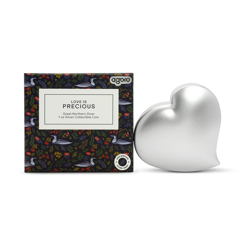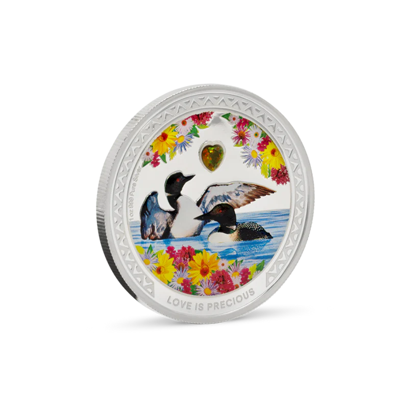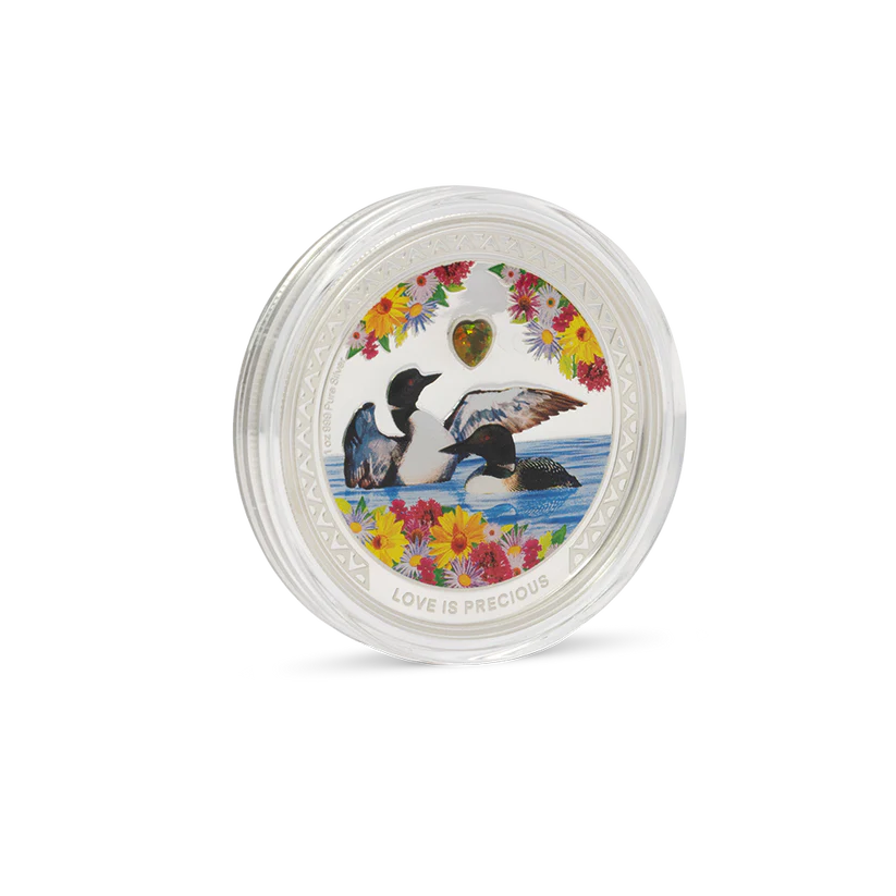 The 2026 Niue Love is Precious – Great Northern Diver 1 oz Silver Coin beautifully celebrates devotion and partnership in nature. Struck from .999 fine silver, it features vibrant colorized artwork of two Great Northern Divers forming a heart-shaped reflection across the water. Presented in official government packaging, this elegant release makes a meaningful gift and a standout piece for wildlife and themed-love coin collectors.