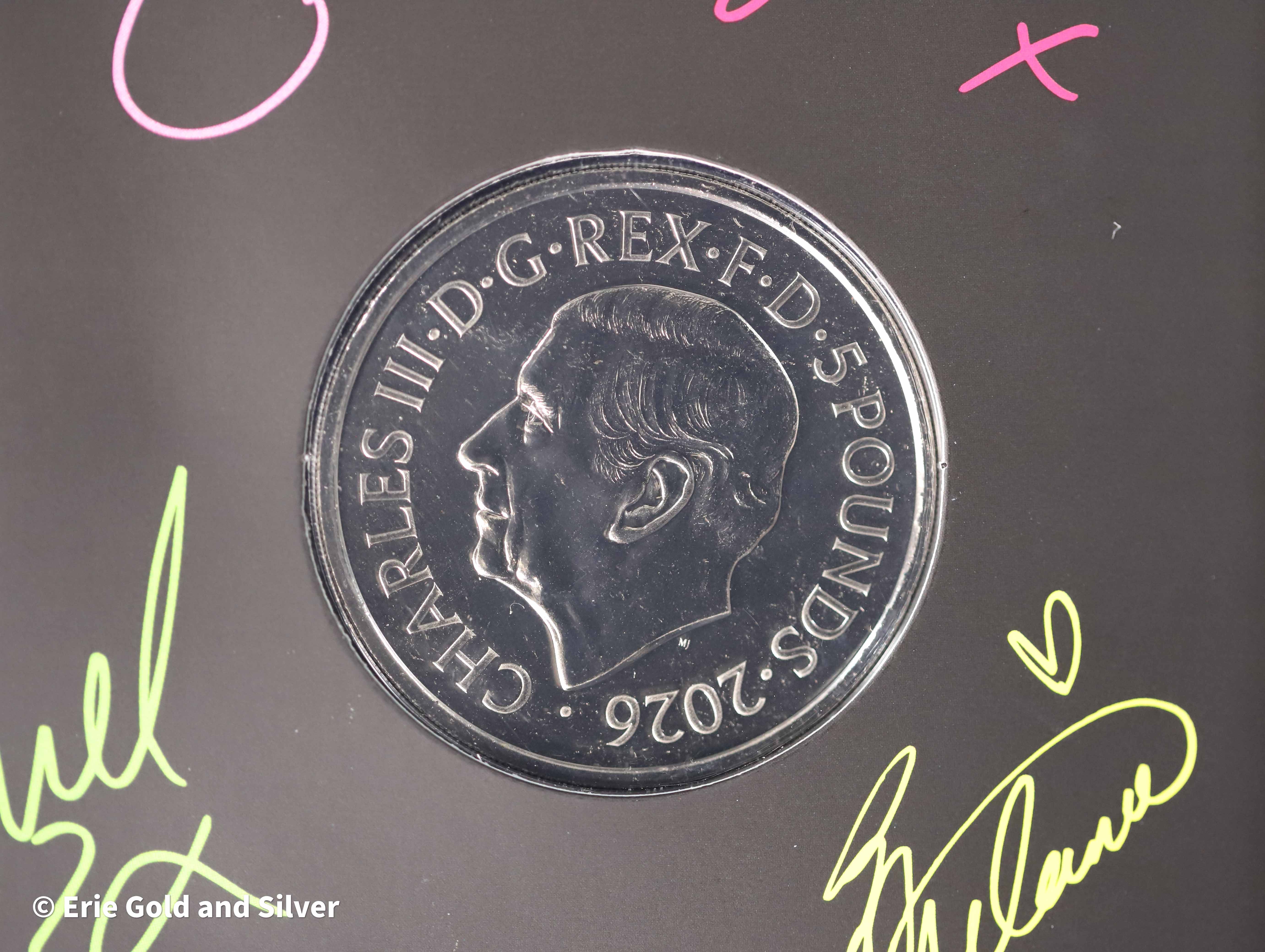 The 2026 Royal Mint Spice Girls Copper-Nickel Coin celebrates the iconic pop group that defined a generation. Struck in copper-nickel, this collectible features a stylish design honoring the Spice Girls’ global impact on music and pop culture. Presented in original government packaging (OGP), it’s a must-have for fans and music memorabilia collectors.