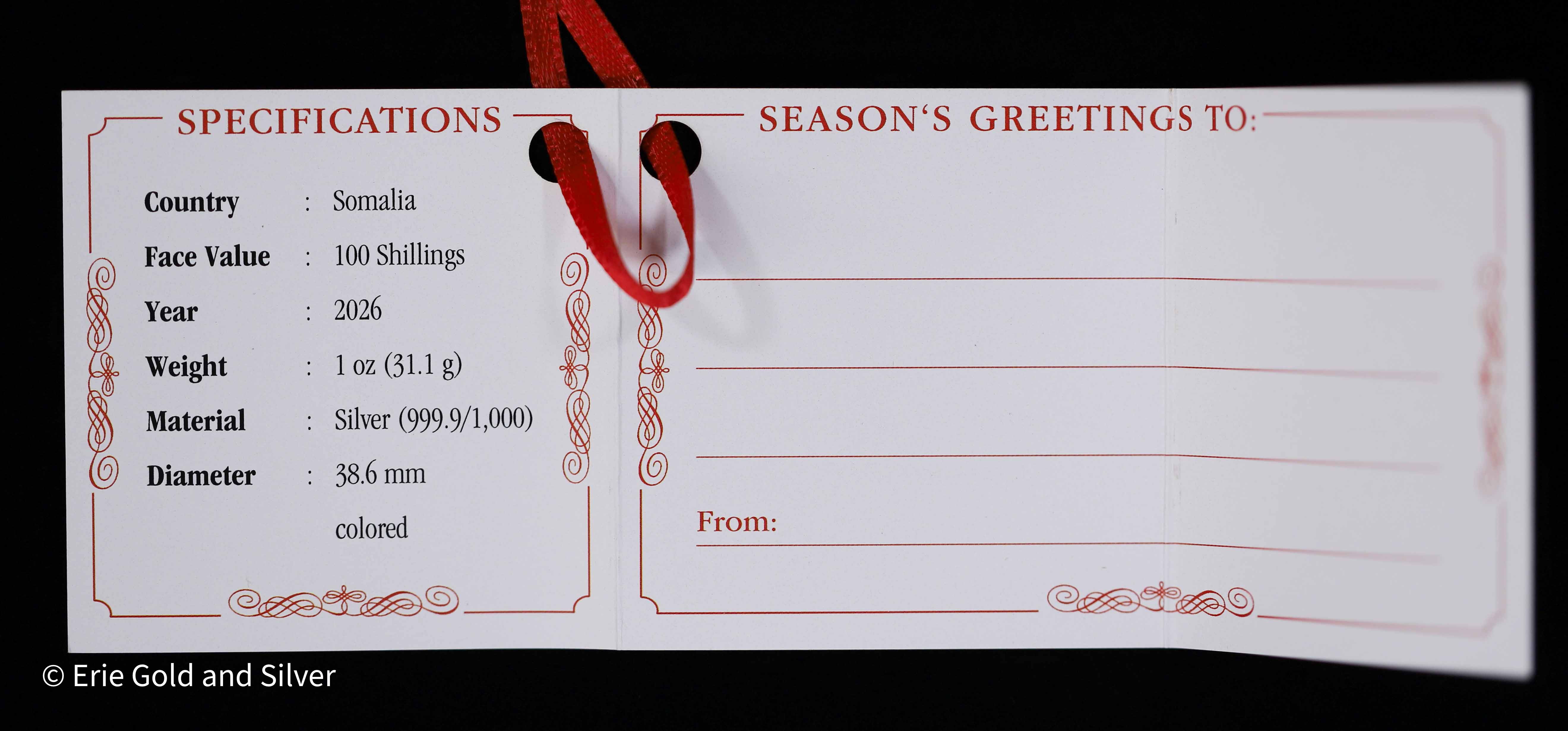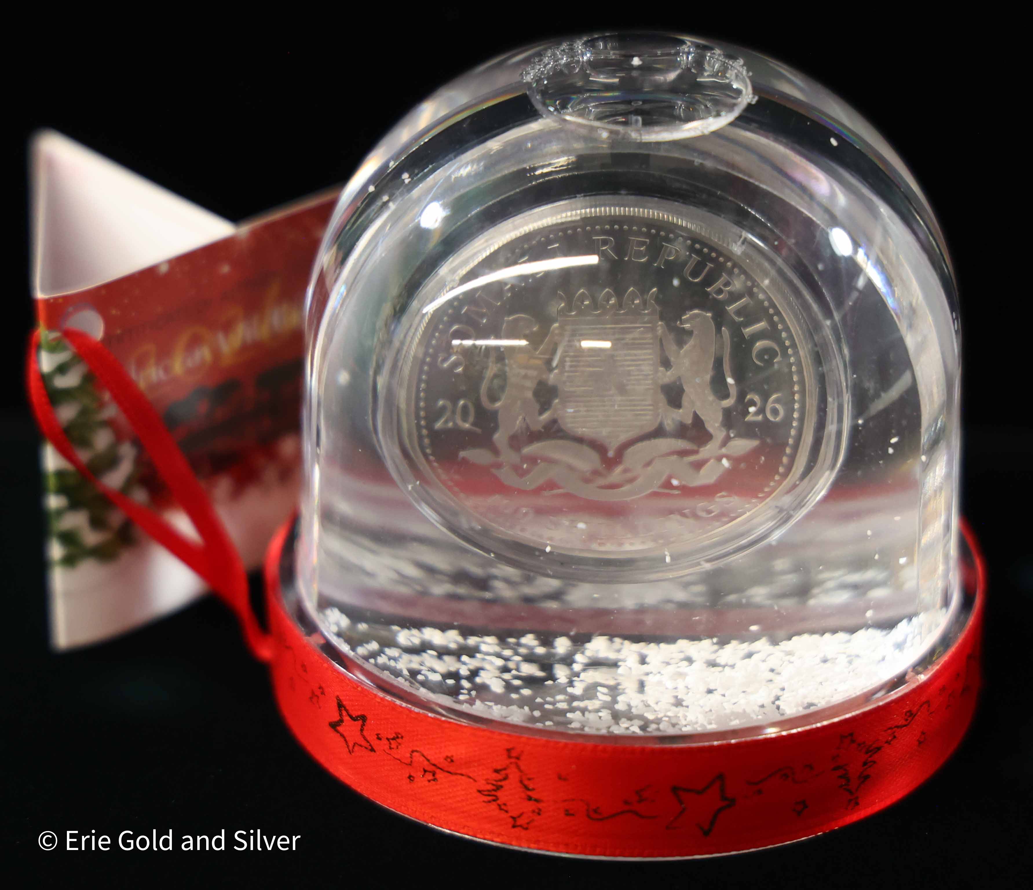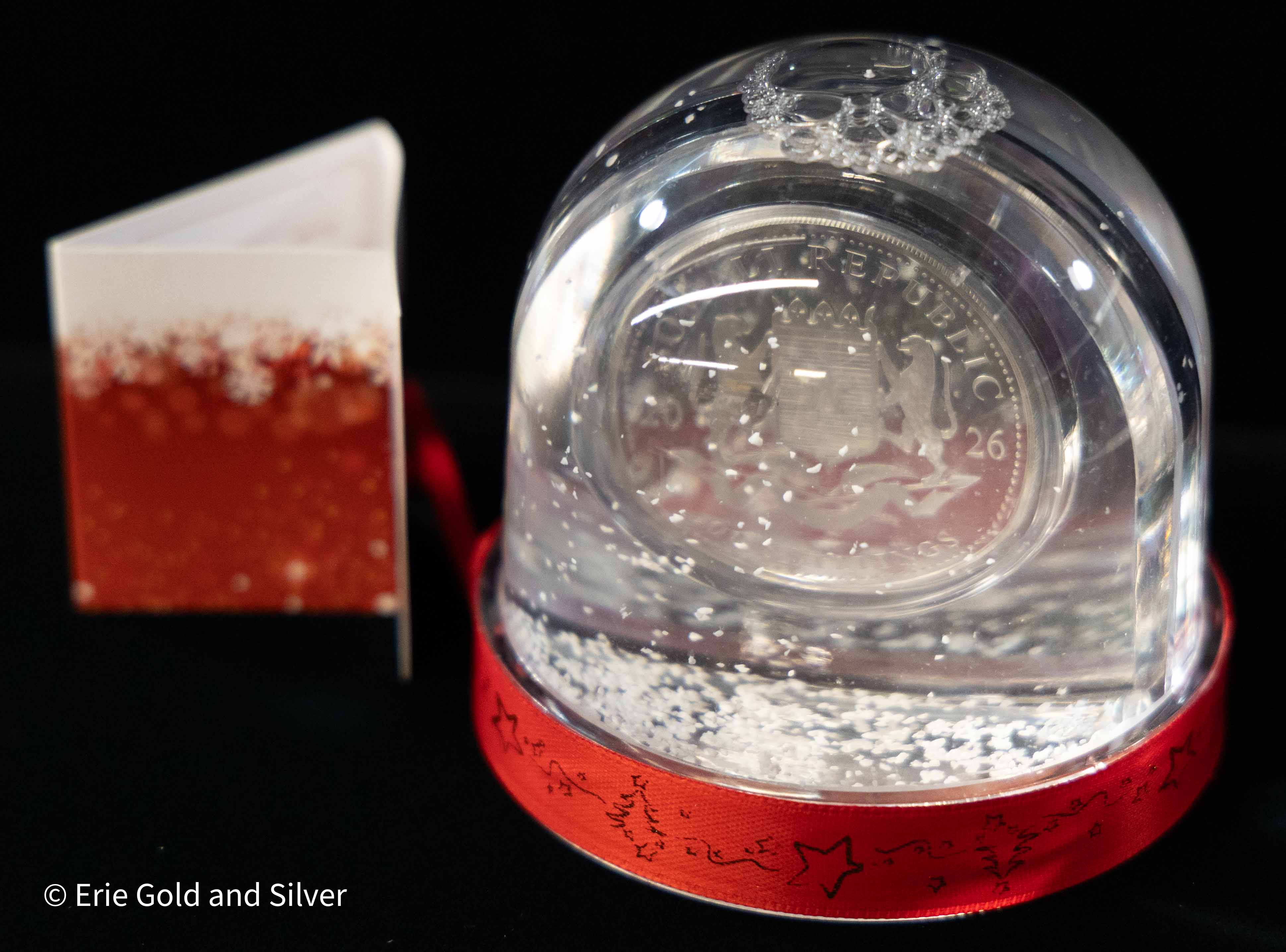 Issued by Somalia in 2026, this Colorized Elephant coin contains 1 oz of fine silver and is presented in a festive Christmas snowglobe display. Combining the popular Elephant design with seasonal packaging, this release appeals to collectors of wildlife silver, holiday-themed issues, and specialty presentation pieces.