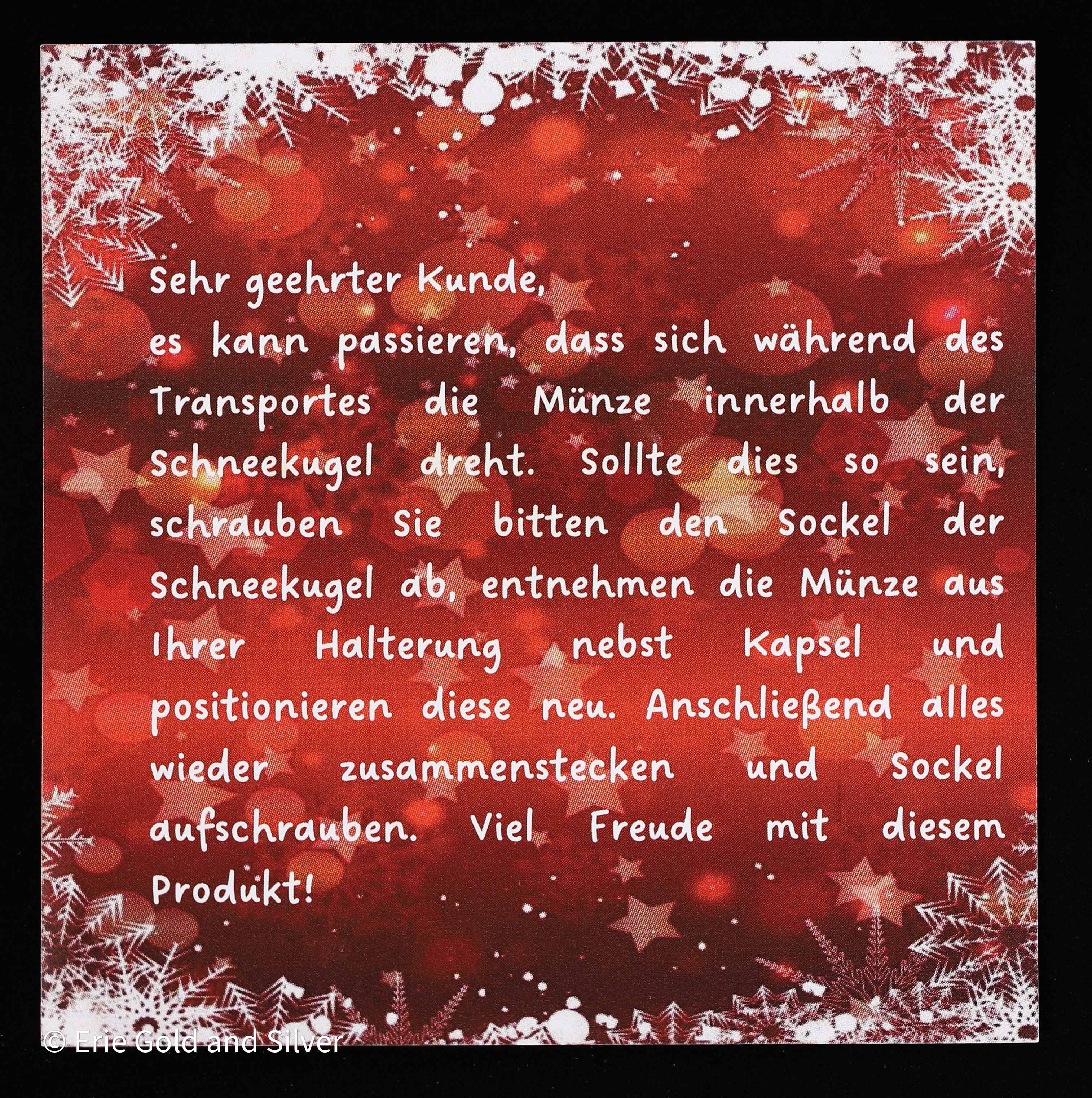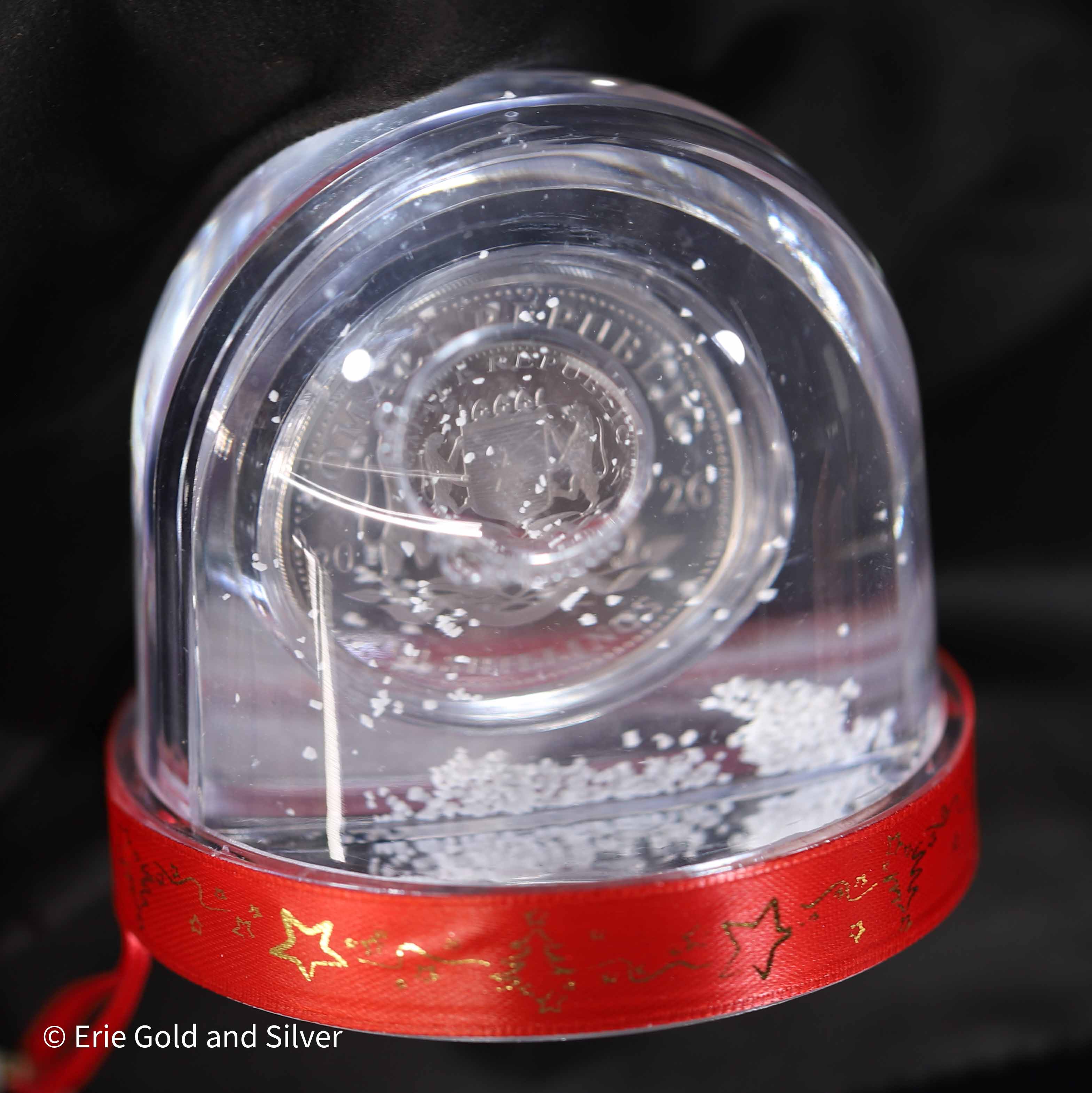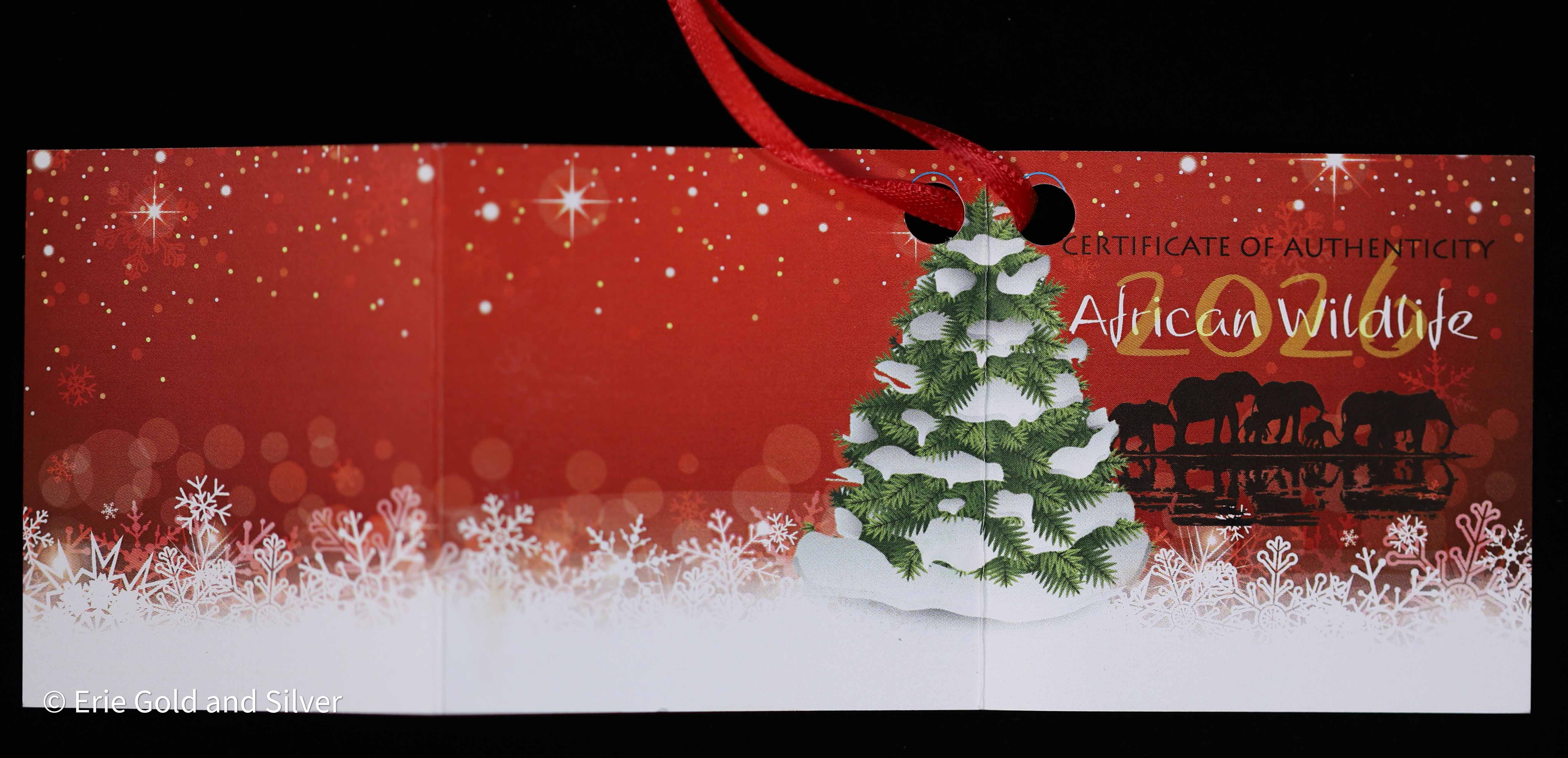 Issued by Somalia in 2026, this Colorized Elephant coin contains 1 oz of fine silver and is presented in a festive Christmas snowglobe display. Combining the popular Elephant design with seasonal packaging, this release appeals to collectors of wildlife silver, holiday-themed issues, and specialty presentation pieces.