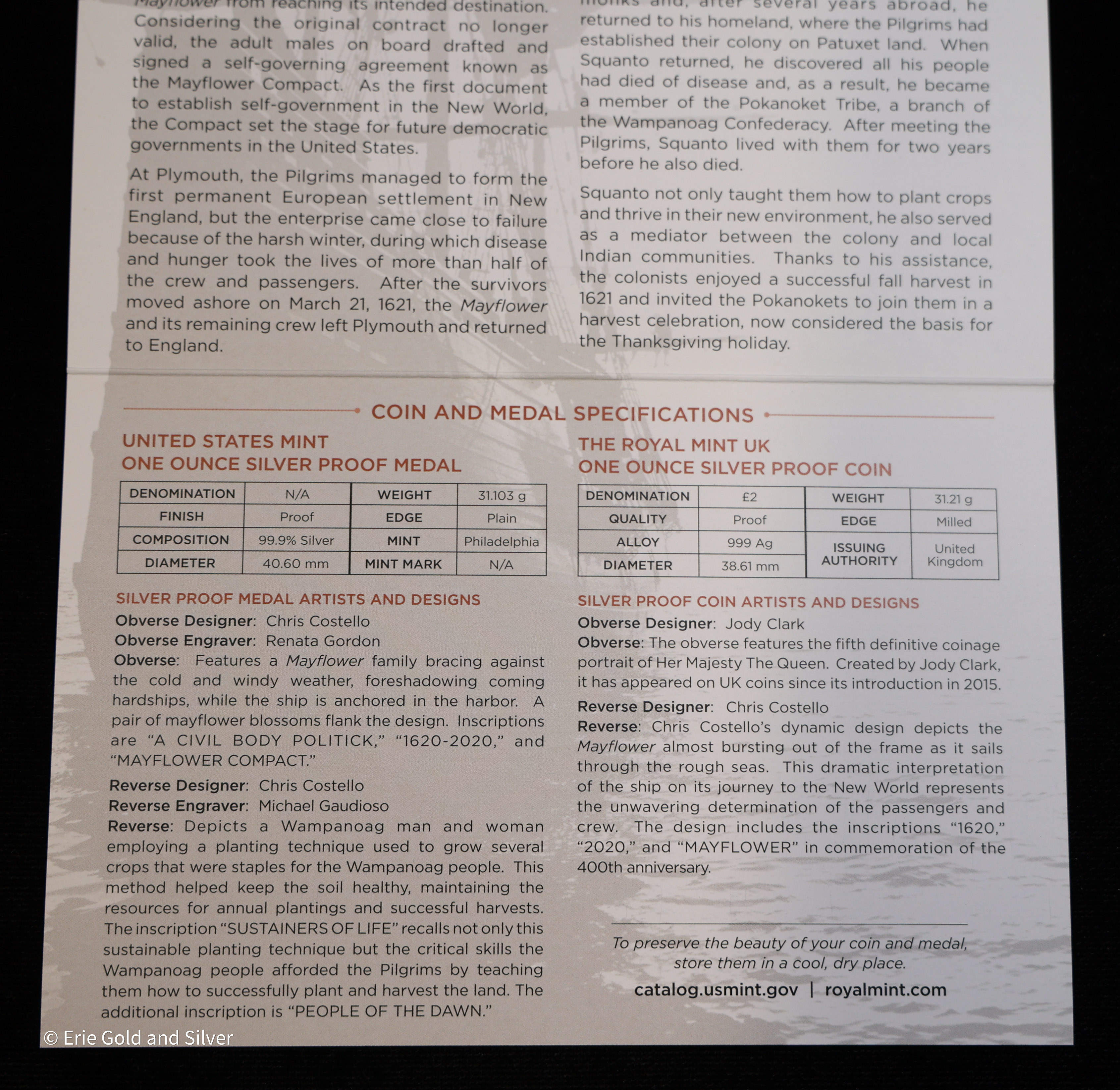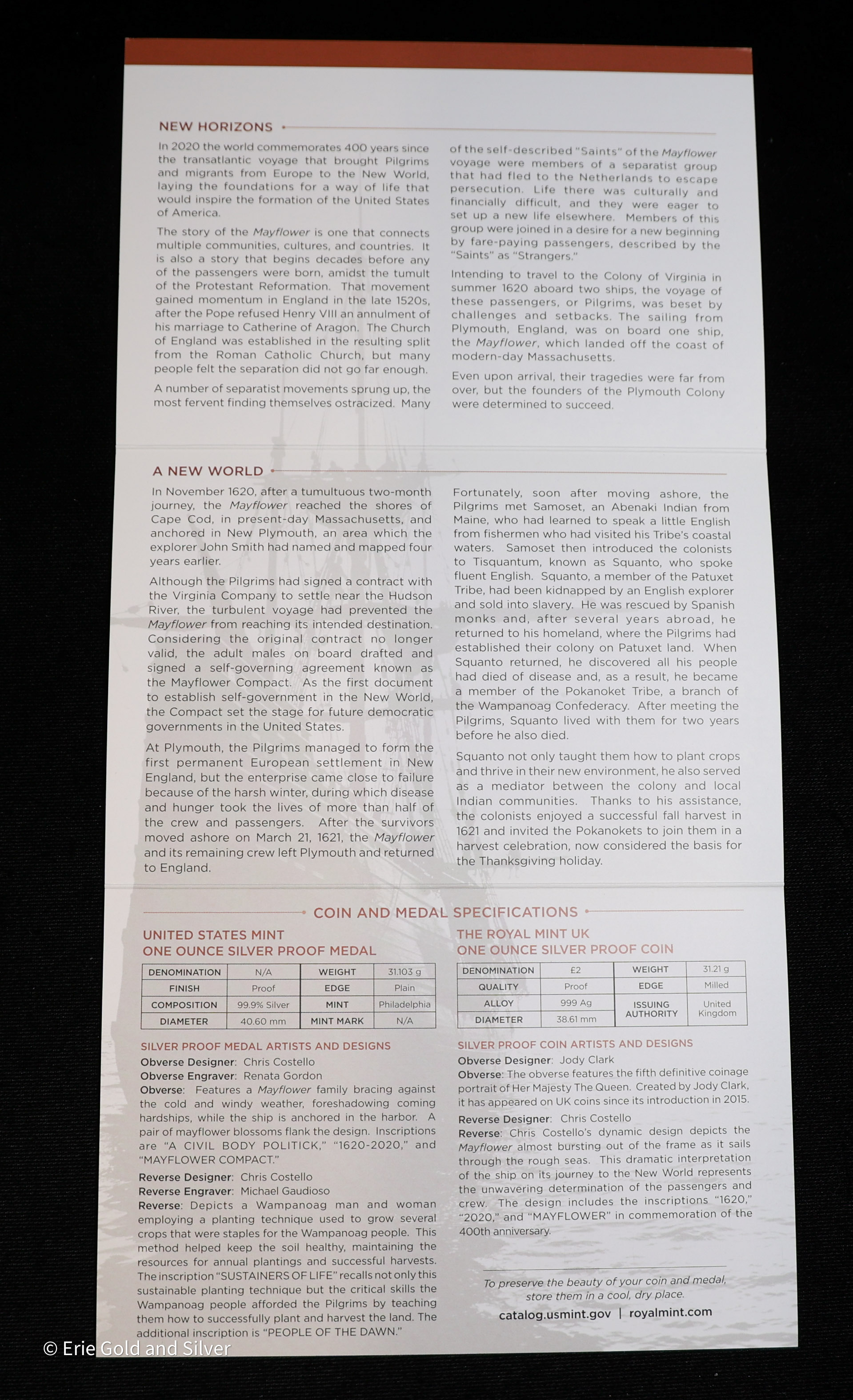 Commemorate a historic journey with the 400th Anniversary of the Mayflower Voyage Silver Proof Coin & Medal Set, a unique collaboration between the U.S. Mint and Royal Mint. This elegant set includes a 1 oz .999 fine silver UK proof £2 coin depicting the Mayflower, paired with a 1 oz .999 fine silver U.S. reverse‑proof medal showing Pilgrims and Wampanoag figures. Housed in matching presentation packaging with a numbered Certificate of Authenticity, this limited-edition set beautifully intertwines British and American commemorative artistry.