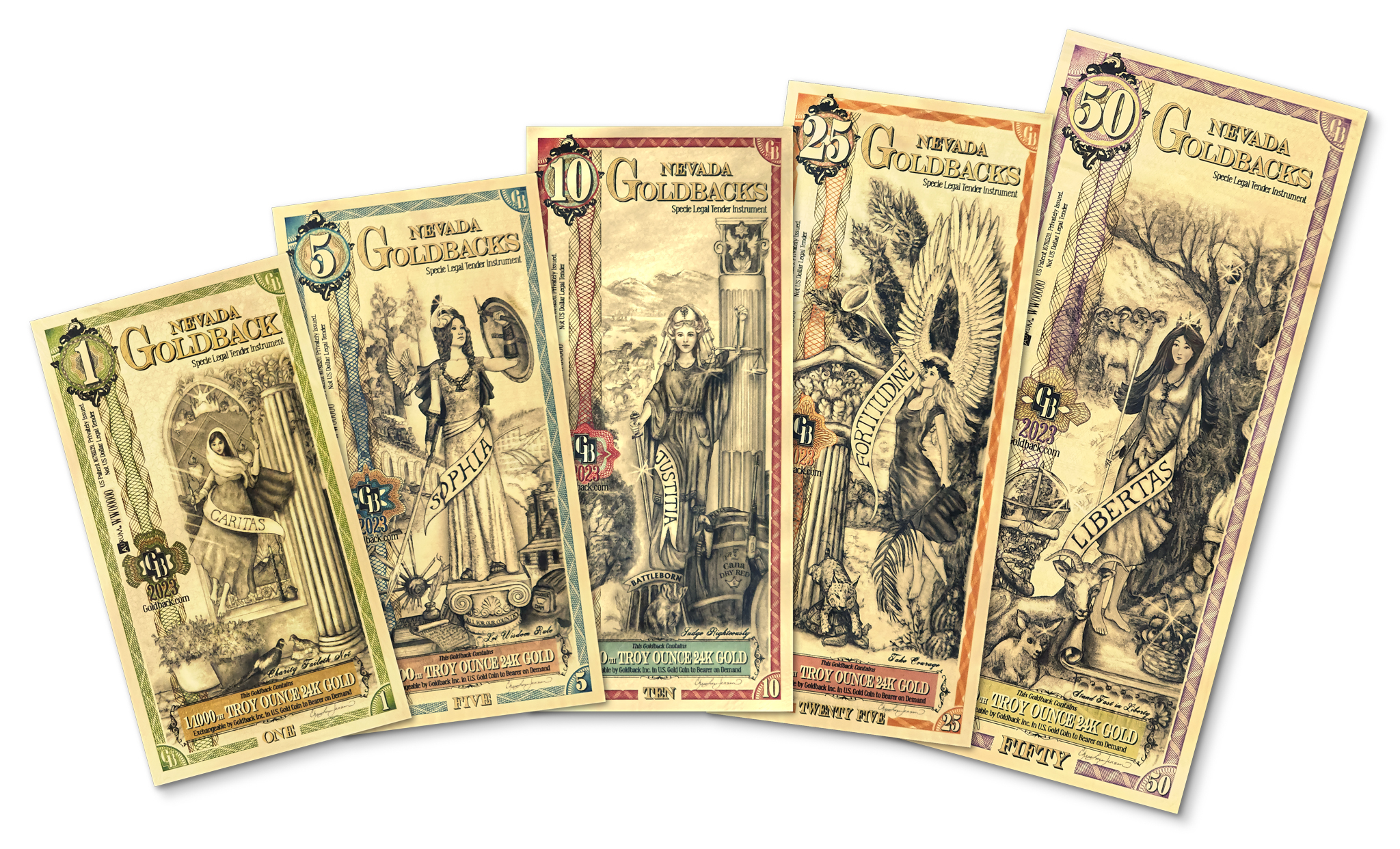The Nevada Goldback is a voluntary, gold-backed currency designed for use in Nevada. Each note contains a precise amount of 24-karat gold, making it a practical and beautiful way to own and use real gold. Accepted by participating businesses, Nevada Goldbacks offer a unique way to engage in transactions using sound money.