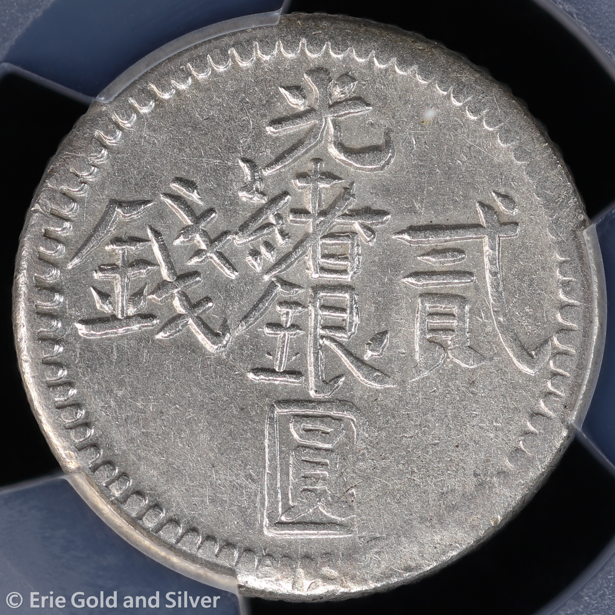 For sale is a AH1310 (1893) China Sinkiang 2 Mace Silver Coin. Certified / graded by PCGS at Genuine AU Detail.