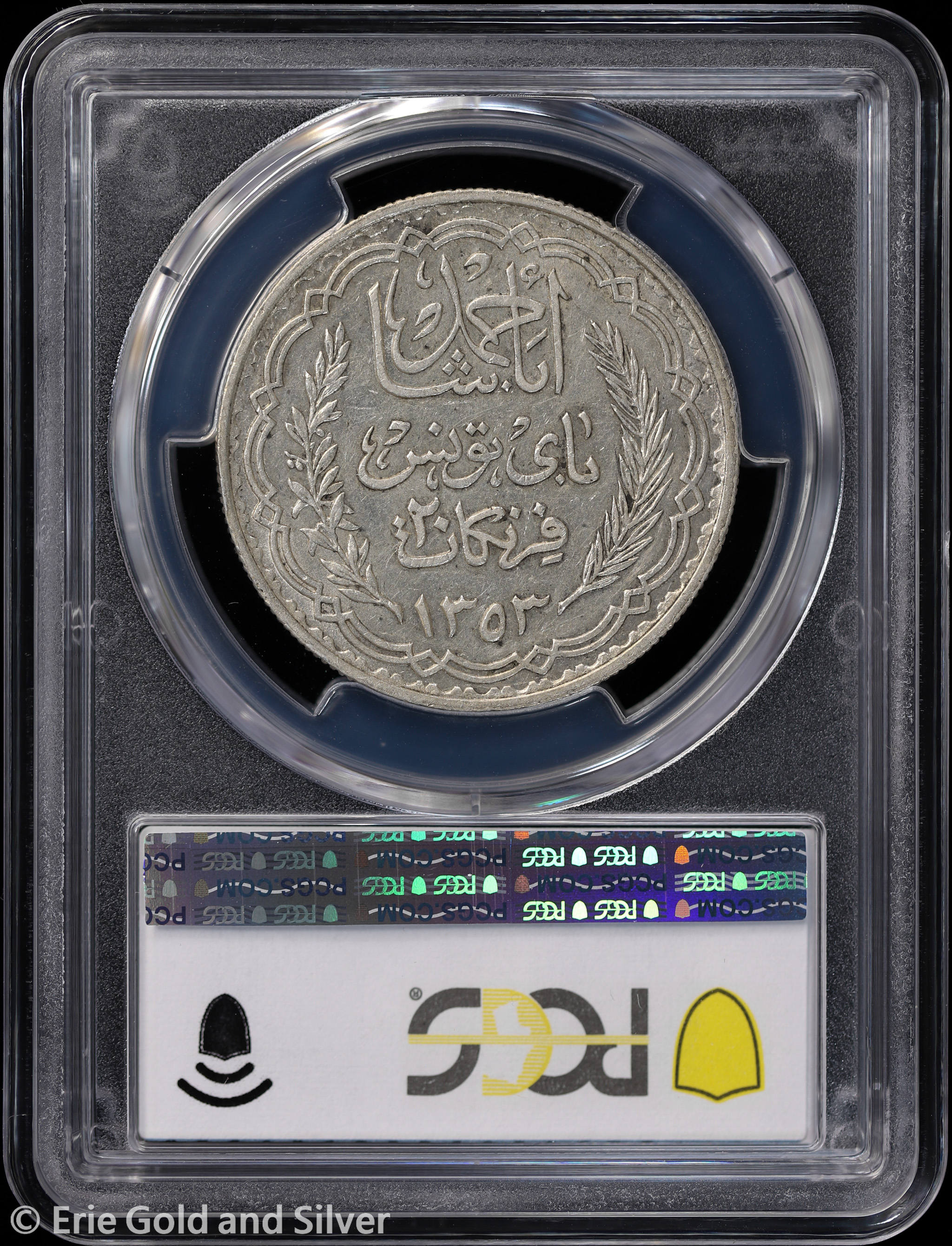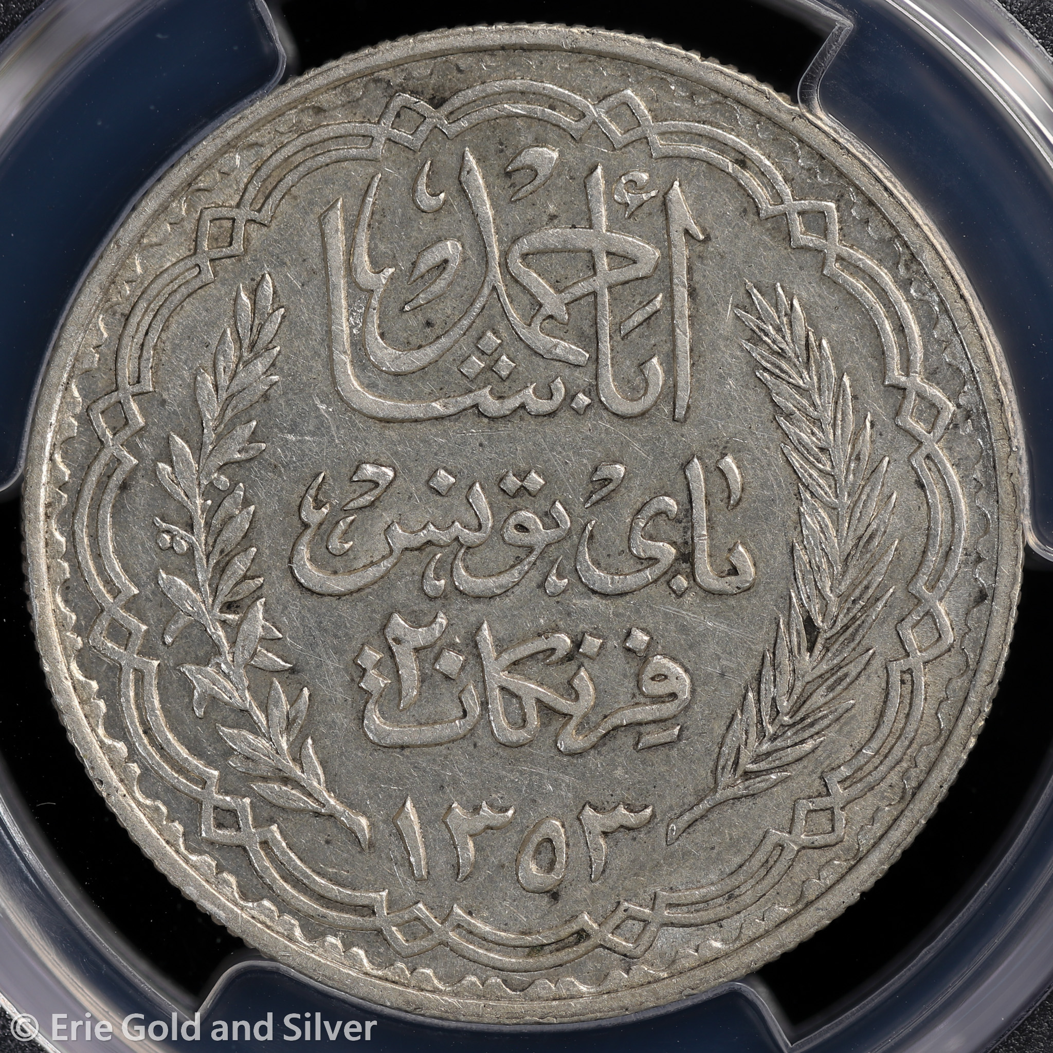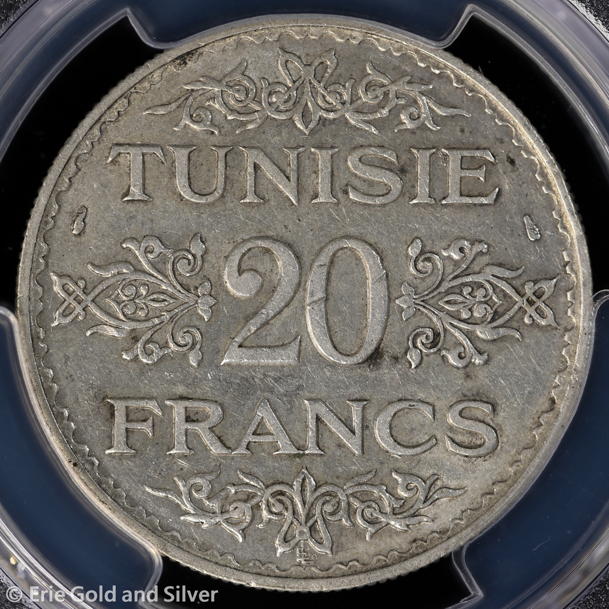 For sale is a AH1353 (1934) Tunisia Silver 20 Francs. Certified / graded by PCGS at AU 55.