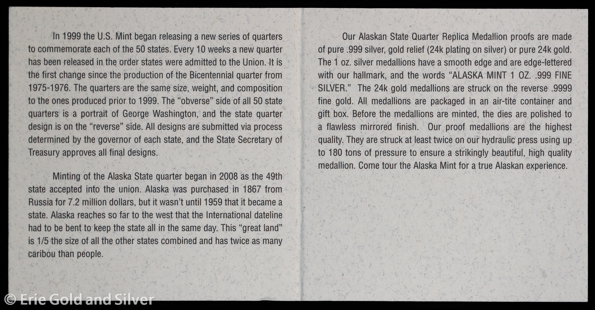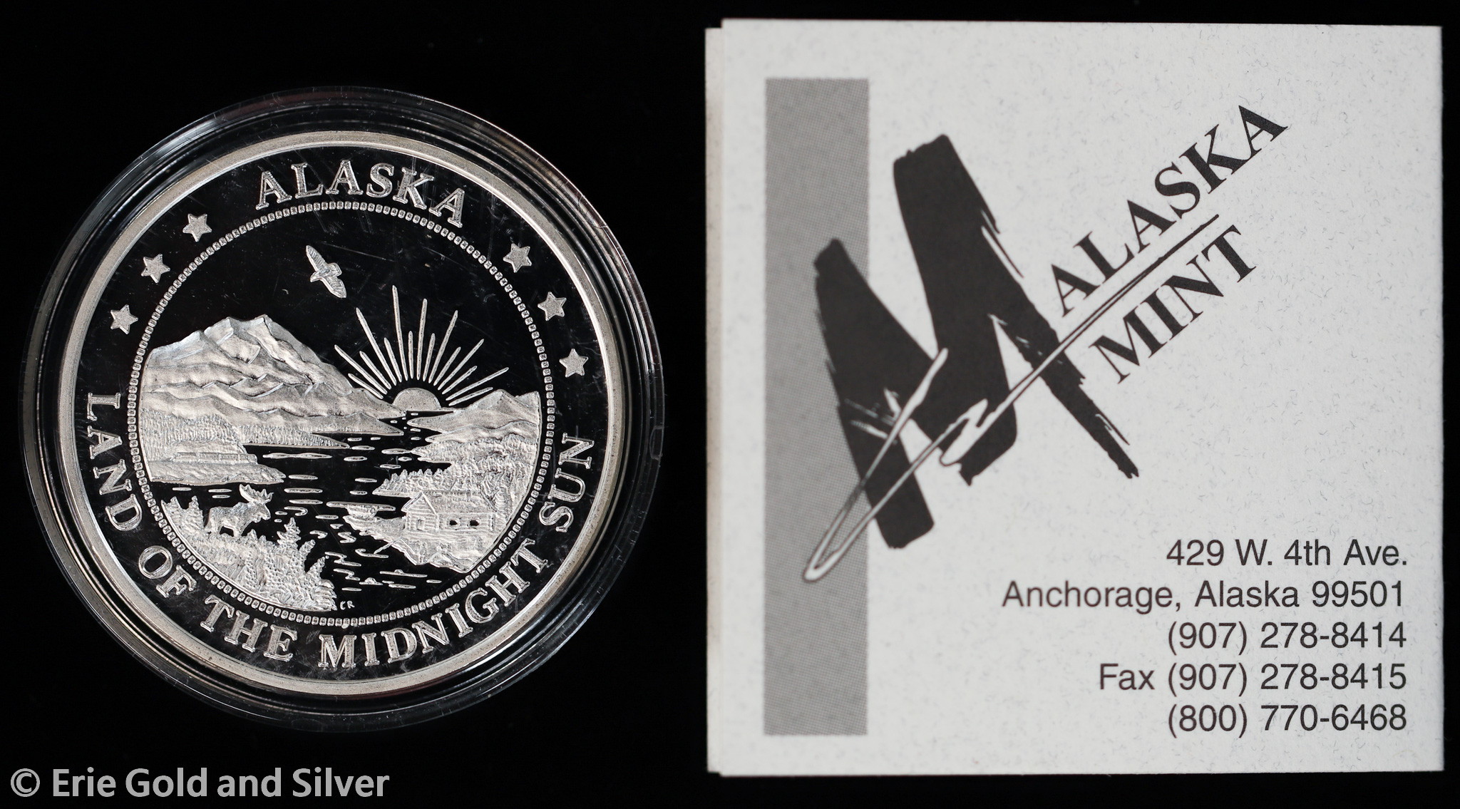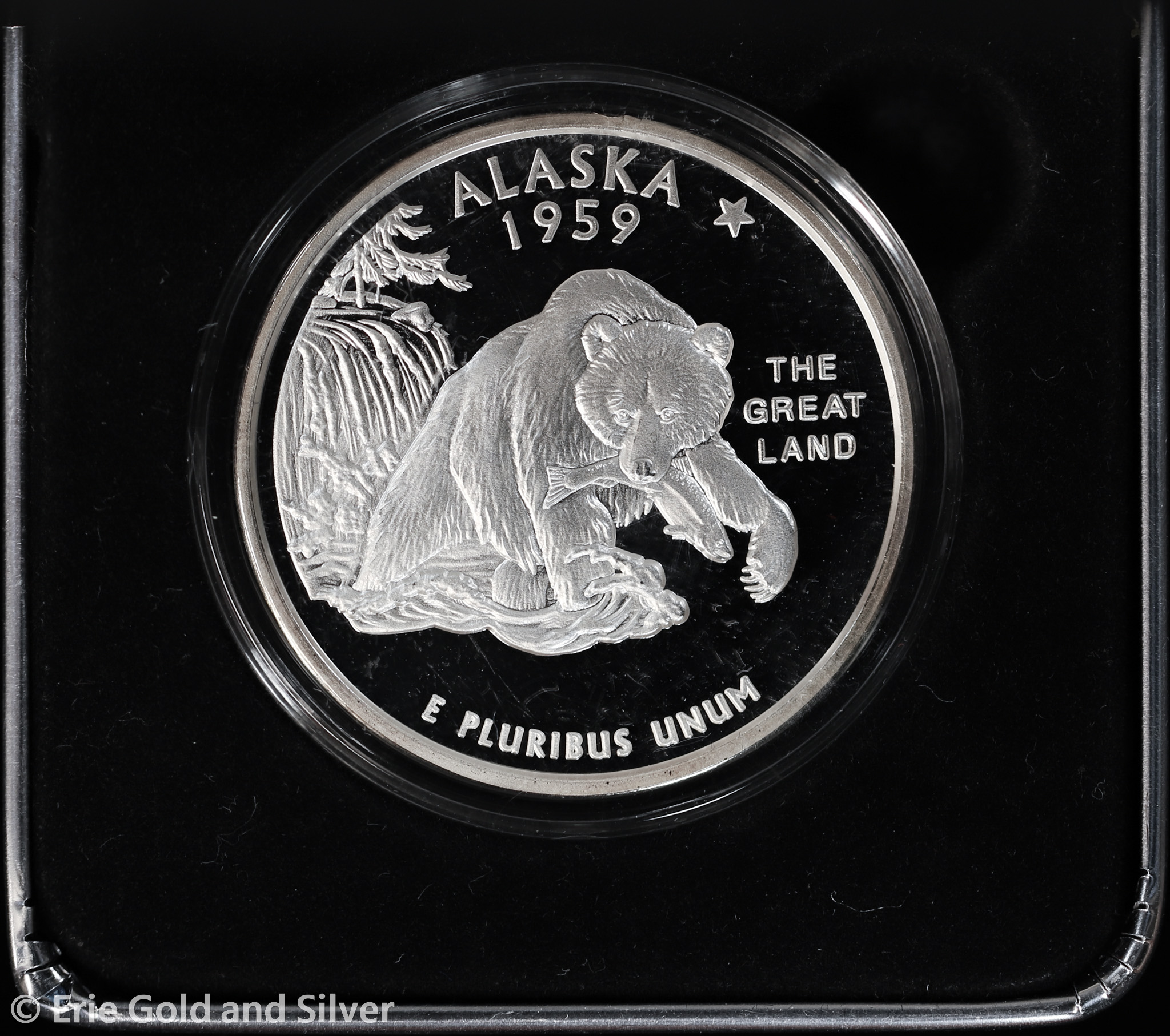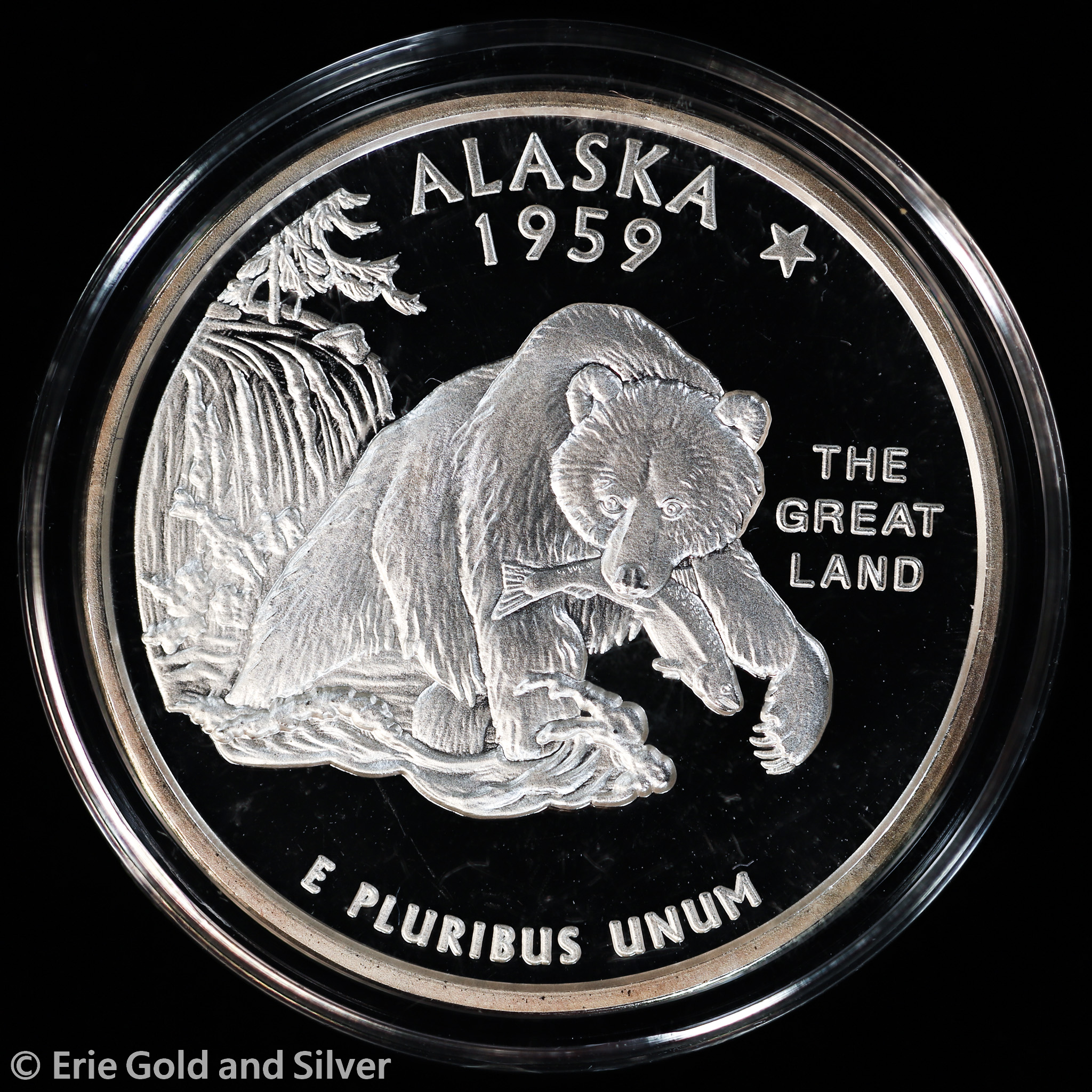 For sale is a Alaska Mint Grizzly Bear State Quarter Pattern 1 oz Silver Proof Medallion in Box.