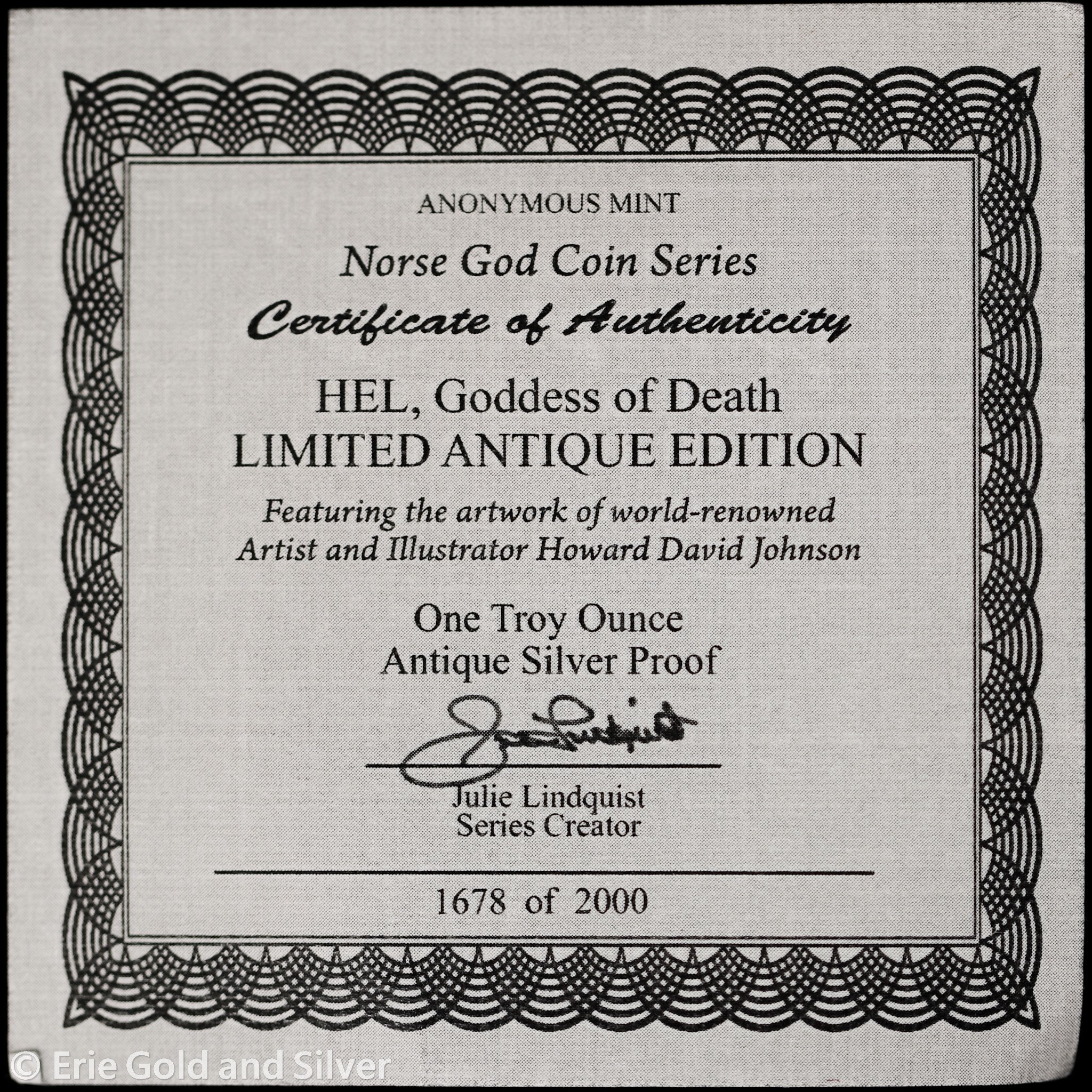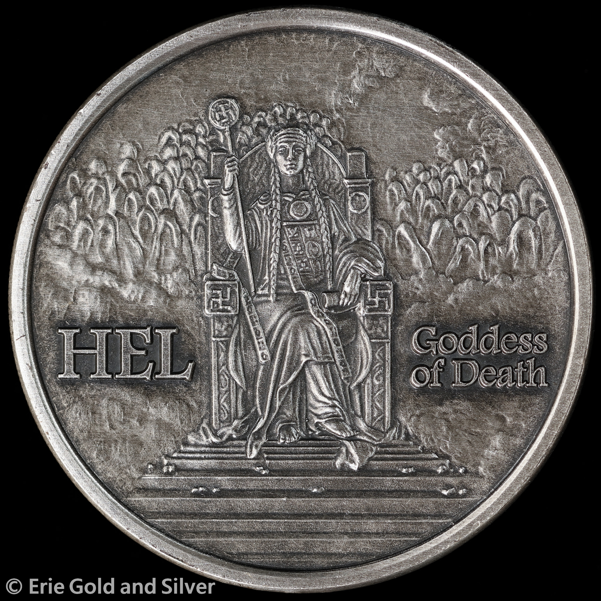 For sale is an Anonymous Mint Norse Gods Series - Antiqued Hel, Goddess of Death 1 oz Silver Round w/ COA.