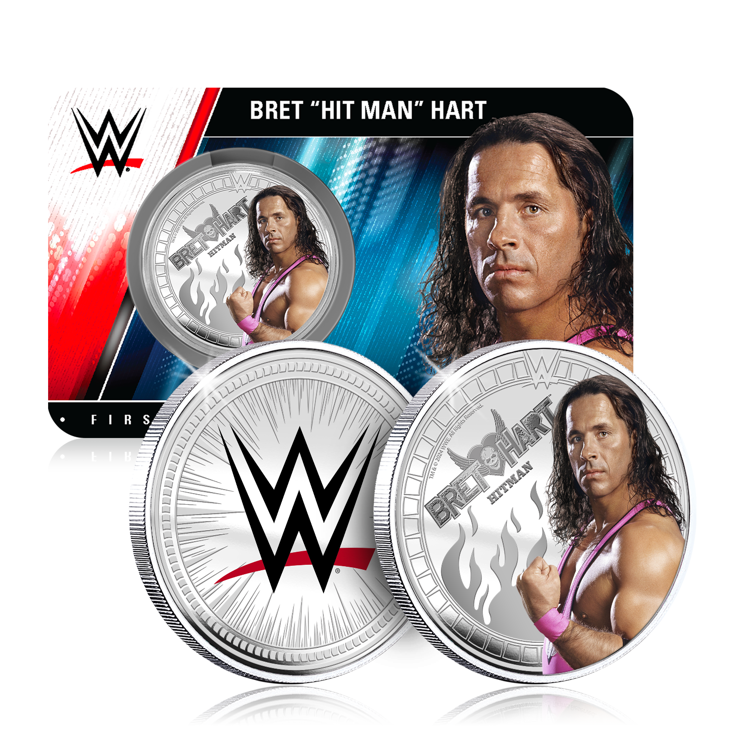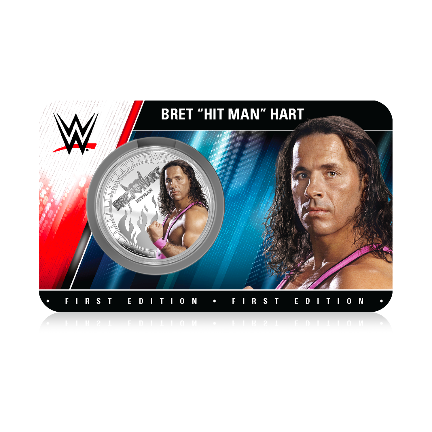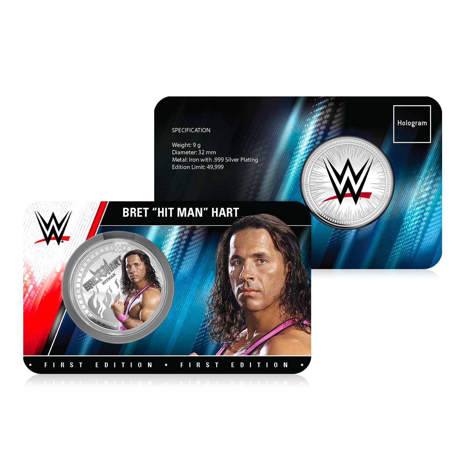 For sale is a Bret “Hit Man” Hart WWE Legends First Edition .999 Silverplated Medallion in card. View pictures for details and condition. Bret "The Hitman" Hart is a WWE Hall of Famer known for his technical wrestling mastery and five WWE Championship reigns. His career was marked by classic matches, a real-life controversy in the Montreal Screwjob, and a lasting influence on wrestling storytelling. “The Best There Is, The Best There Was, and The Best There Ever Will Be”-Bret "Hit Man" Hart.