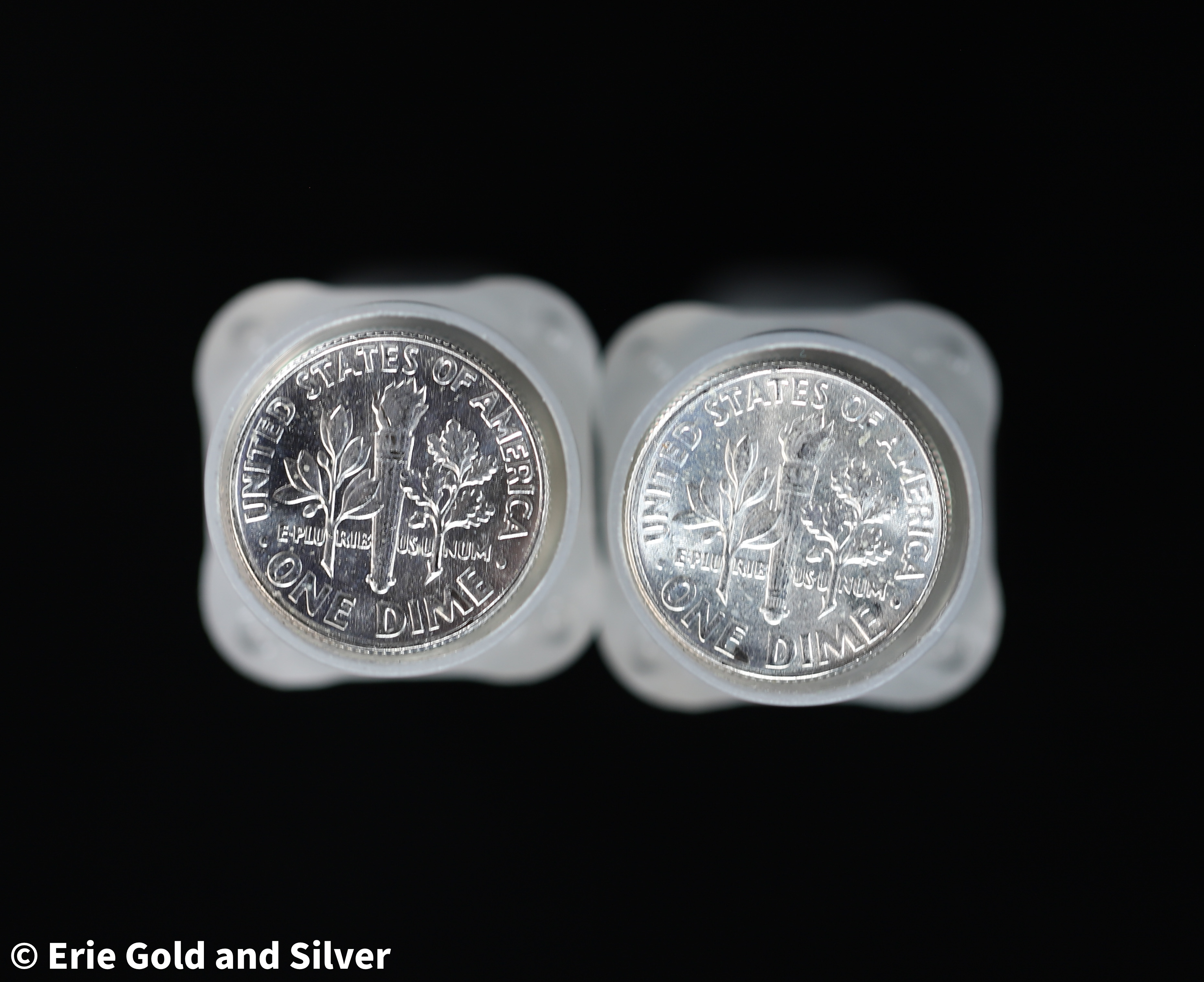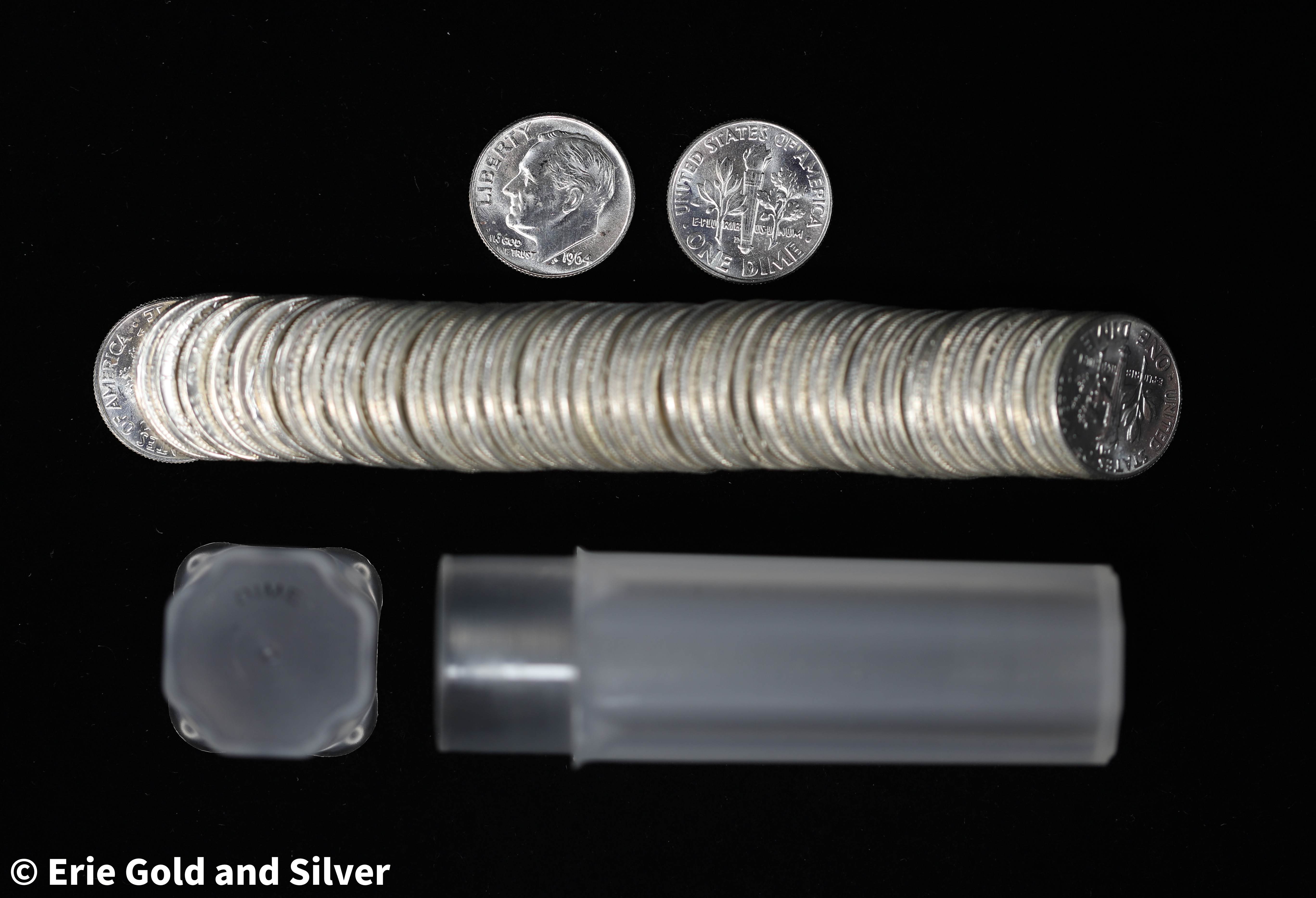 This roll contains 50 Brilliant Uncirculated Roosevelt Dimes, each struck in 90% silver with a combined silver weight of approximately 3.57 troy ounces total for the roll. These dimes are an ideal choice for precious metal investors, collectors seeking high-quality vintage coins, or anyone looking to own a piece of mid-century American history. These come in 50 count tubes, paper rolled wrappers, or shotgun rolls at random.