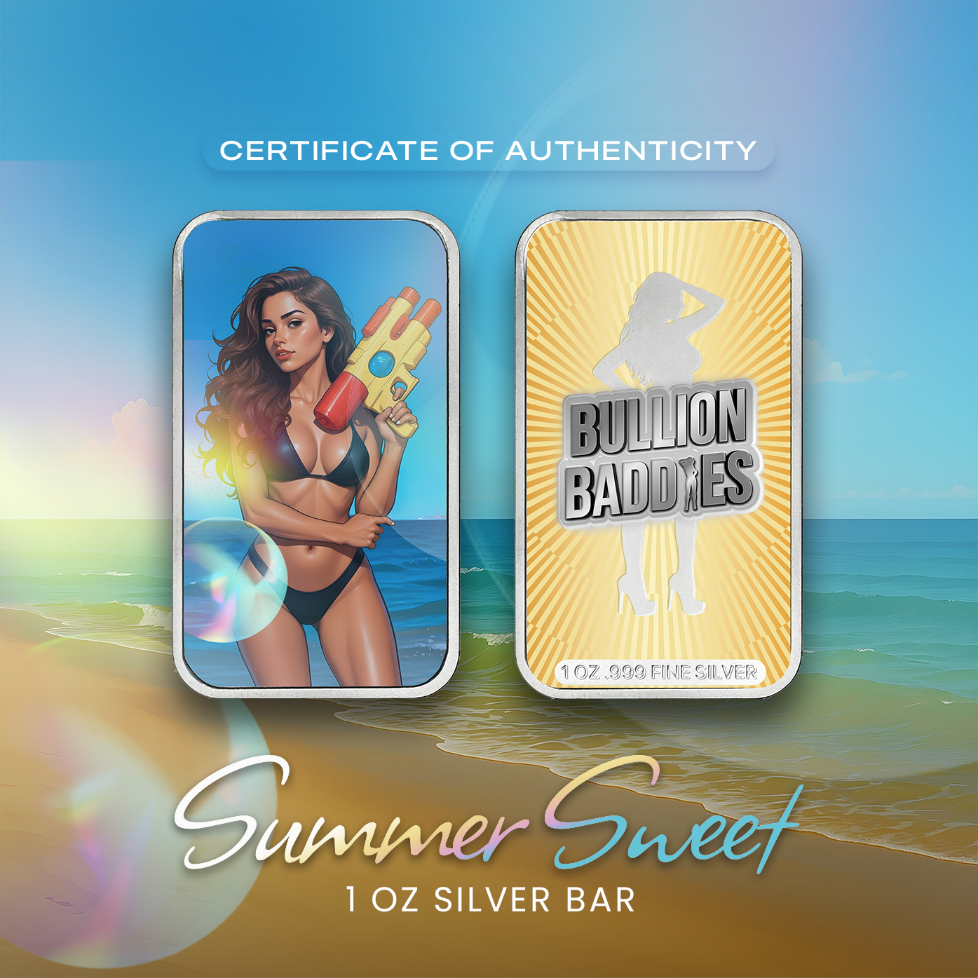 Turn up the heat on your stack with the Bullion Baddies Series 6: Summer Sweet Edition! Struck from 1 oz of .999 fine silver, this limited-edition bar features vibrant, full-color artwork that captures the playful and bold spirit of the Bullion Baddies collection. Each bar comes sealed for protection, preserving its eye-catching design and silver brilliance. A perfect blend of art, attitude, and bullion, this piece is a must-have for fans of modern silver collectibles and the ever-growing Bullion Baddies series.