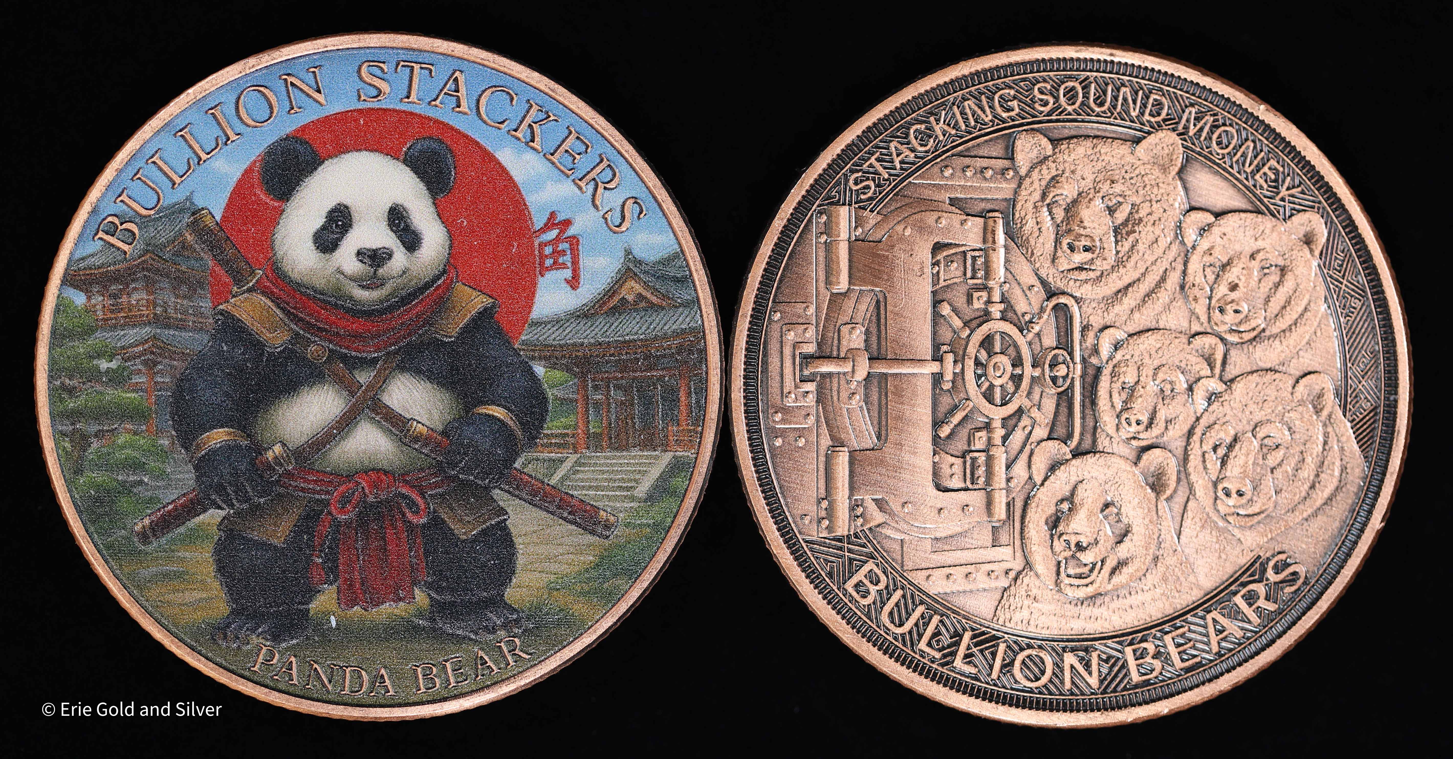This Bullion Stackers Panda Bear round contains 1 oz of copper and features a colorized panda design. Blending classic animal imagery with a modern bullion-style format, this piece appeals to collectors of themed copper rounds, stackable designs, and novelty bullion collectibles.