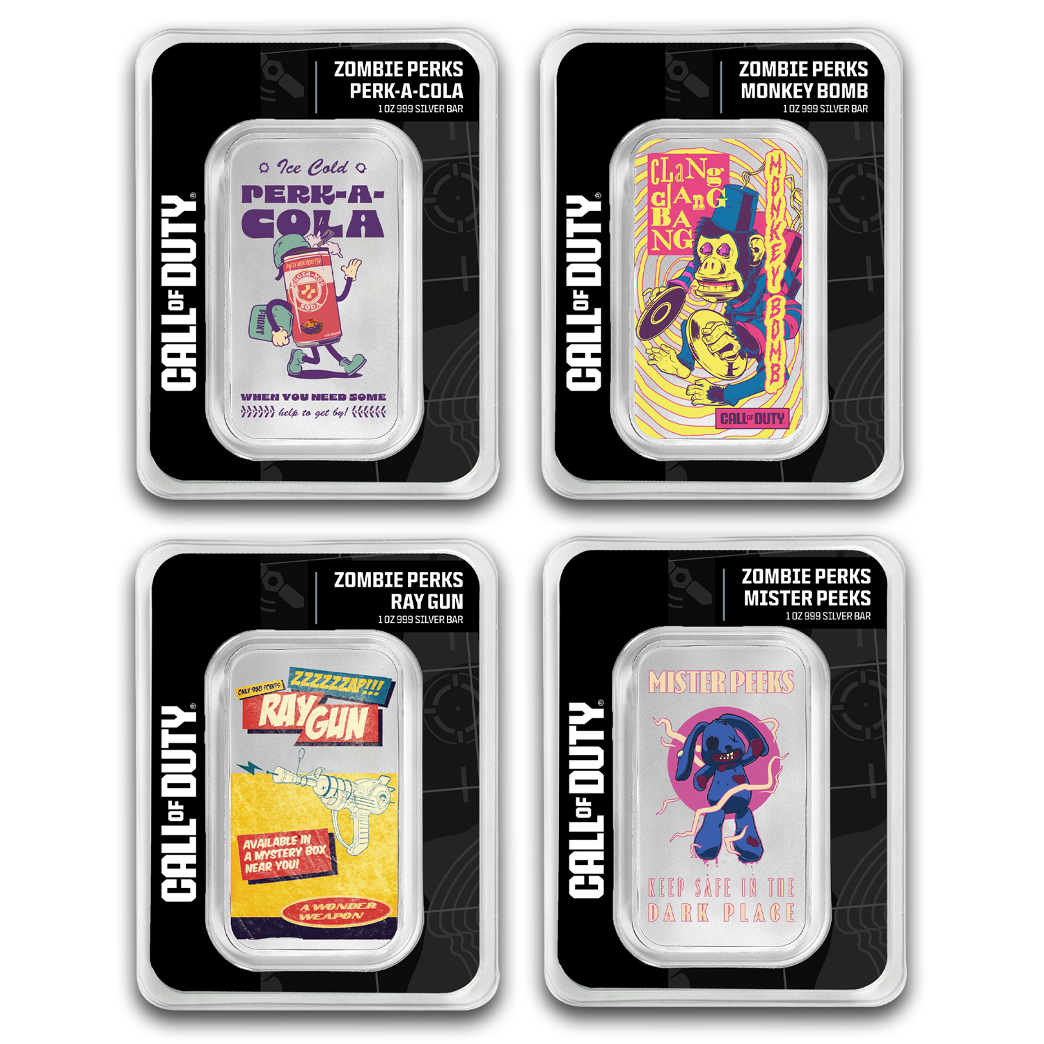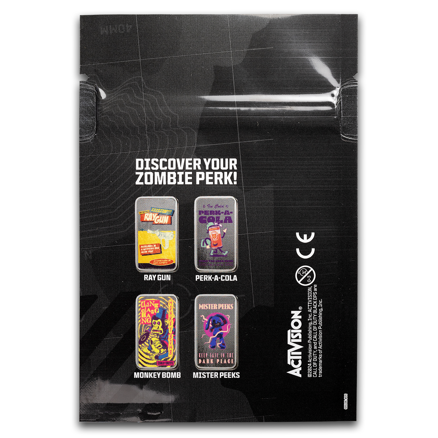 Dive into the thrilling world of Call of Duty™ Zombies with the 2025 PAMP Suisse 1 oz Silver Zombie Perks Mystery Pack. Each pack contains a 1 oz .999 fine silver bar, celebrating the iconic Zombie mode’s Perk-a-Cola system. Featuring one of four vibrant, colorized reverse designs—Ray Gun (700 mintage), Perk-a-Cola (1,400 mintage), Mister Peeks (2,800 mintage), or Monkey Bomb (2,100 mintage)—this limited-edition collectible, with a total mintage of 7,000, is a surprise until opened. The obverse displays the Call of Duty™ logo, weight, and purity. Packaged in tamper-evident packaging (TEP) within a sealed pouch, it’s perfect for gamers and collectors. Officially licensed, this Samoa legal tender bar is a must-have for fans of the undead saga.