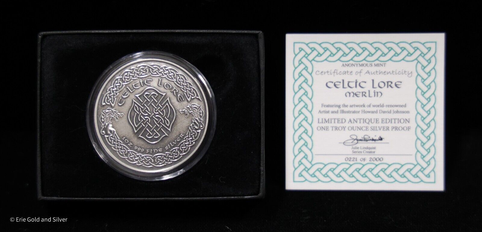 Celtic Lore Merlin Antique 1 oz Silver Round in Box w/ COA