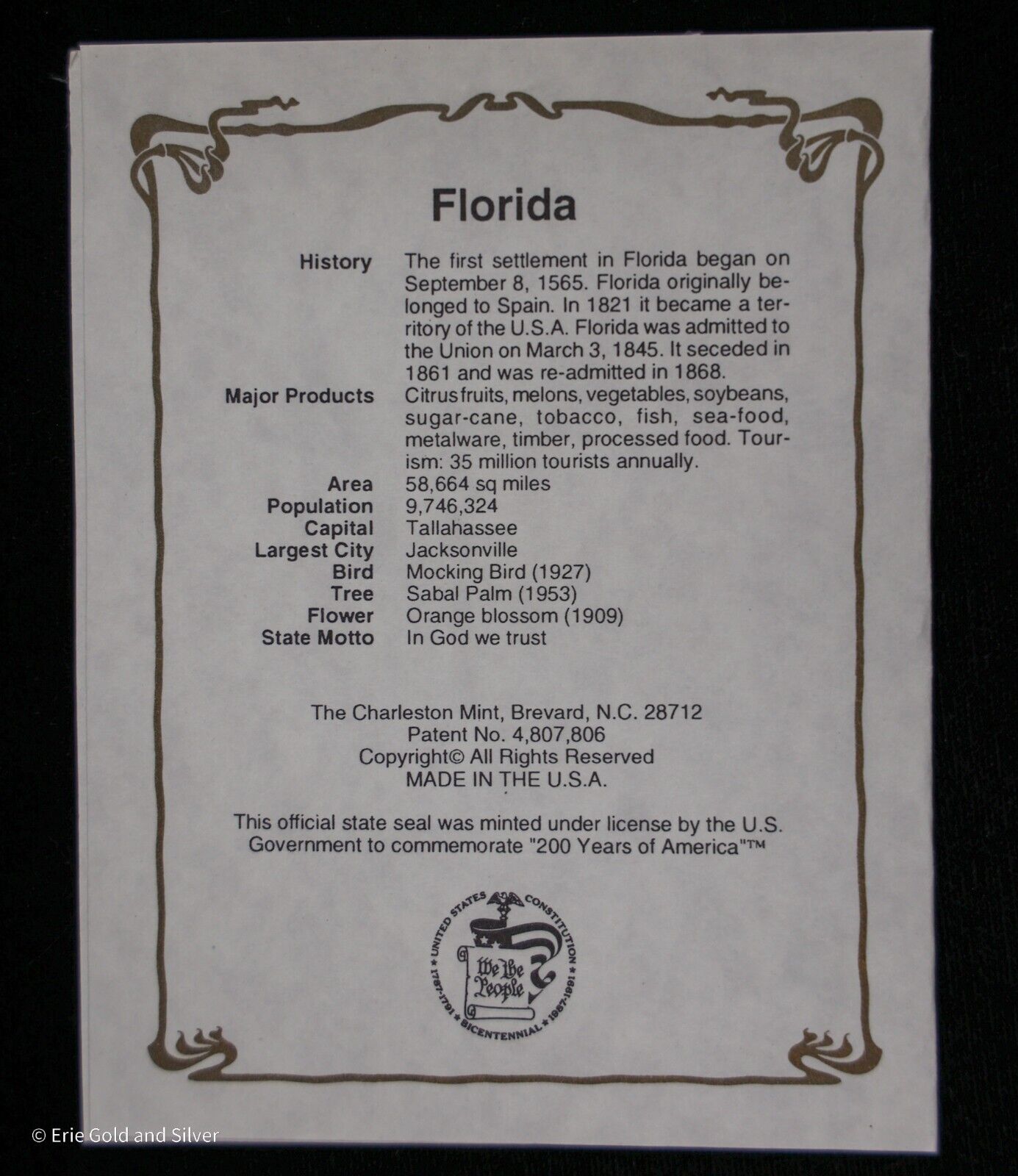 Charleston Mint Solid Bronze Great Seal of Florida/United States Coin