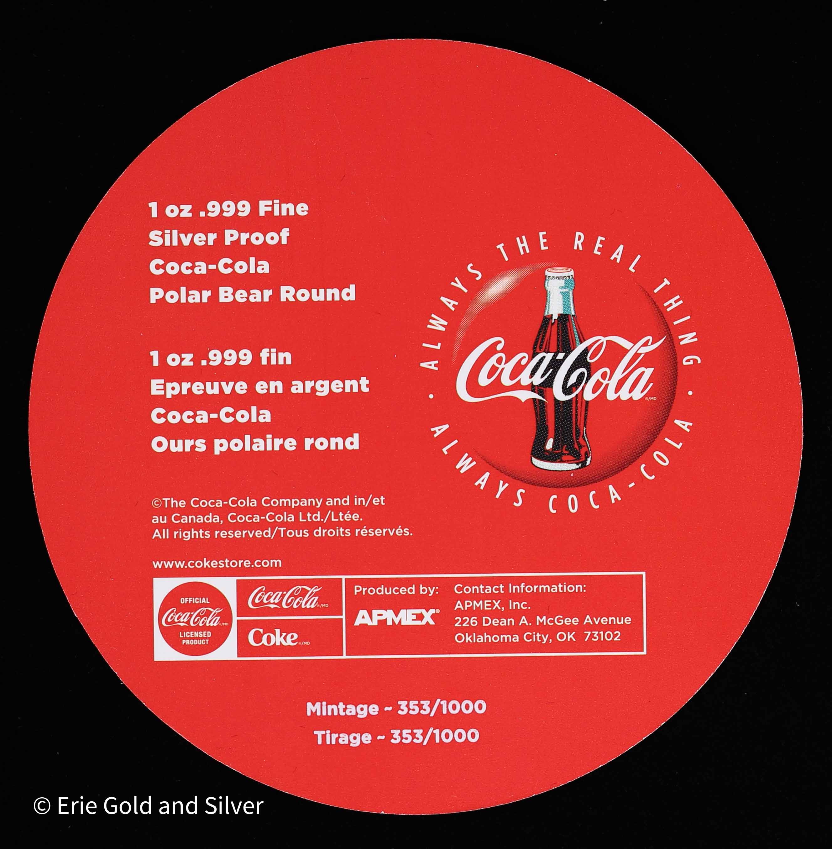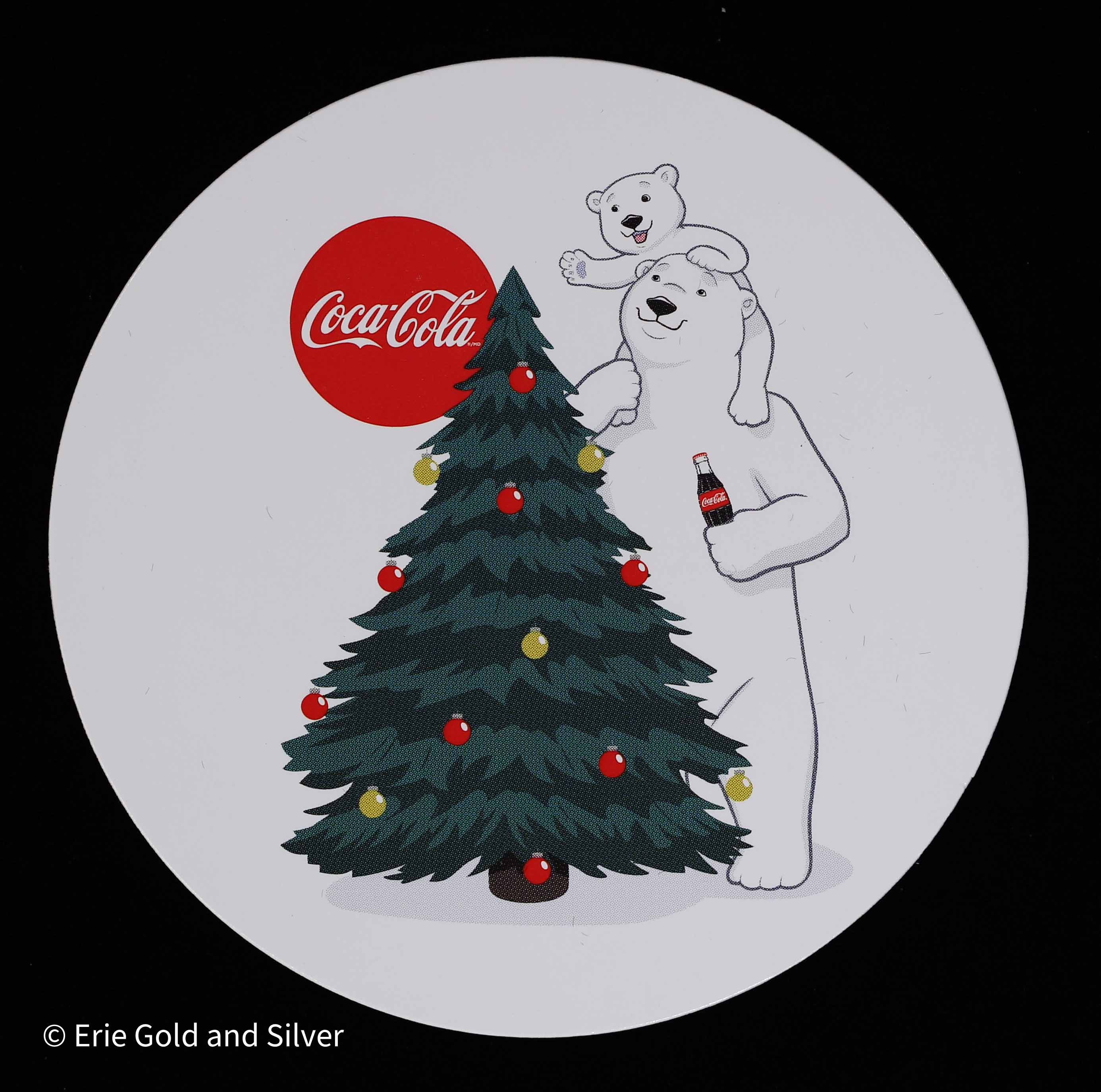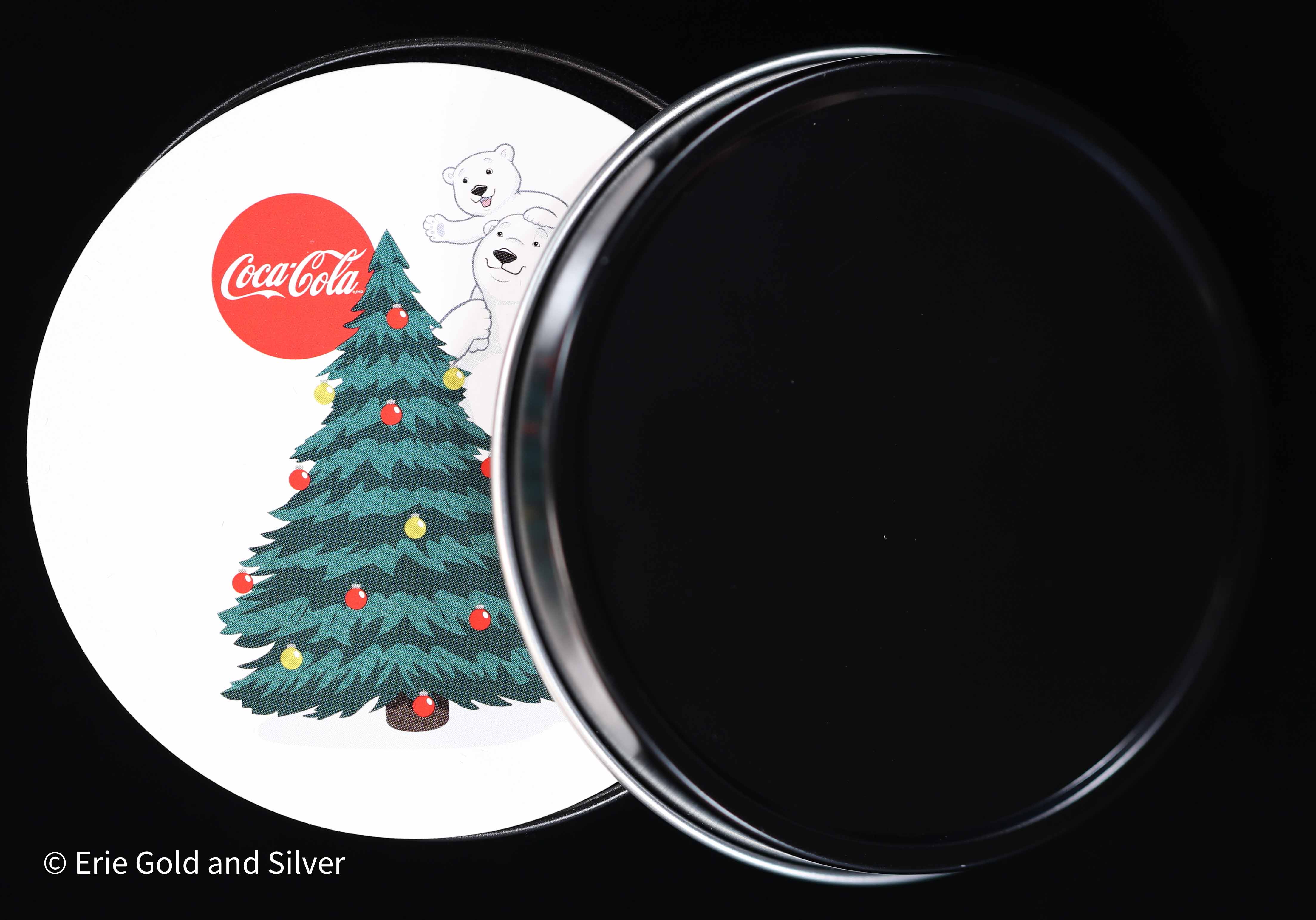This Coca-Cola Christmas Tree Polar Bear piece contains 1 oz of fine silver and is presented in a themed tin. Showcasing the iconic Coca-Cola polar bear in a festive holiday setting, this release appeals to collectors of branded silver, seasonal memorabilia, and Coca-Cola–themed collectibles.
