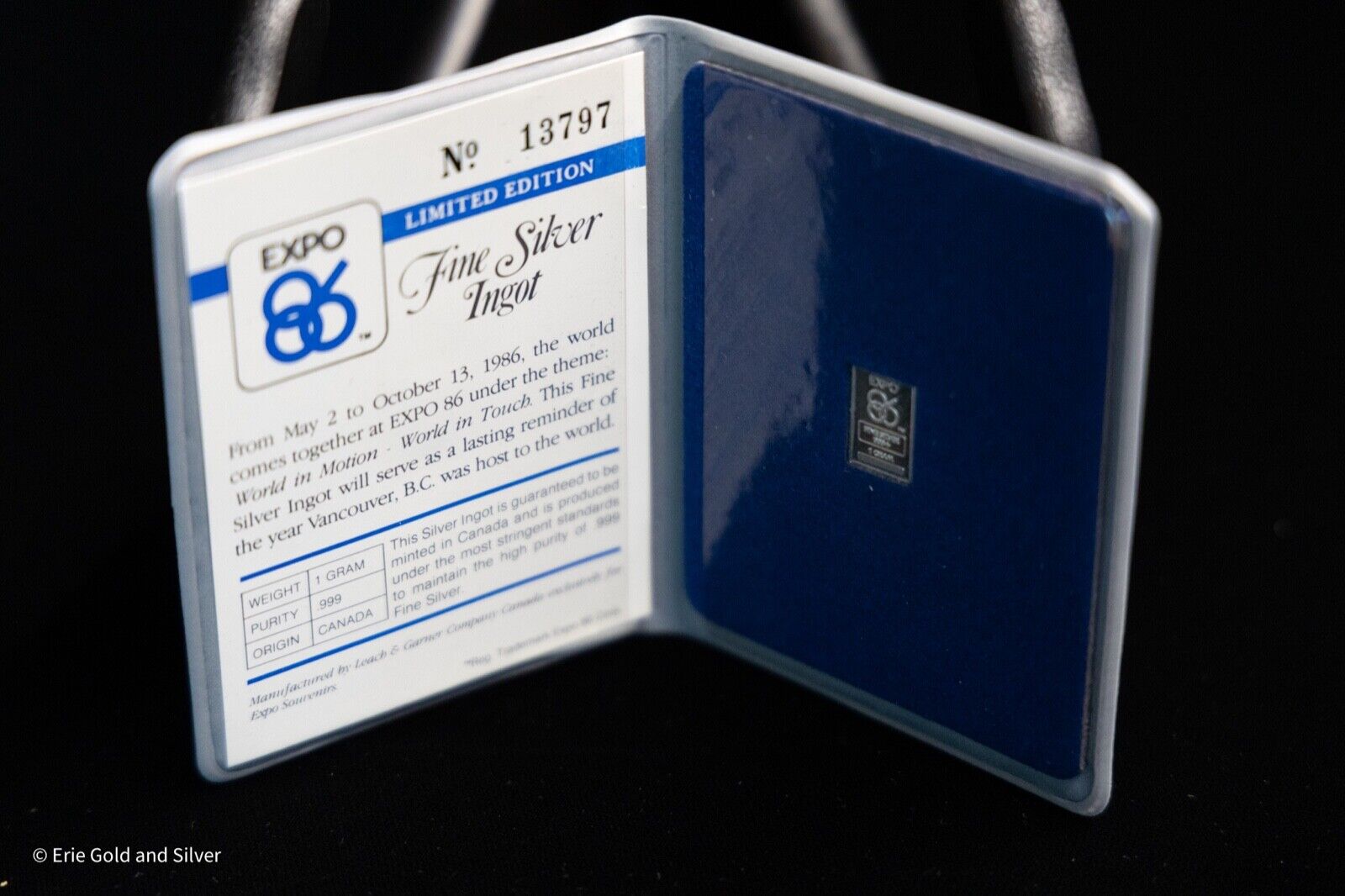 Expo 86 Limited Edition | Fine Silver Ingot | 1 Gram of .999 fine SLV | Canada