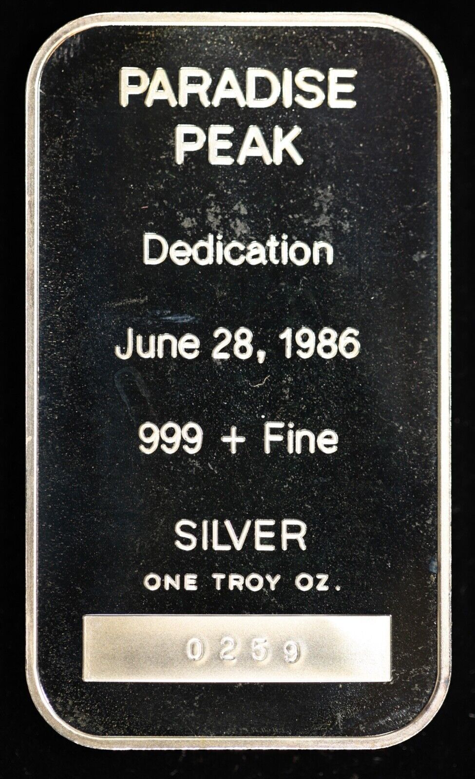 For sale is a FMC Paradise Peak Dedication June 28, 1986 1 oz Fine Silver Bar with Box. View pictures for details and condition, the coin pictured is the exact coin you will receive. Feel free to contact us with any questions.