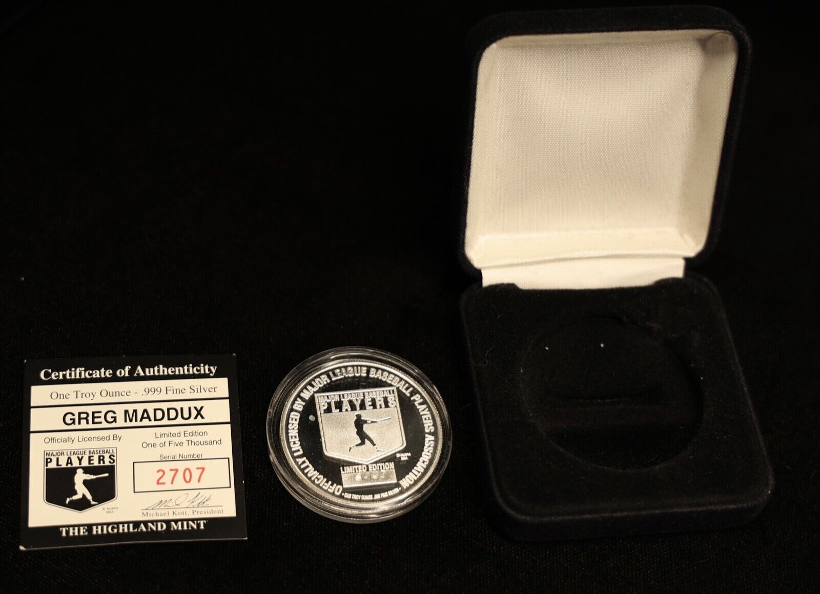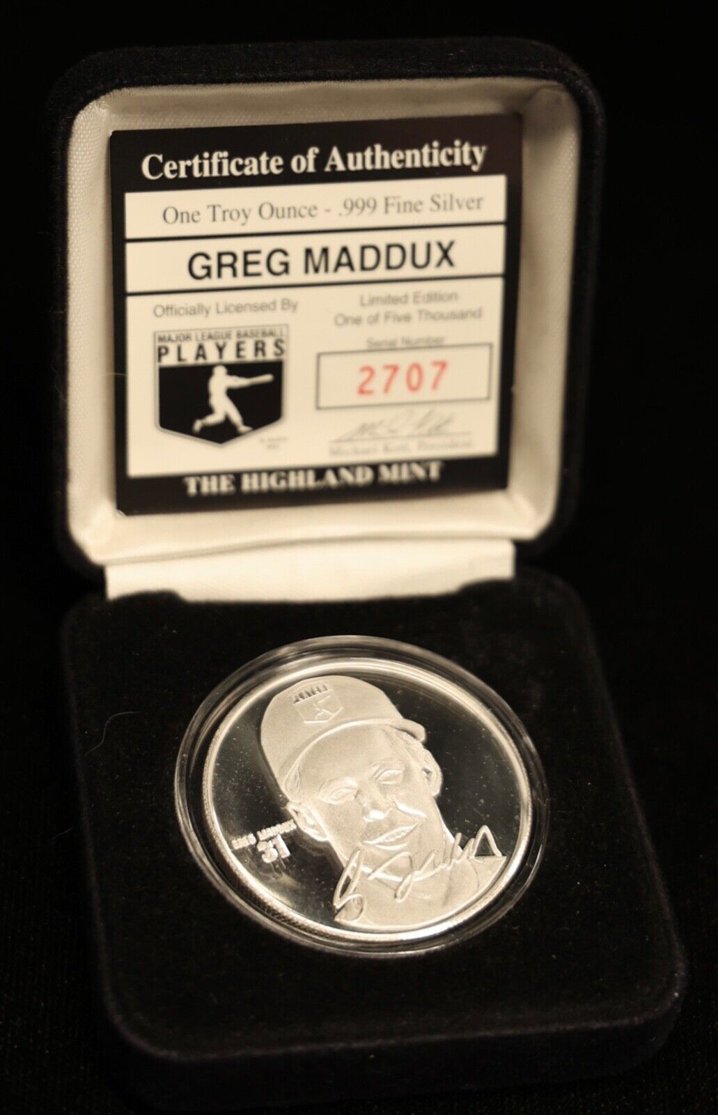 For sale is a Greg Maddux #31 Baseball 1 oz .999 Pure Silver Round Highland Mint #2707. View pictures for details and condition, the coin pictured is the exact coin you will receive. Feel free to contact us with any questions.