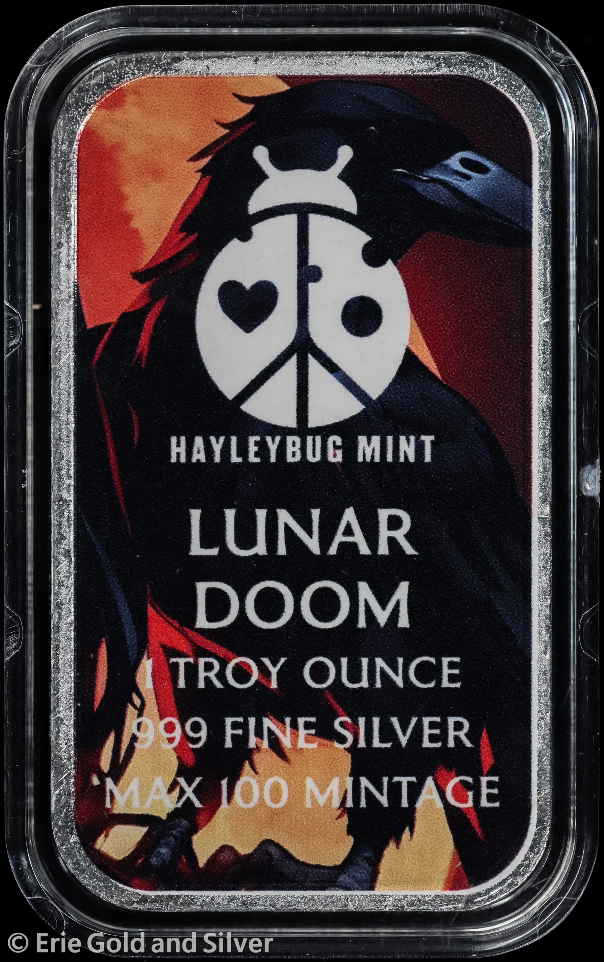 For sale is a Hayleybug Mint Lunar Doom 1 oz Silver Colorized Bar w/ COA.