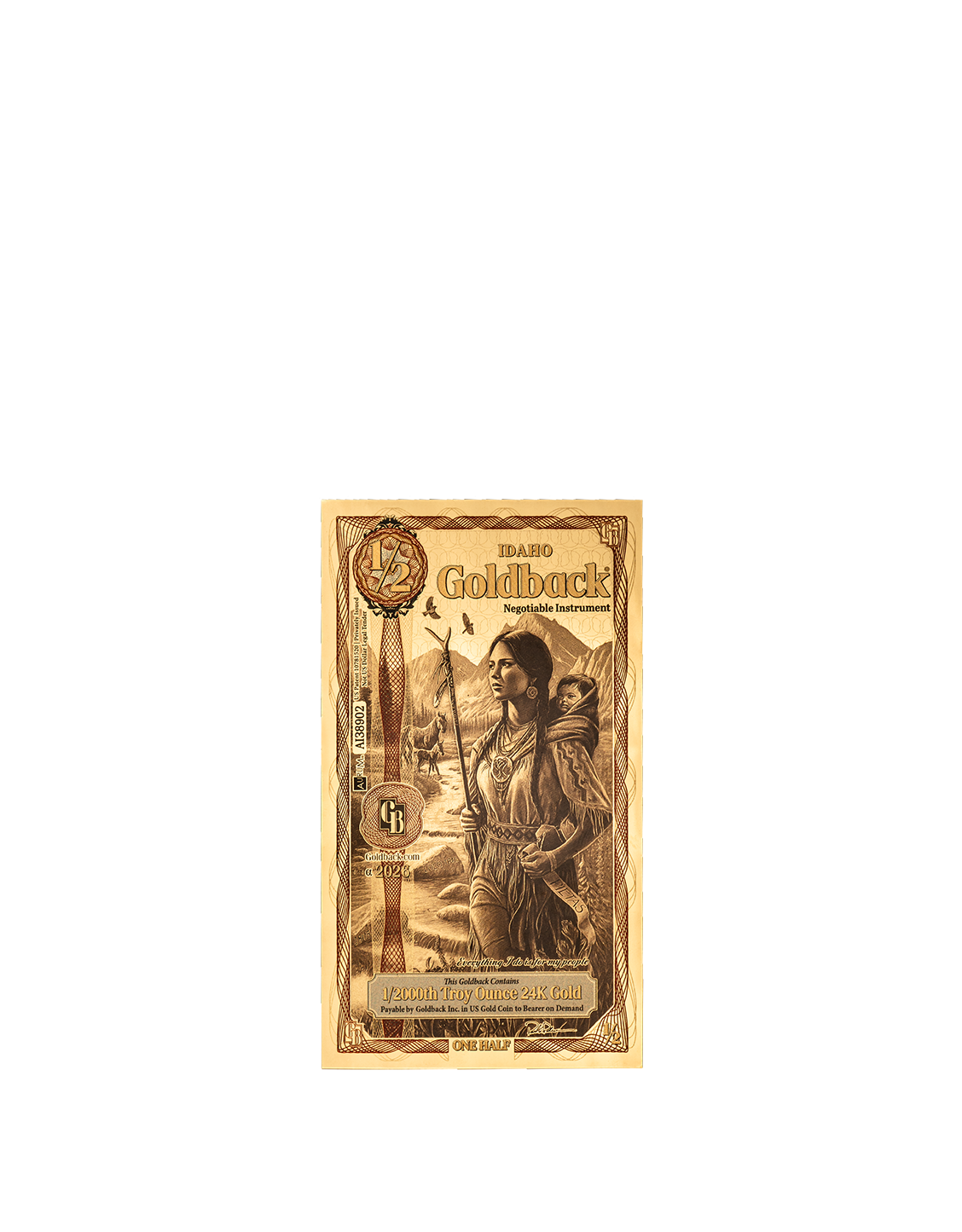 The Idaho 1/2 Goldback honors Pietas (Devotion) through the figure of Sacagawea, the Agaidika Shoshone woman born near Lemhi Pass in present-day Idaho. Her life reflects deep devotion to family, homeland, and people, most notably when she helped guide the 1805 expedition across the Rockies after reuniting with her brother and securing horses from the Shoshone. Depicted carrying her infant son, she symbolizes maternal strength and peaceful intent while serving as an interpreter, guide, and trusted advisor. The design features the Bitterroot Mountains, the Lolo Trail, and Idaho state symbols such as white pine, huckleberries, and mountain bluebirds, grounding her story in Idaho’s land and history. Inscribed below is her enduring principle: “Everything I do is for my people.”