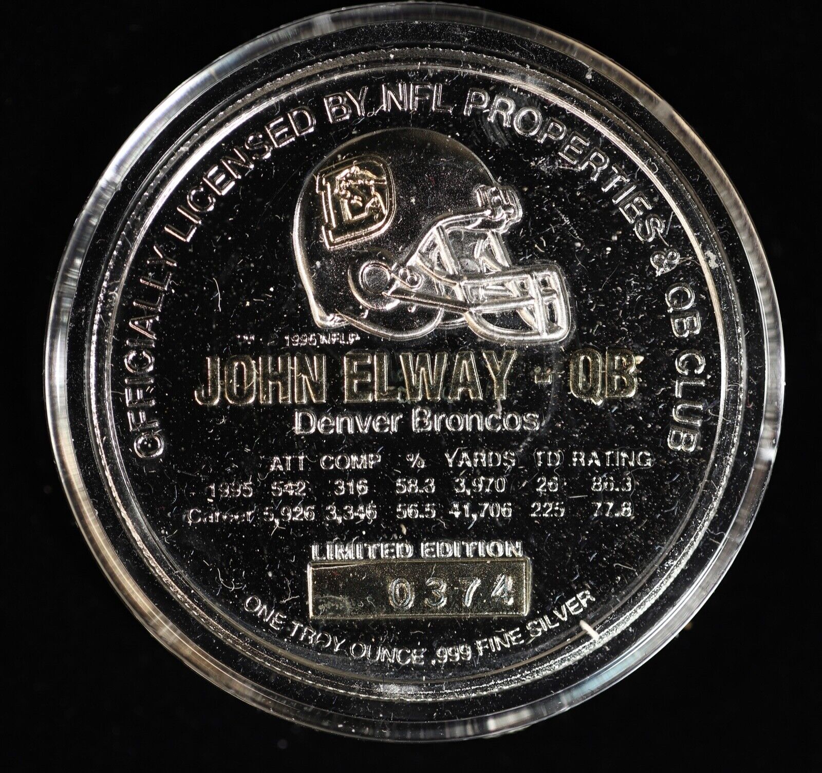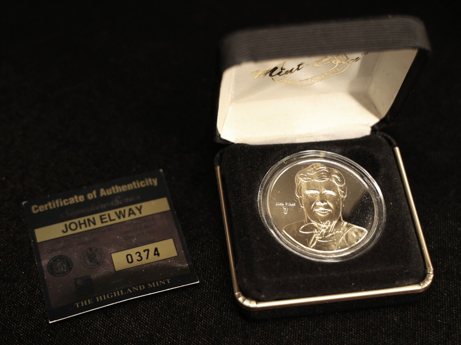 For sale is a John Elway #7 Broncos Football 1 oz .999 Pure Silver Round Highland Mint #0374. View pictures for details and condition, the coin pictured is the exact coin you will receive. Feel free to contact us with any questions.